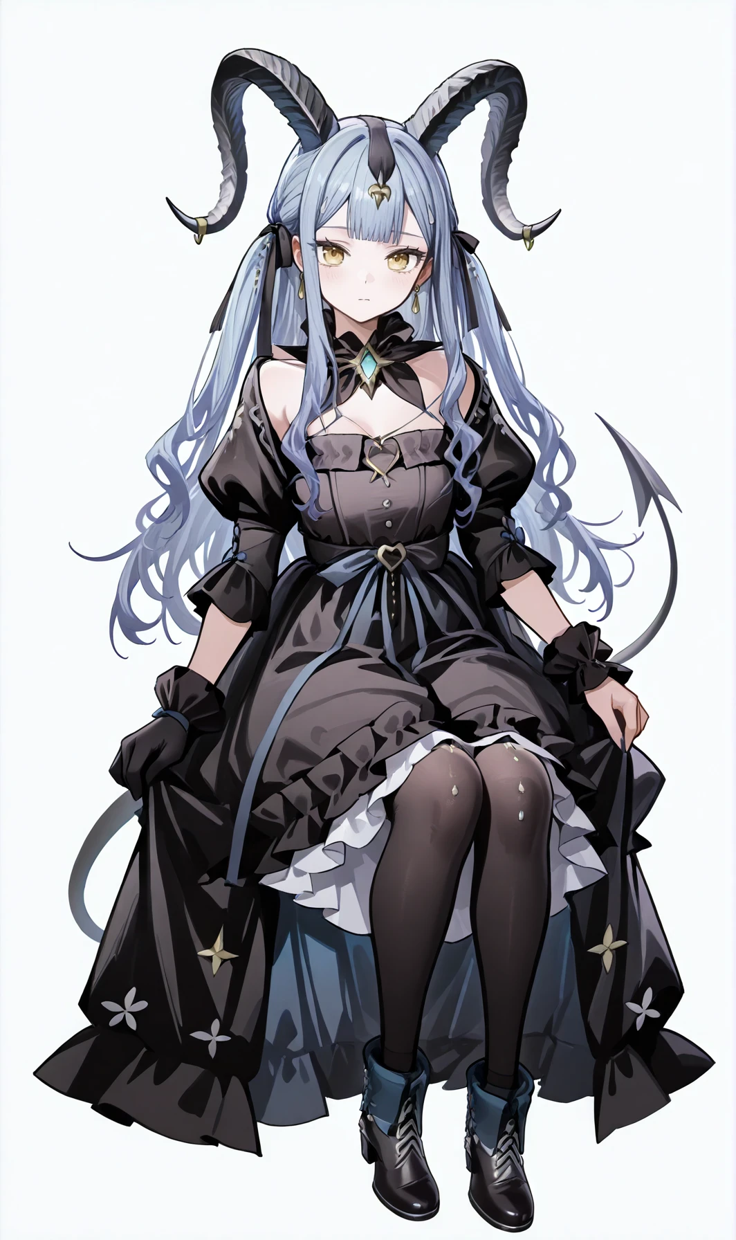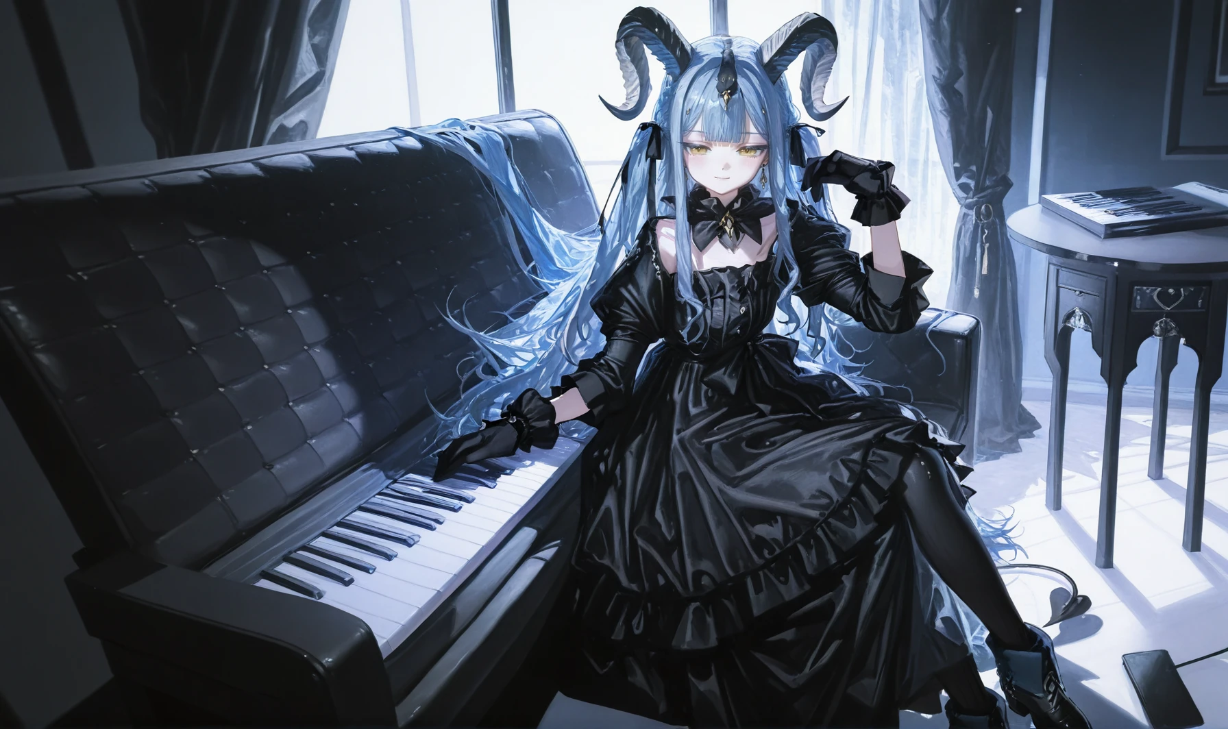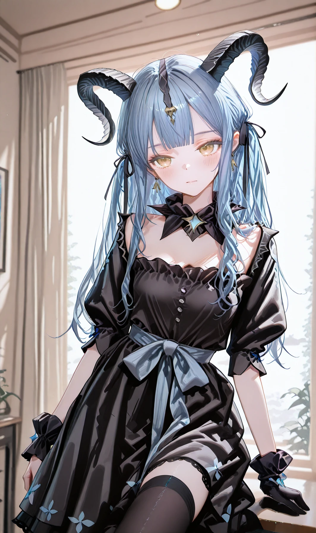 sakikoarknights,curled horns,blue hair,blunt bangs,two side up,earrings,hair ribbon,very long hair,yellow eyes,hair ornament,demon tail,