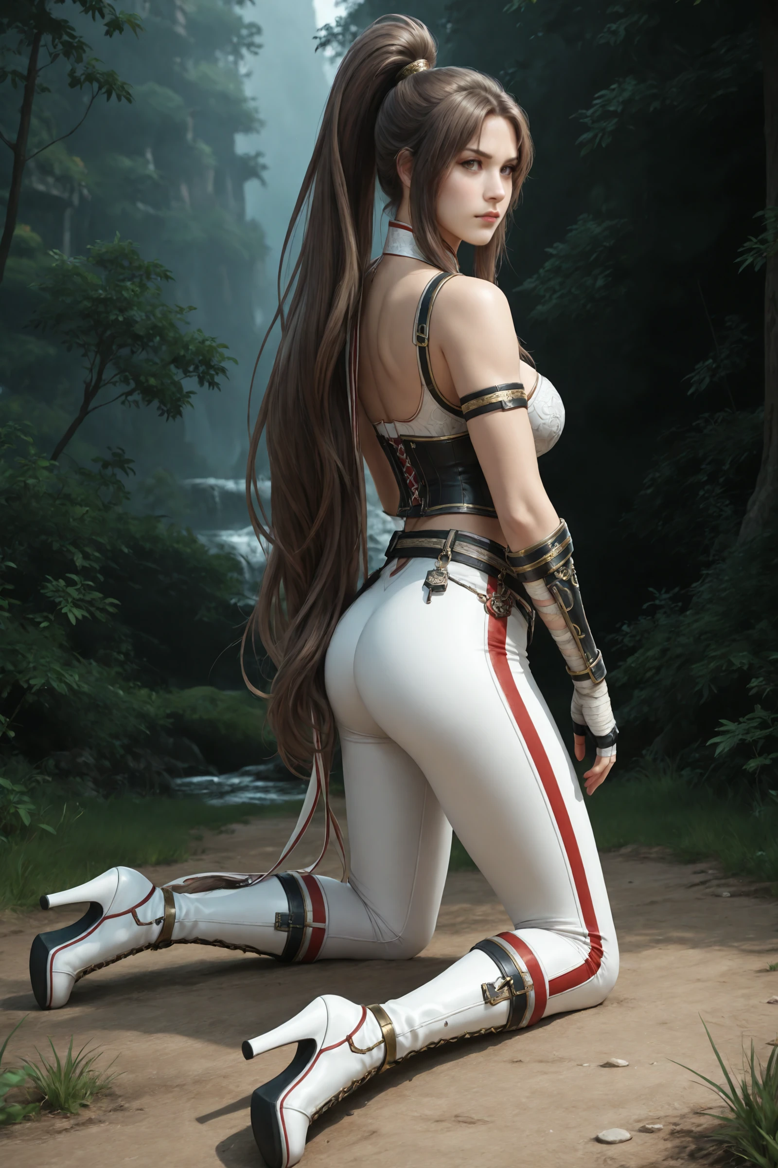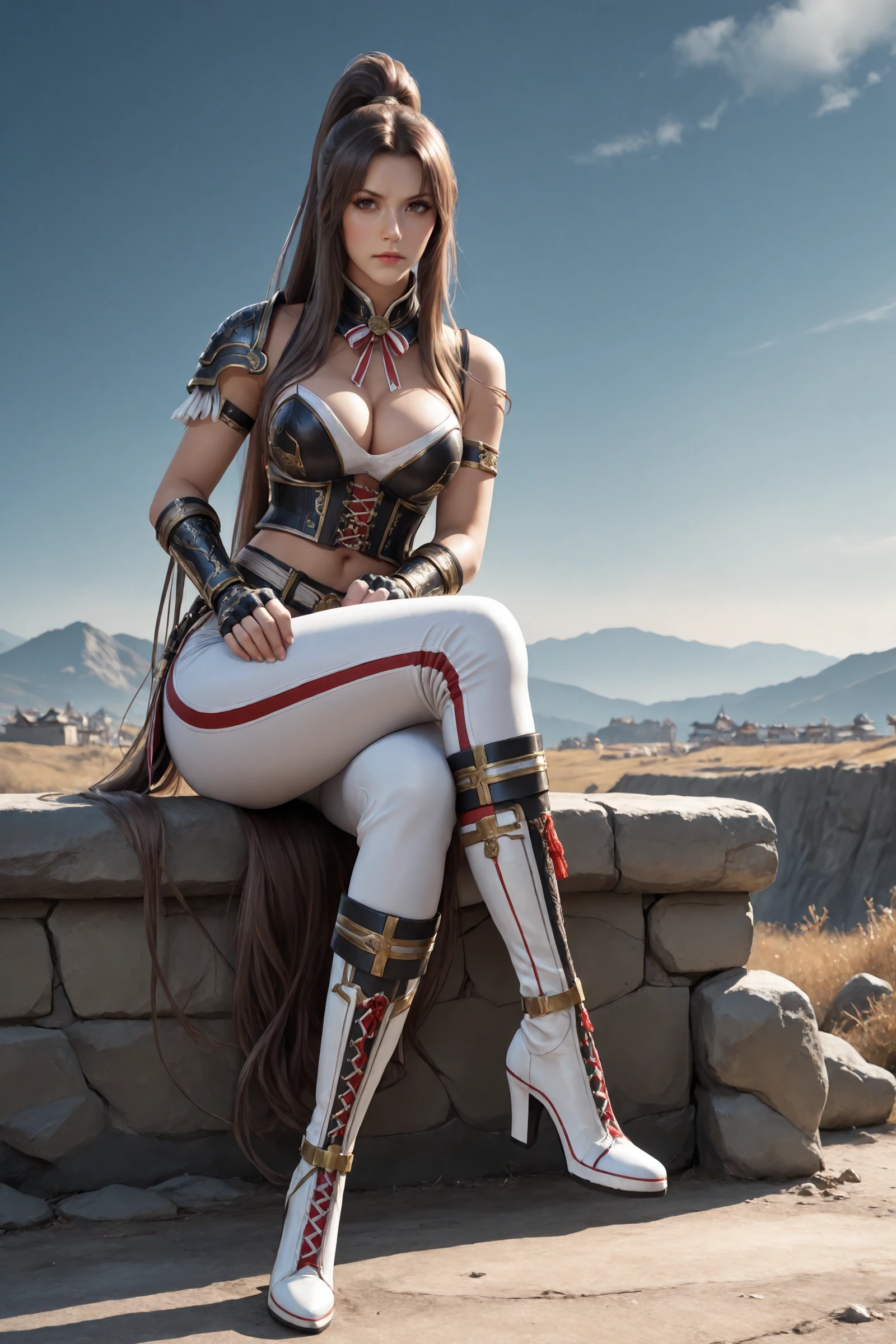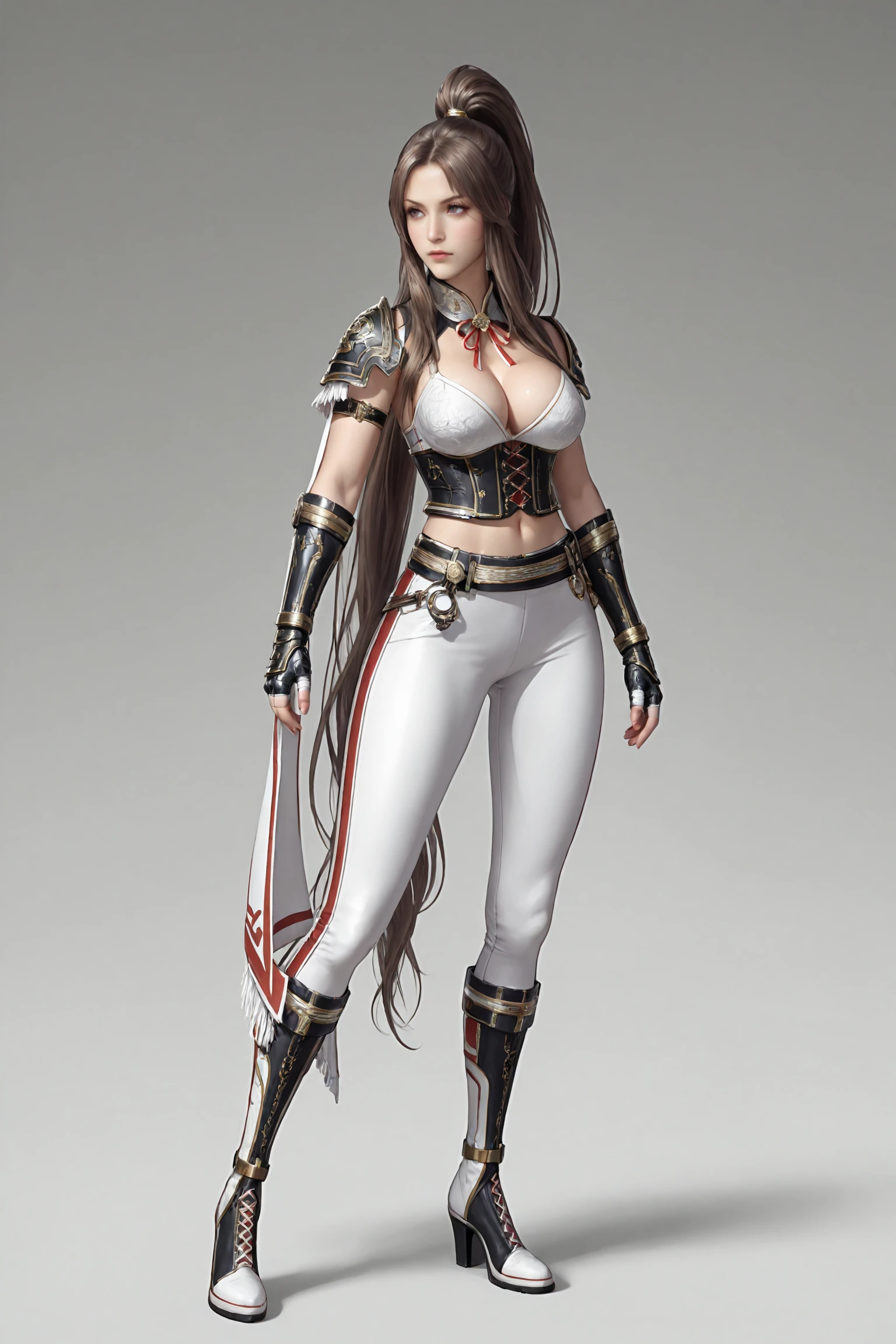 very_long_hair,brown_hair,parted_bangs,long_ponytail, large_breasts,navel,cleavage,midriff,high_collar,neck_ribbon,bandages, shoulder_armor,armlet,corset,gauntlets,fingerless_gloves,belt,tight_pants, cross-laced_footwear,knee_boots,high_heels,
