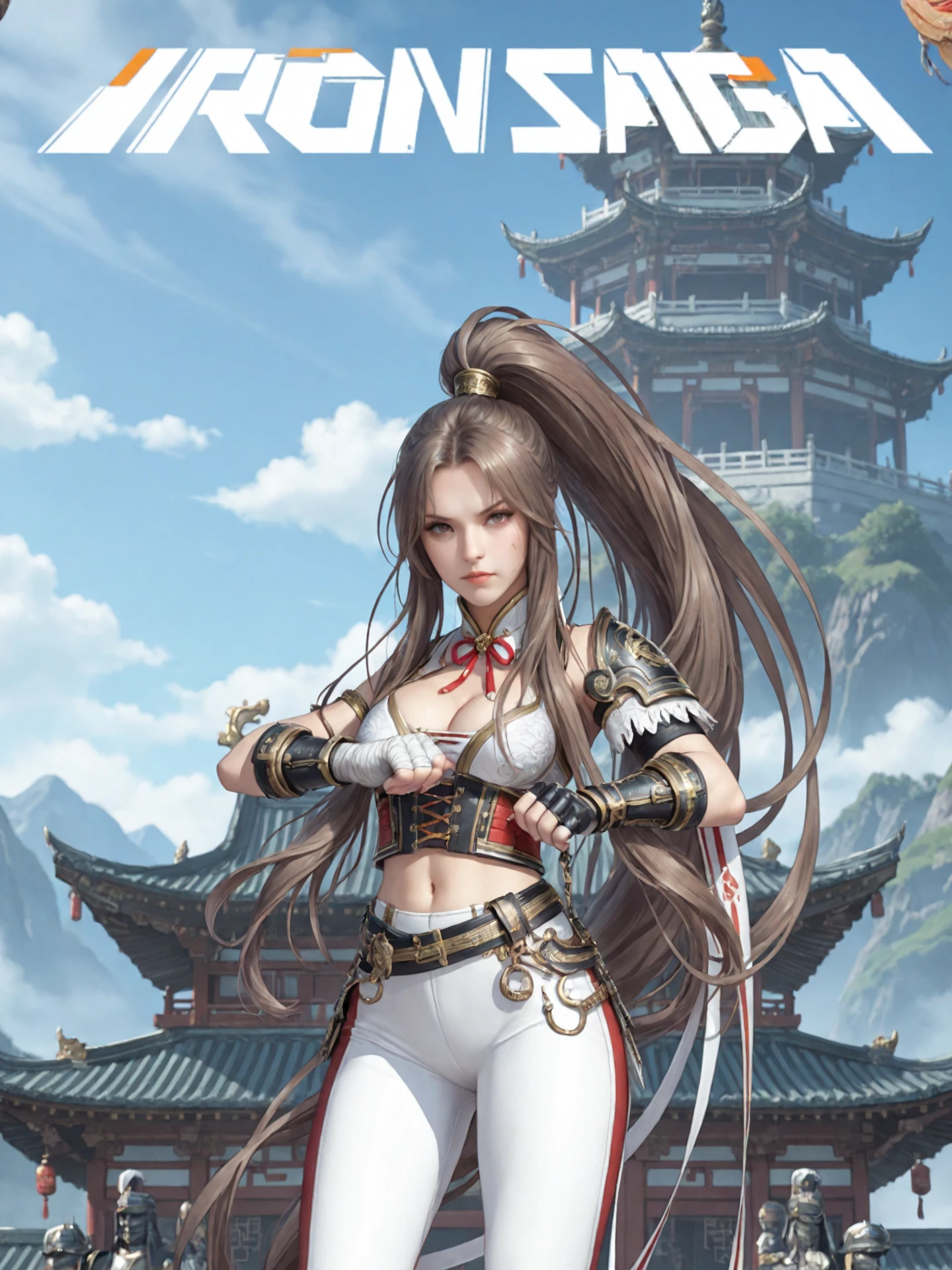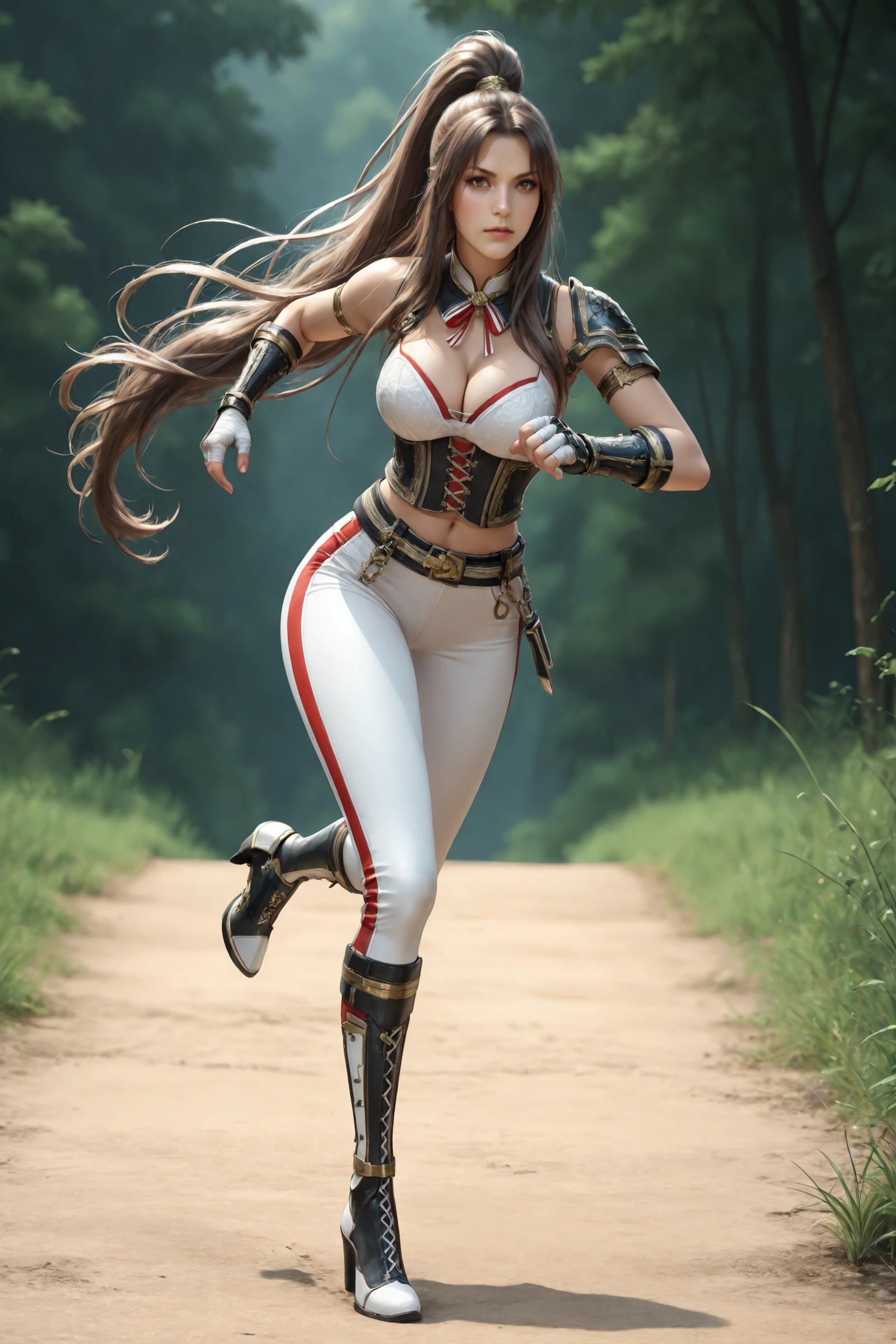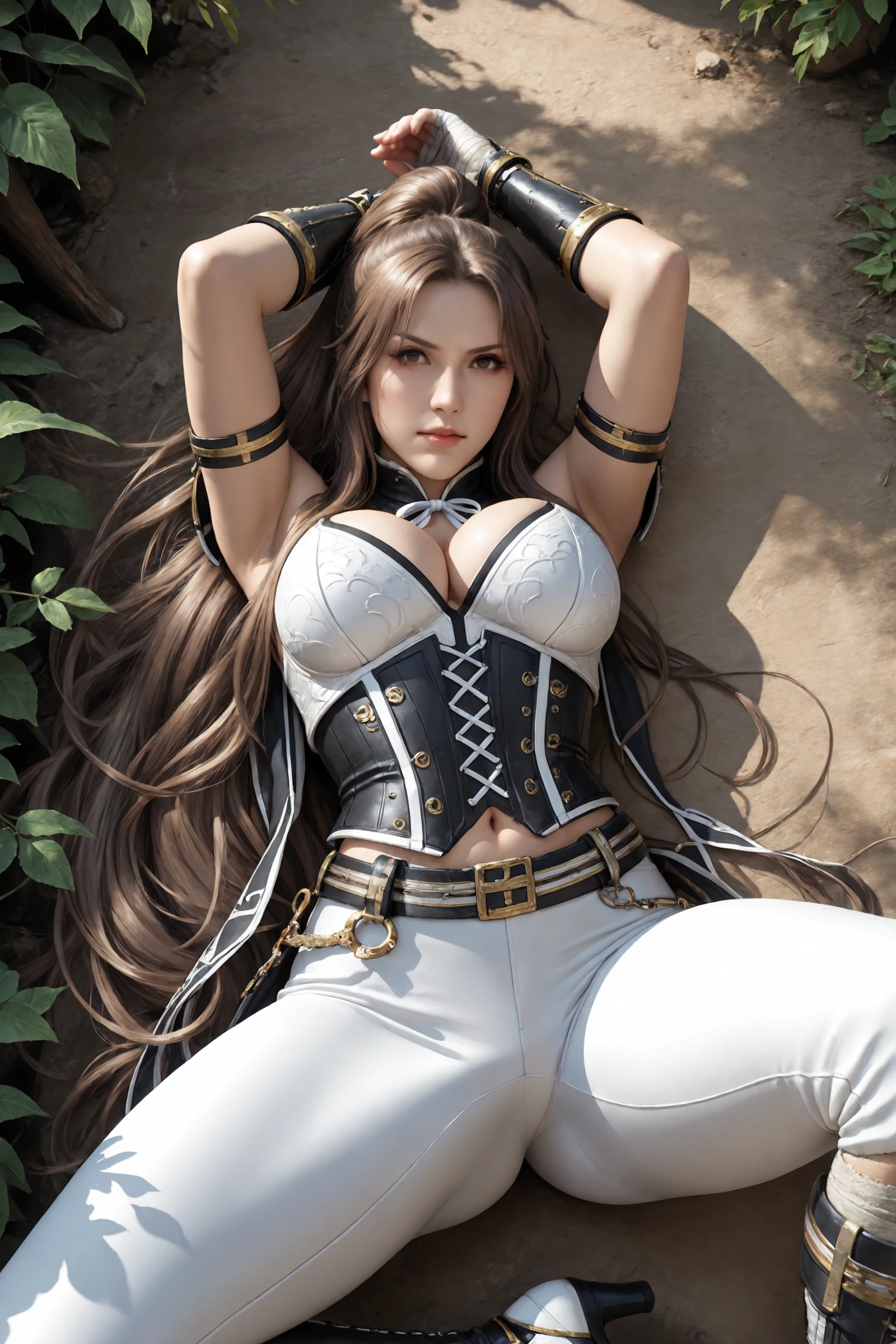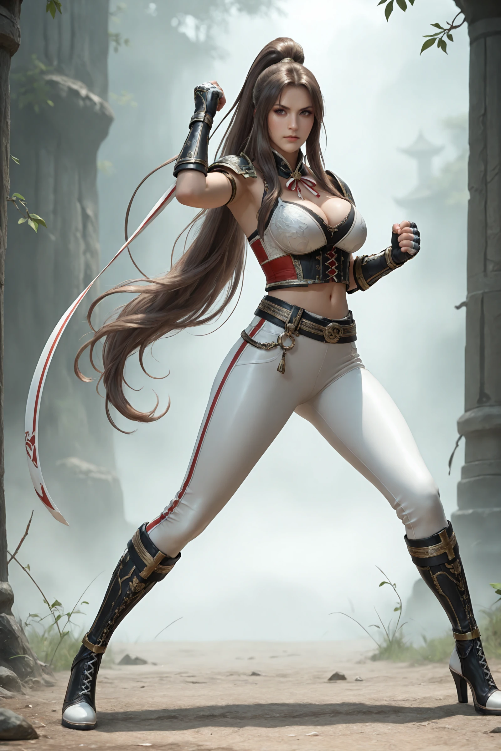 very_long_hair,brown_hair,parted_bangs,long_ponytail, large_breasts,navel,cleavage,midriff,high_collar,neck_ribbon,bandages, shoulder_armor,armlet,corset,gauntlets,fingerless_gloves,belt,tight_pants, cross-laced_footwear,knee_boots,high_heels,
