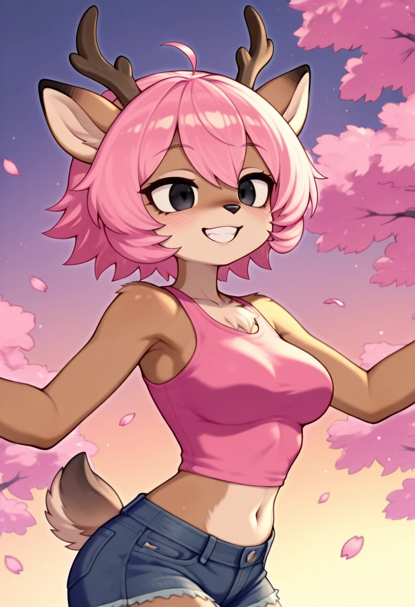 zzSakurastag, 1girl, solo, ???????, short hair, animal ears, ??????????????, navel, tail, pink hair, shorts, midriff, black eyes, crop top, short shorts, tank top, denim, furry, denim shorts, furry female, antlers, deer ears