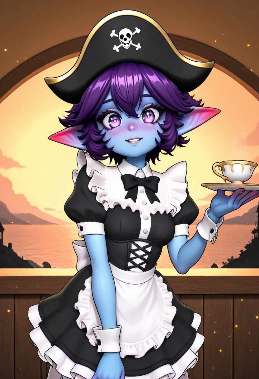 zzBrinecap, 1girl, solo, ???????, short hair, bangs, thighhighs, hat, dress, bow, purple eyes, purple hair, short sleeves, frills, puffy sleeves, shiny, bowtie, medium hair, apron, shiny hair, puffy short sleeves, gradient, wrist cuffs, maid, black headwear, black bow, colored skin, black bowtie, enmaided, blue skin, pirate hat, yordle, gradient skin, pointy ears