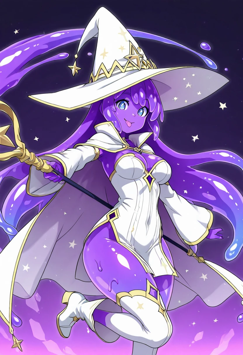 zzPlumhex, 1girl, solo, long hair, bangs, blue eyes, long sleeves, hat, very long hair, purple hair, boots, star (symbol), cape, see-through, witch hat, colored skin, white headwear, white footwear, monster girl, staff, pelvic curtain, purple skin, slime girl, see-through dress