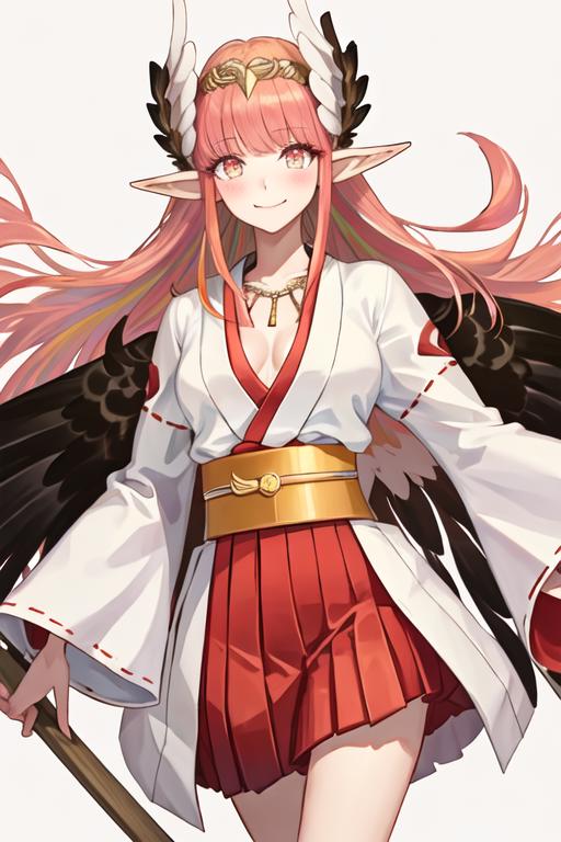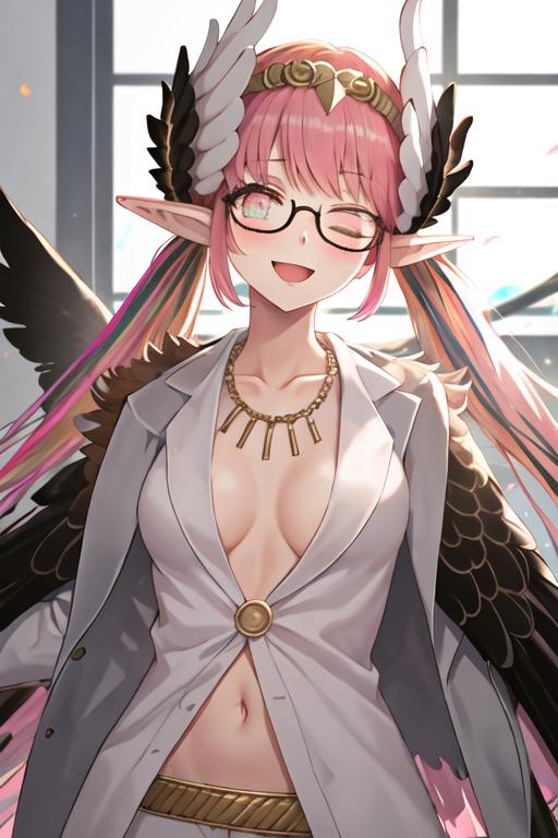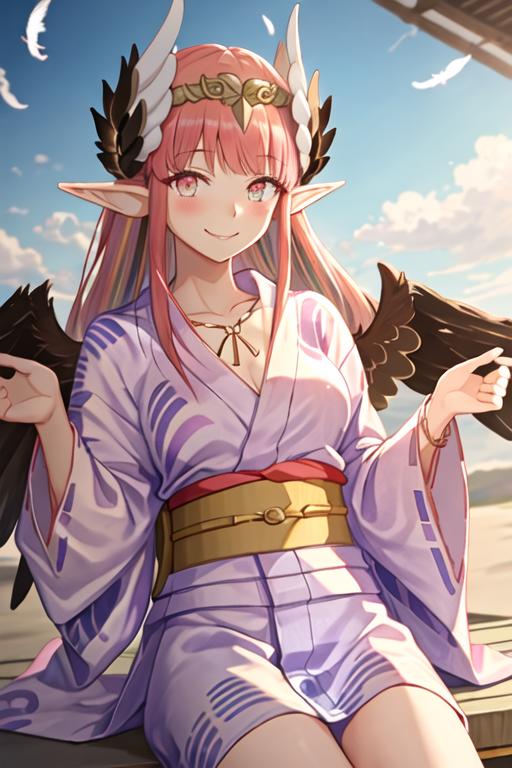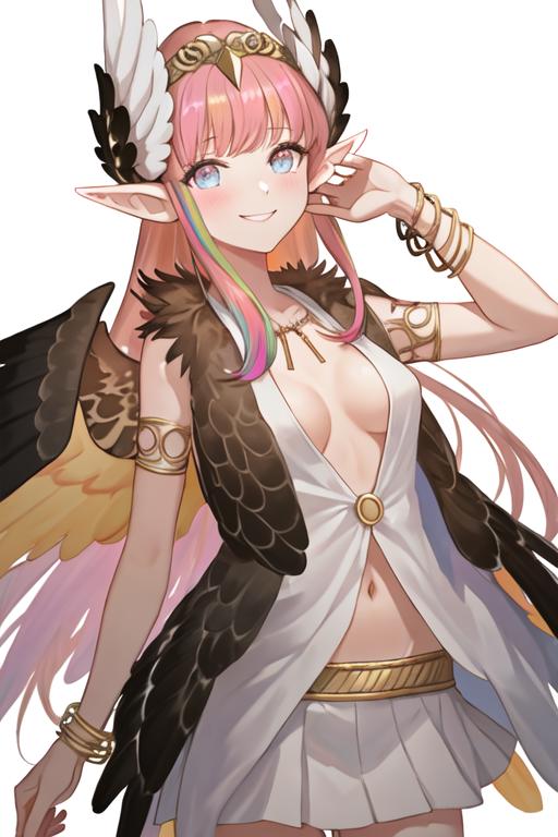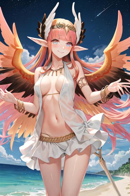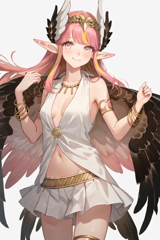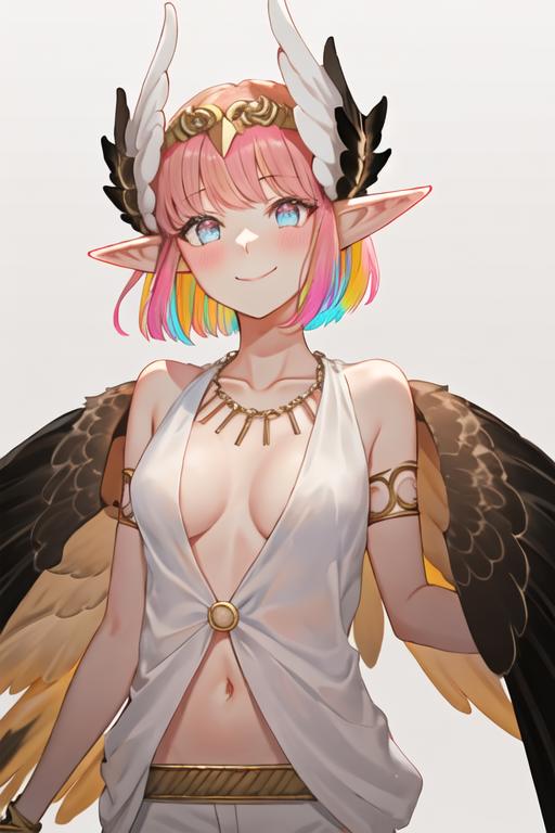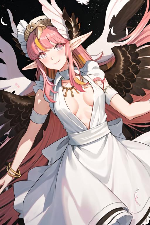 The trigger word is circe_fgo, and the recommended tags are best quality, masterpiece, highres, solo, {circe_fgo:1.15}, pointy_ears, pink_hair, head_wings, wings, bangs, feathered_wings, long_hair, jewelry, smile, breasts, necklace, blush, small_breasts, multicolored_eyes.