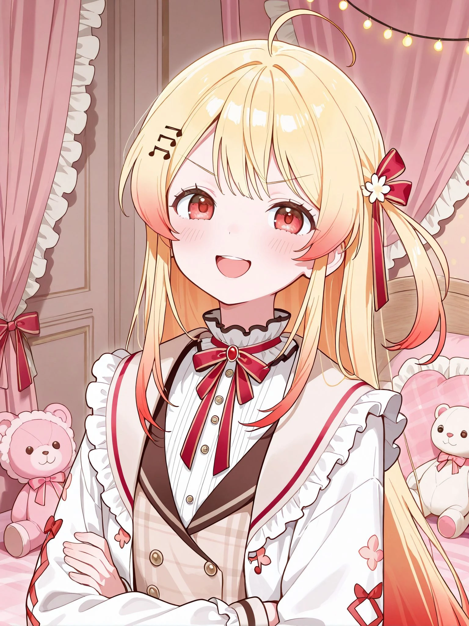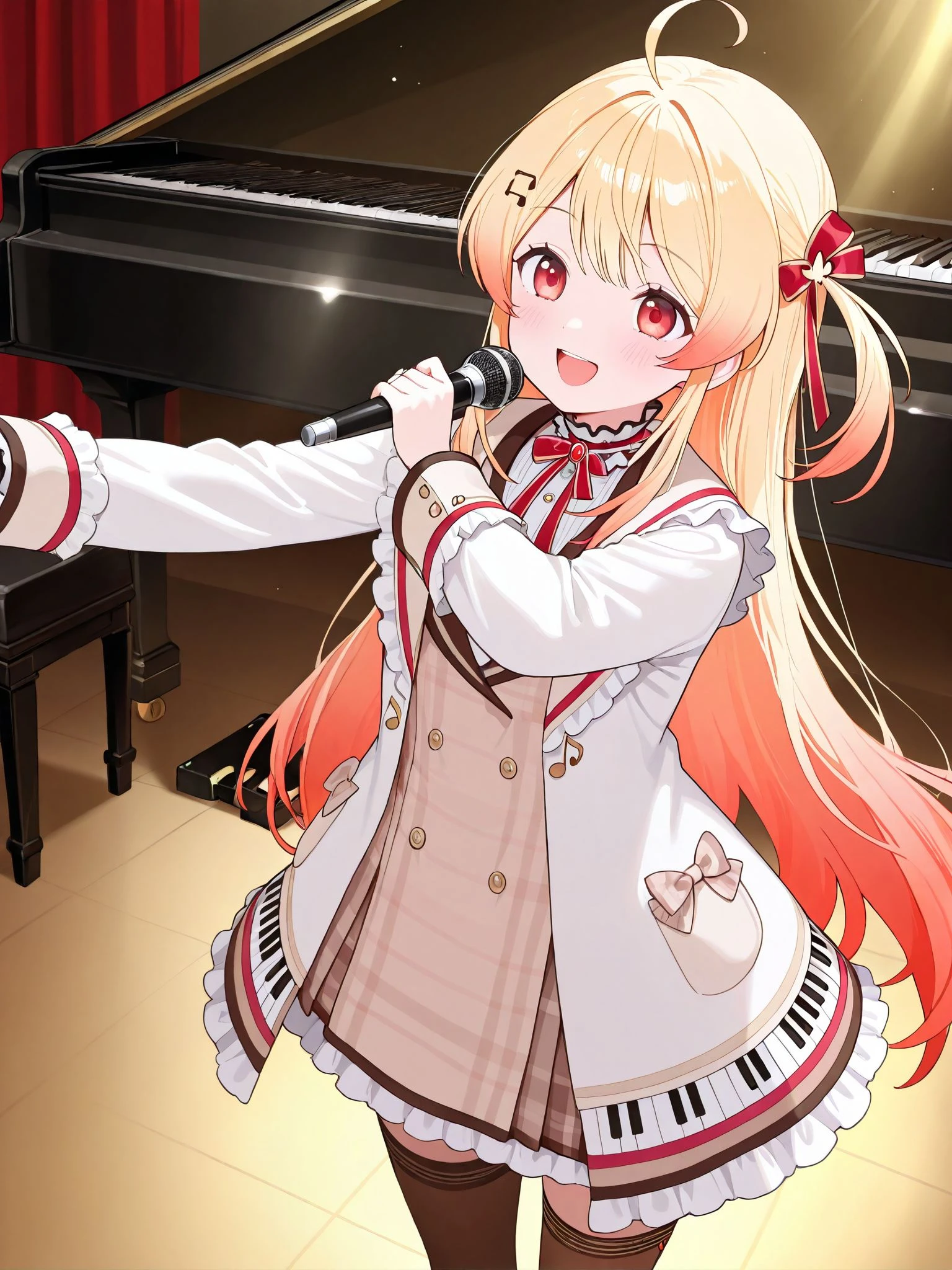 holo kanade cosplay, default outfit, londe hair, long hair, side ponytail, gradient hair, orange hair tips, ahoge, music note hair clip, red hair ribbon, red eyes, blush, red choker, frilled choker, red ribbon neck tie, ring on ribbon, white frilled jacket, long sleeves, music note embroidery on jacket, bow on jacket pocket, brown double-breasted vest, plaid dress, plaid skirt, piano key print at hem, frilled hem, brown thighhighs, bass clef on thighhighs, cream shoes, red bow on shoes,