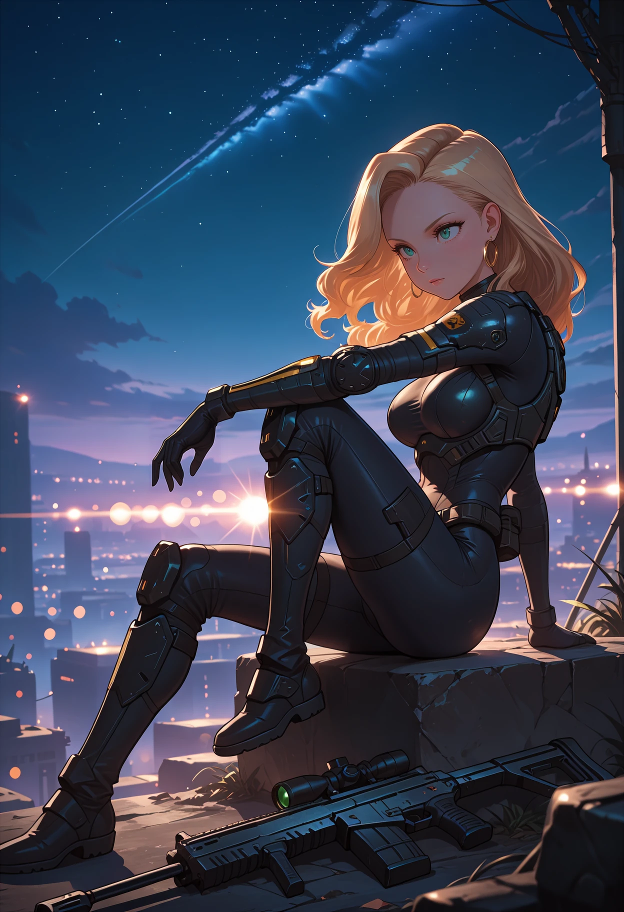 clairsag, green eyes, blonde hair, long hair, hoop earrings, huge breasts, pink o-ring bikini, strapless bikini,