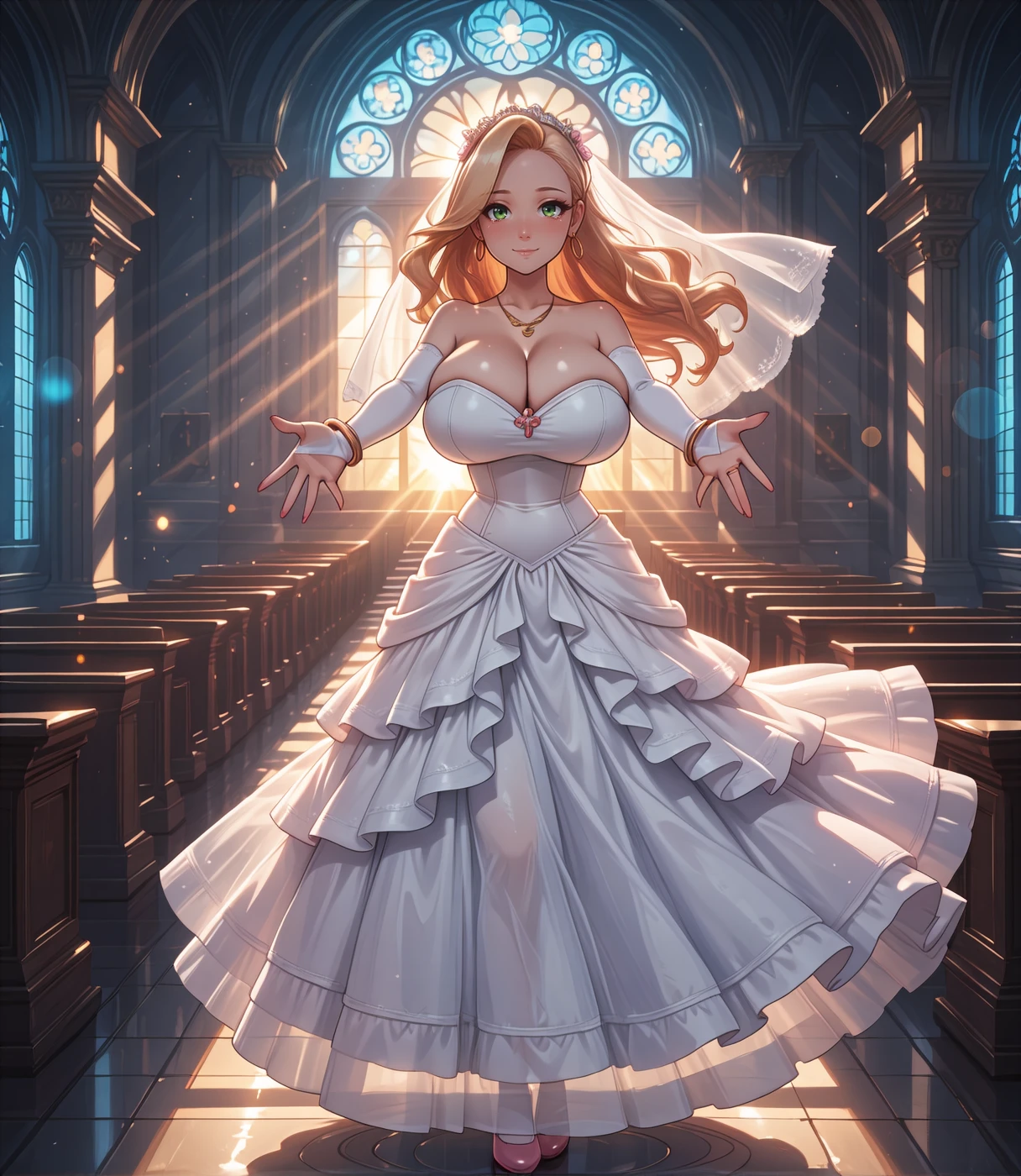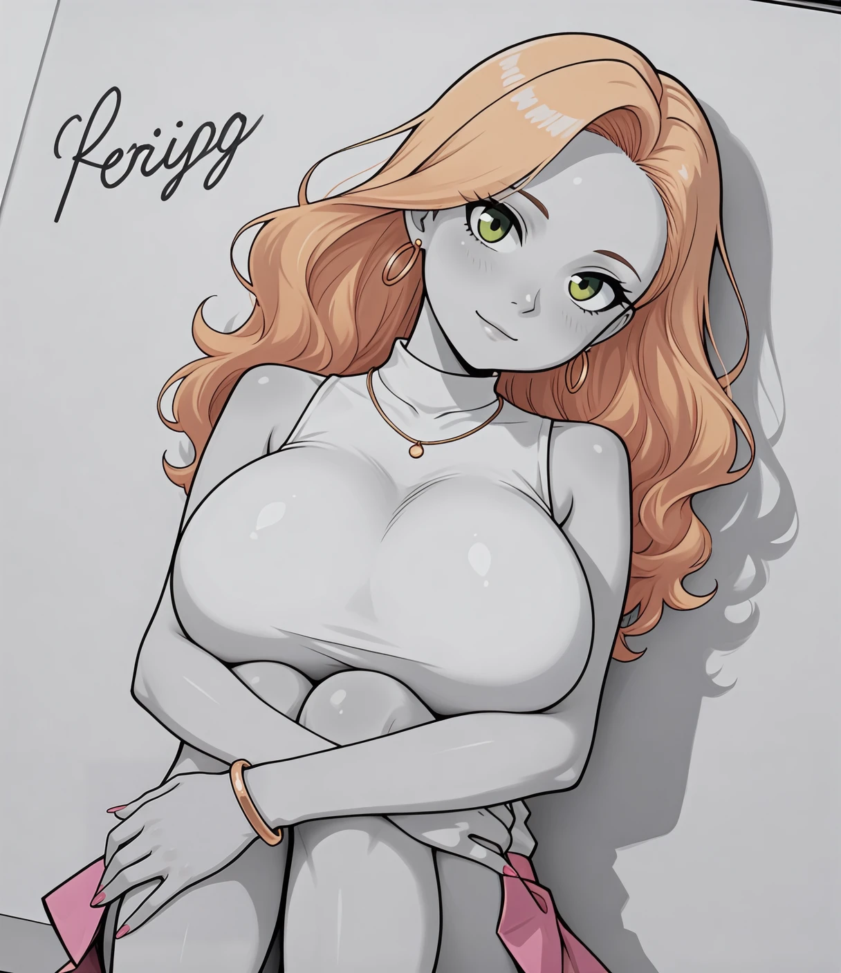 clairsag, green eyes, blonde hair, long hair, hoop earrings, huge breasts, bracelet, necklace, pink nails,white sleeveless shirt, collared shirt, pink miniskirt,