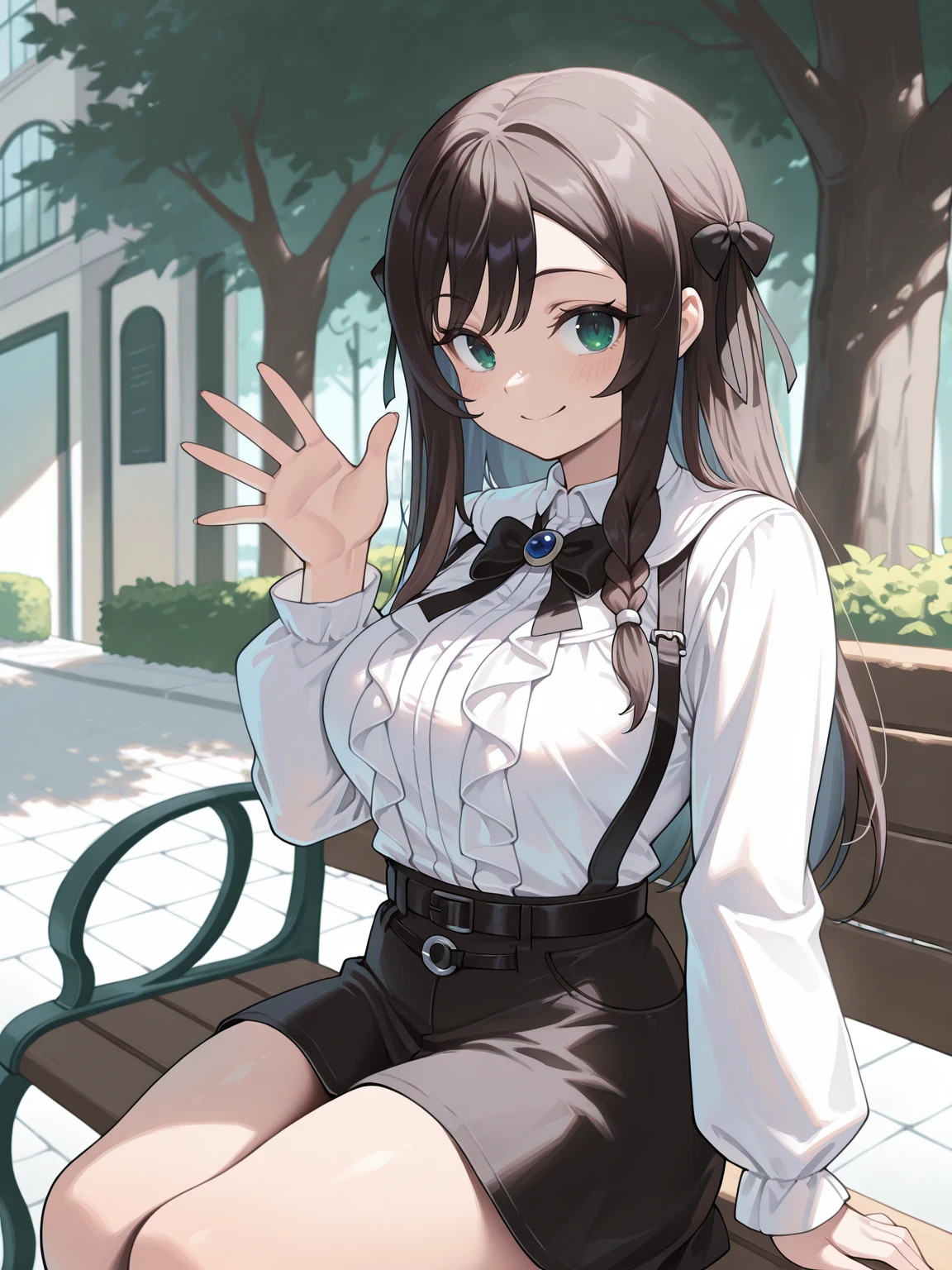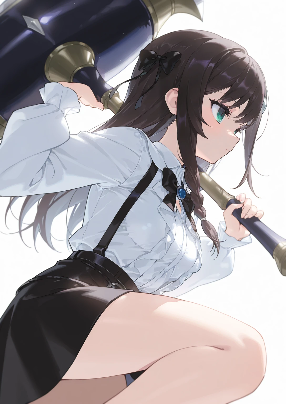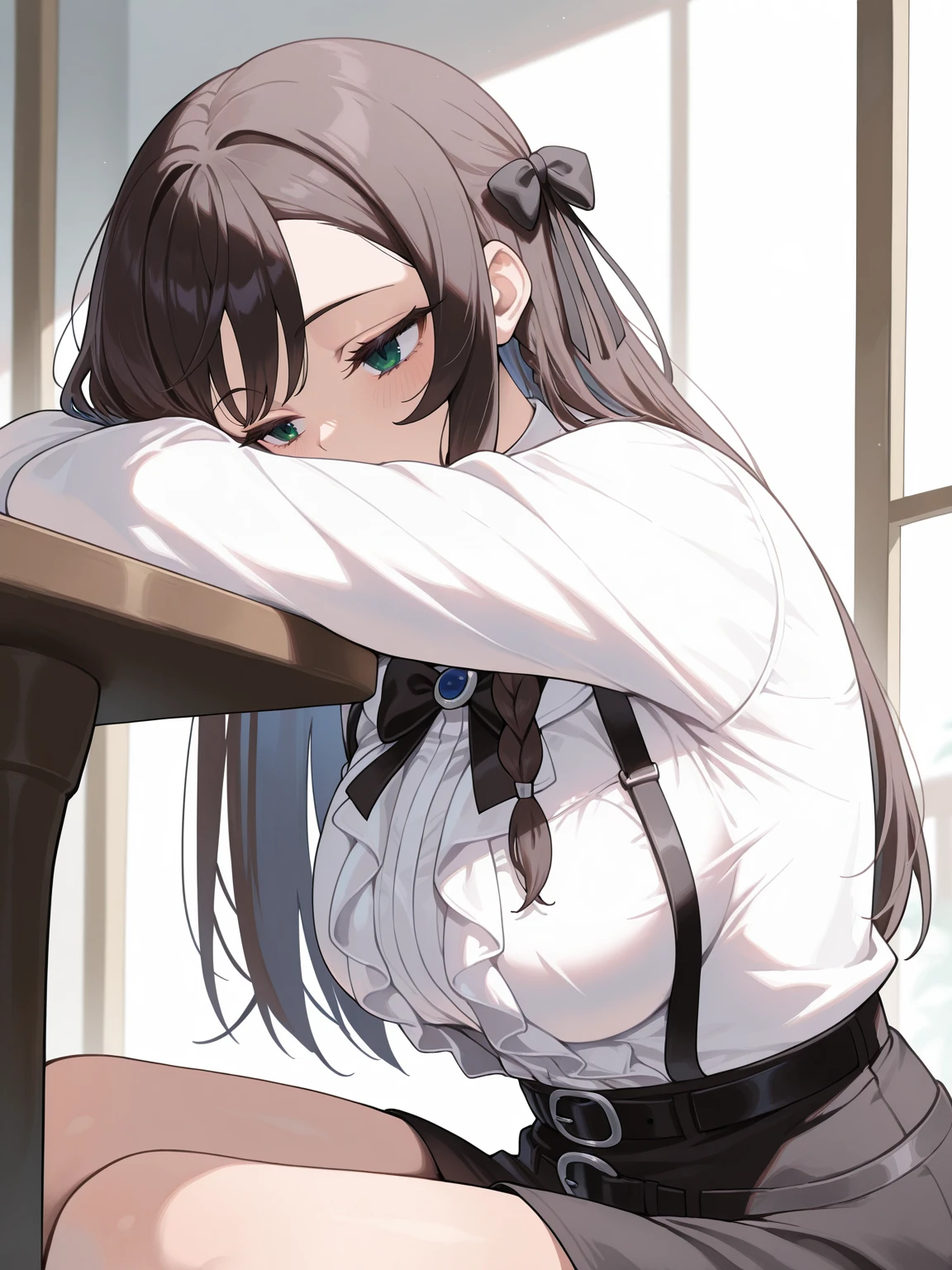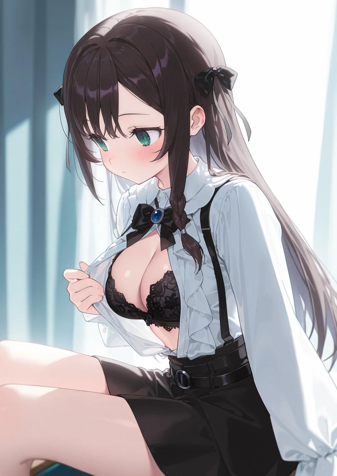 Apperance: ilalina, black hair, green eyes, long hair, single sidelock, hair bow, braid, medium breasts