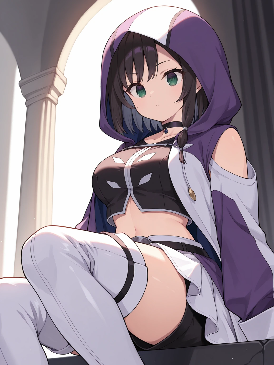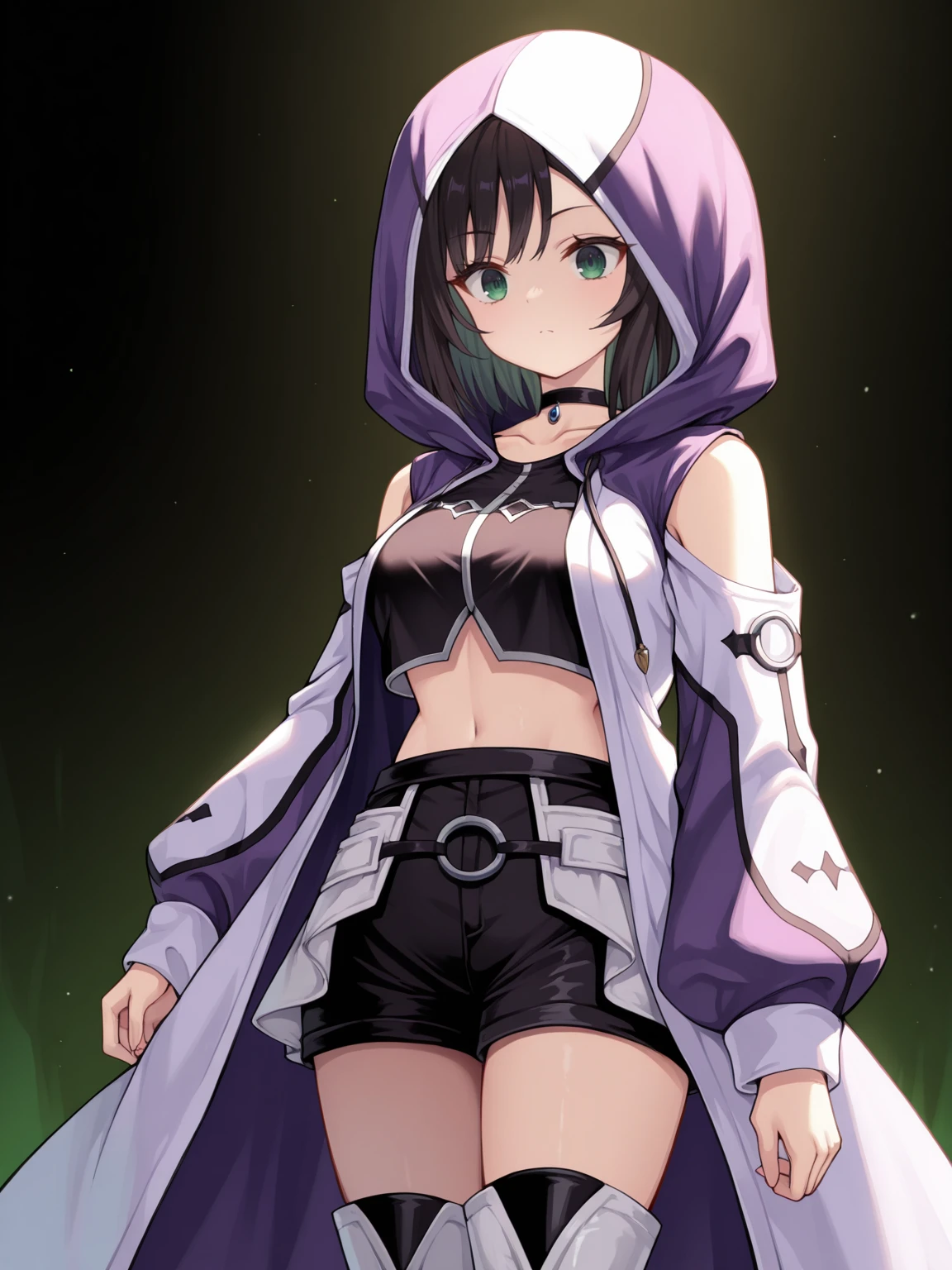 Adventurer: hooded coat, multicolored coat, purple coat, white coat, shoulder cutout, black vest, crop top, choker, black shorts, white frontless skirt, front-tied skirt, thigh boots, white boots, black gloves