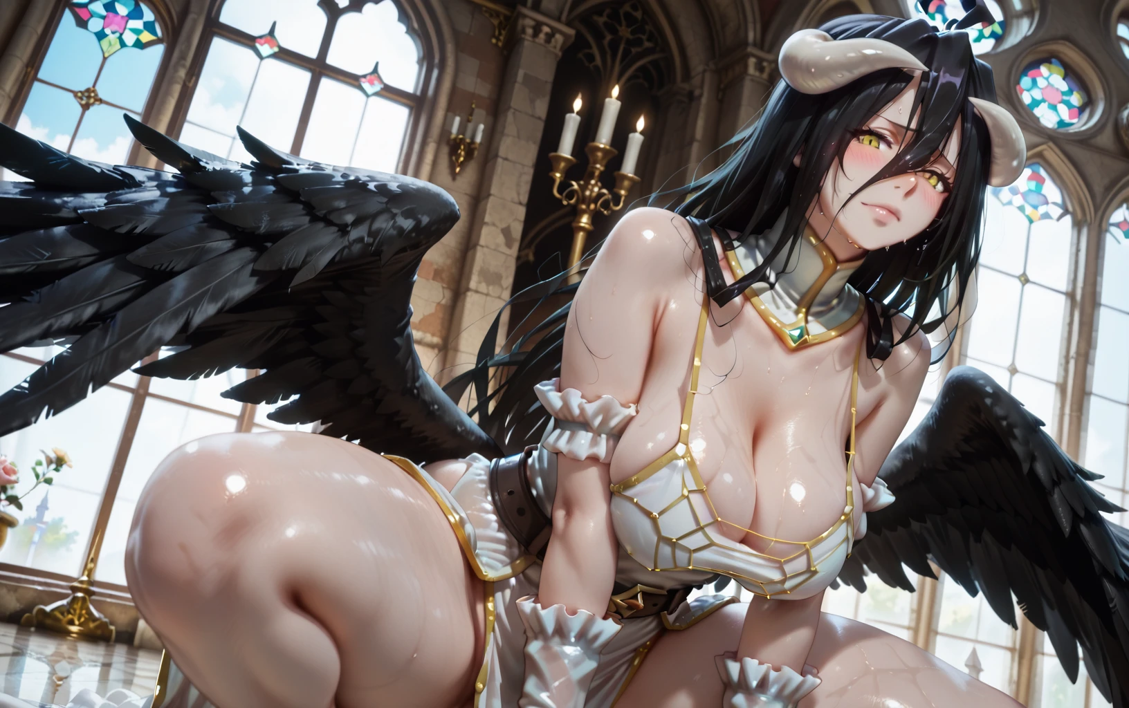 ilalbedo, 1girl, breasts, albedo \(overlord\), black wings, solo, low wings, black hair, thighs, long hair, gloves, demon horns, yellow eyes, white gloves, looking at viewer, cleavage, white horns, bare shoulders, dress, hair between eyes, large breasts, blush, ahoge, belt, detached collar, white dress, black feathers, CHURCH, <lora:illustrious- Succubus Albedo-1024X1024:1>, spread legs