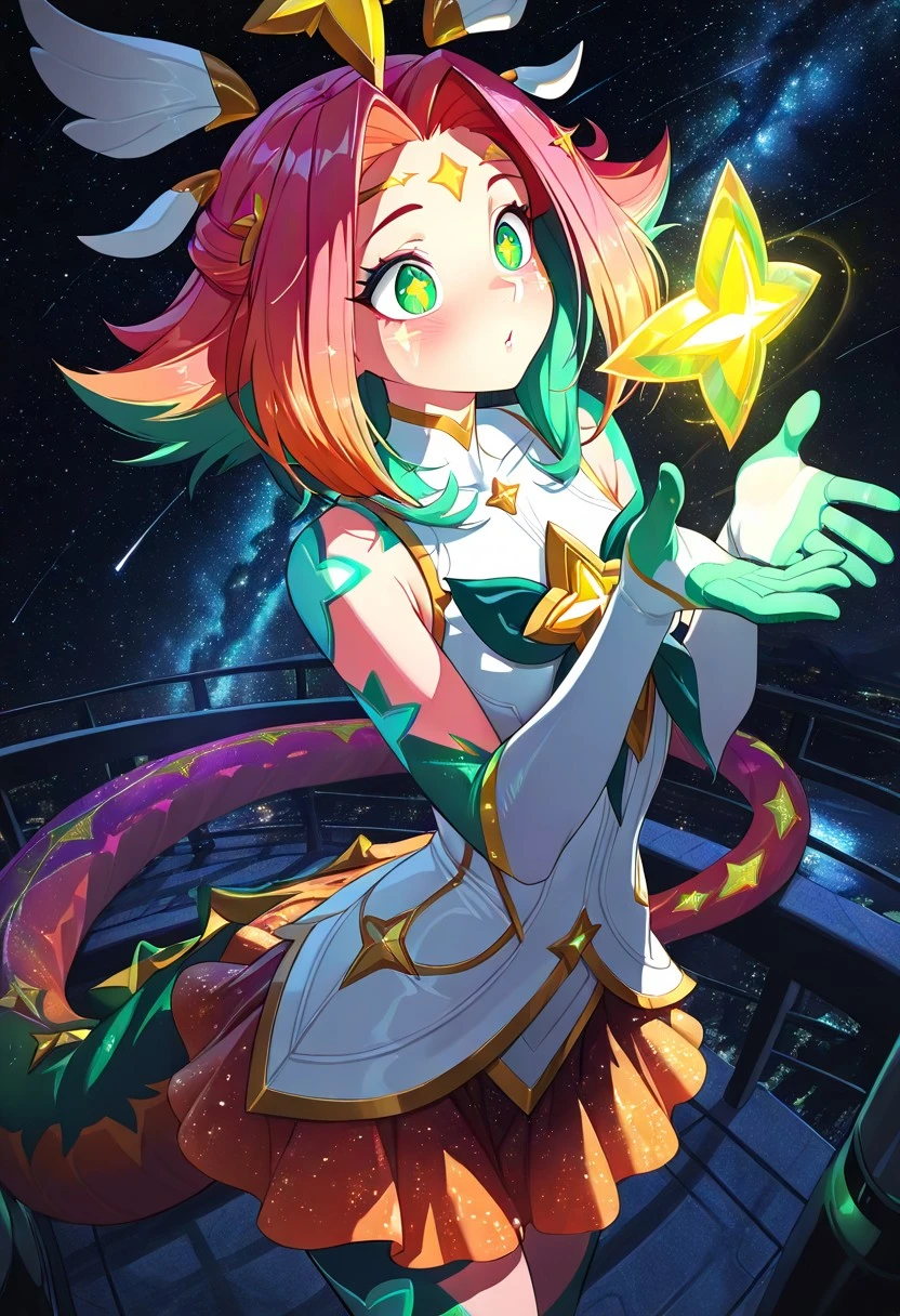 SGneeko,green eyes,starry eyes,medium hair,multicolored hair,hair ornament,orange hair,green hair,multicolored dress,sleeveless dress,elbow gloves,skirt,multicolored skin,tail,long tail,