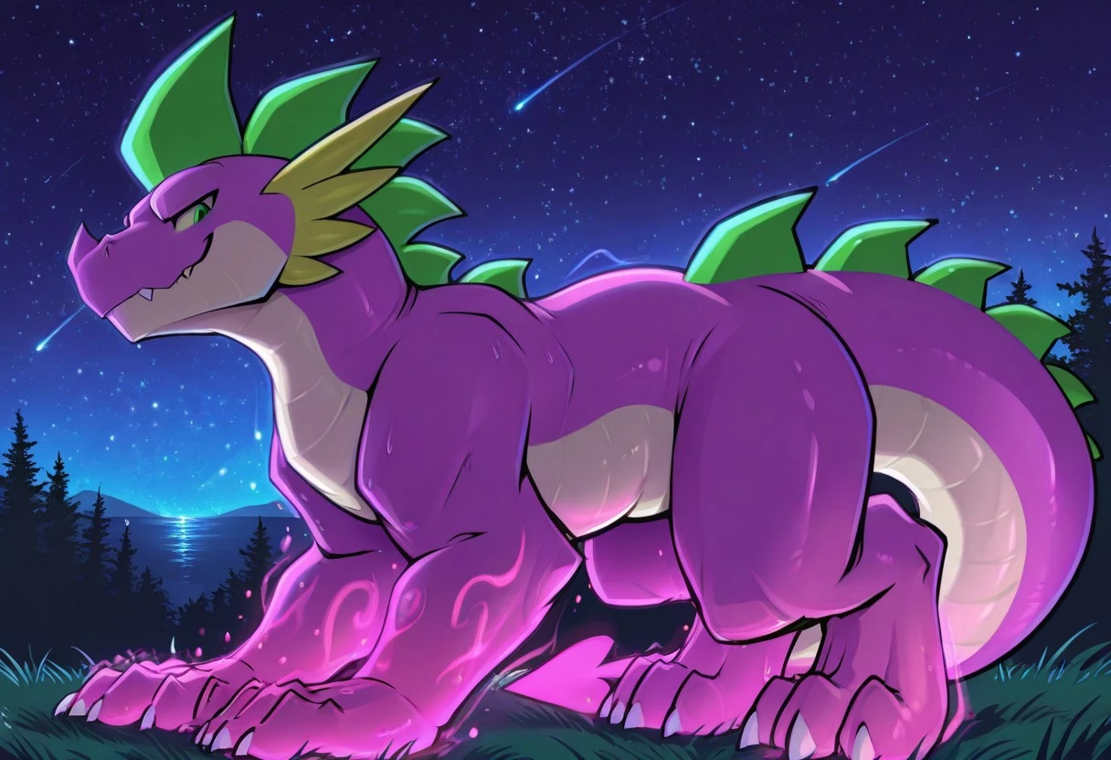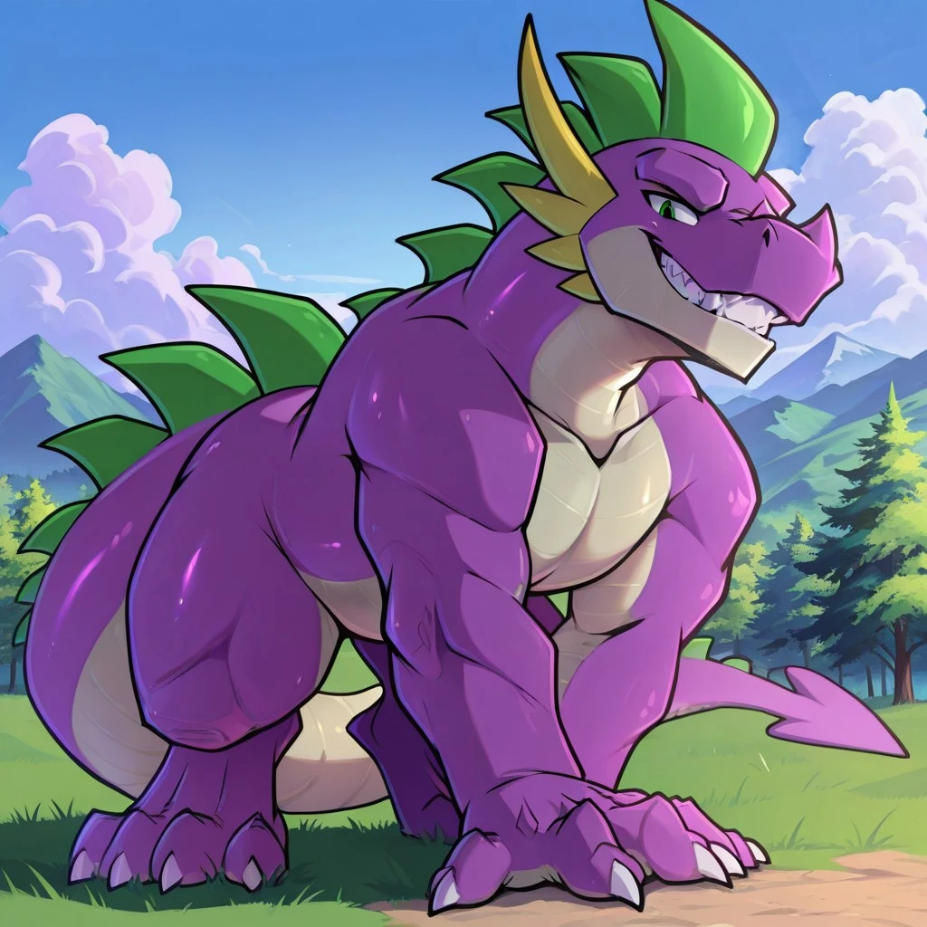 dragon male, purple skin, green eyes, green scutes, sharp teeth, claws, dragon tail