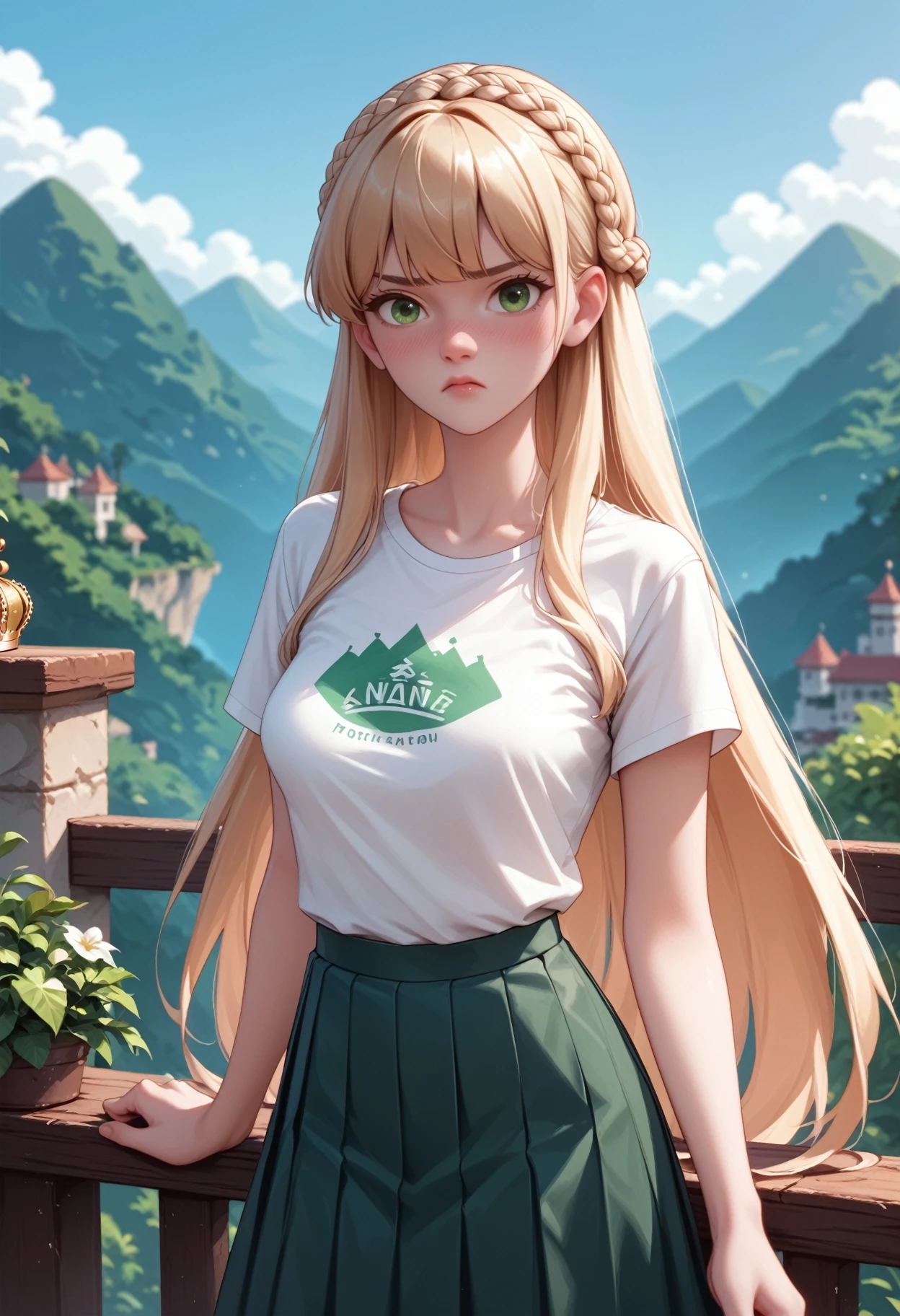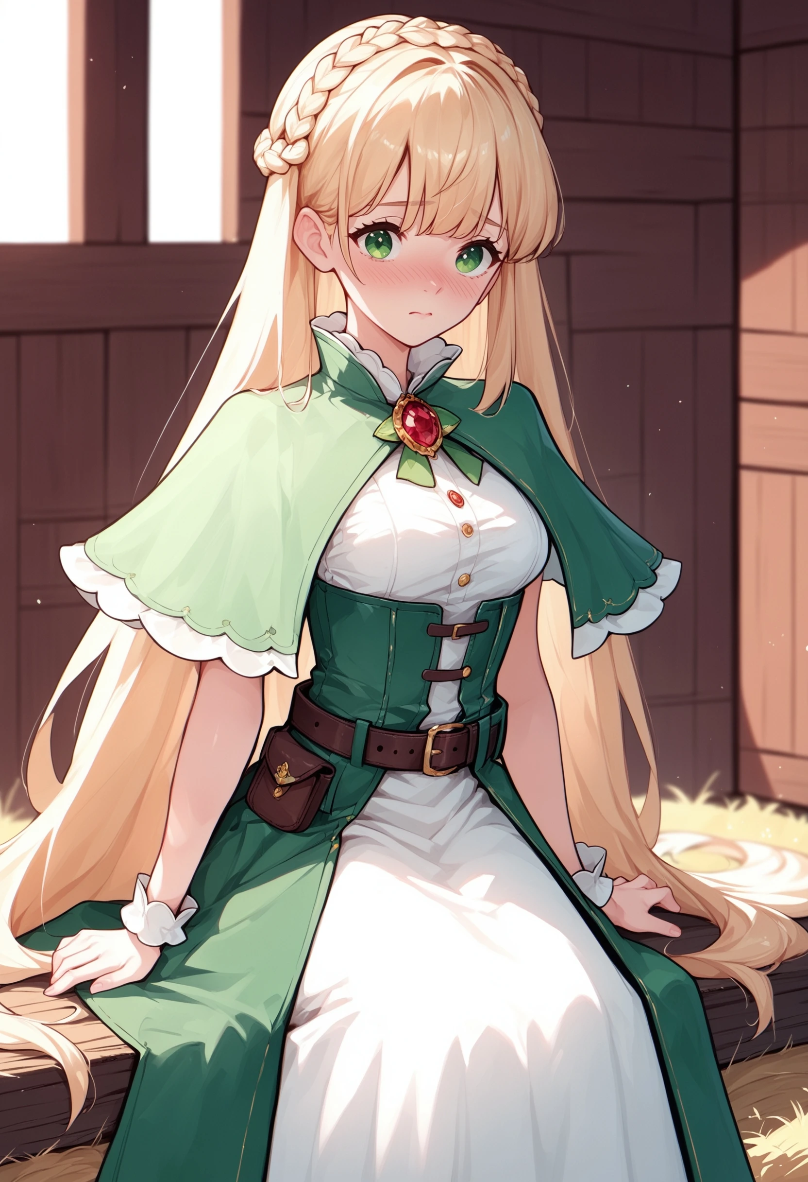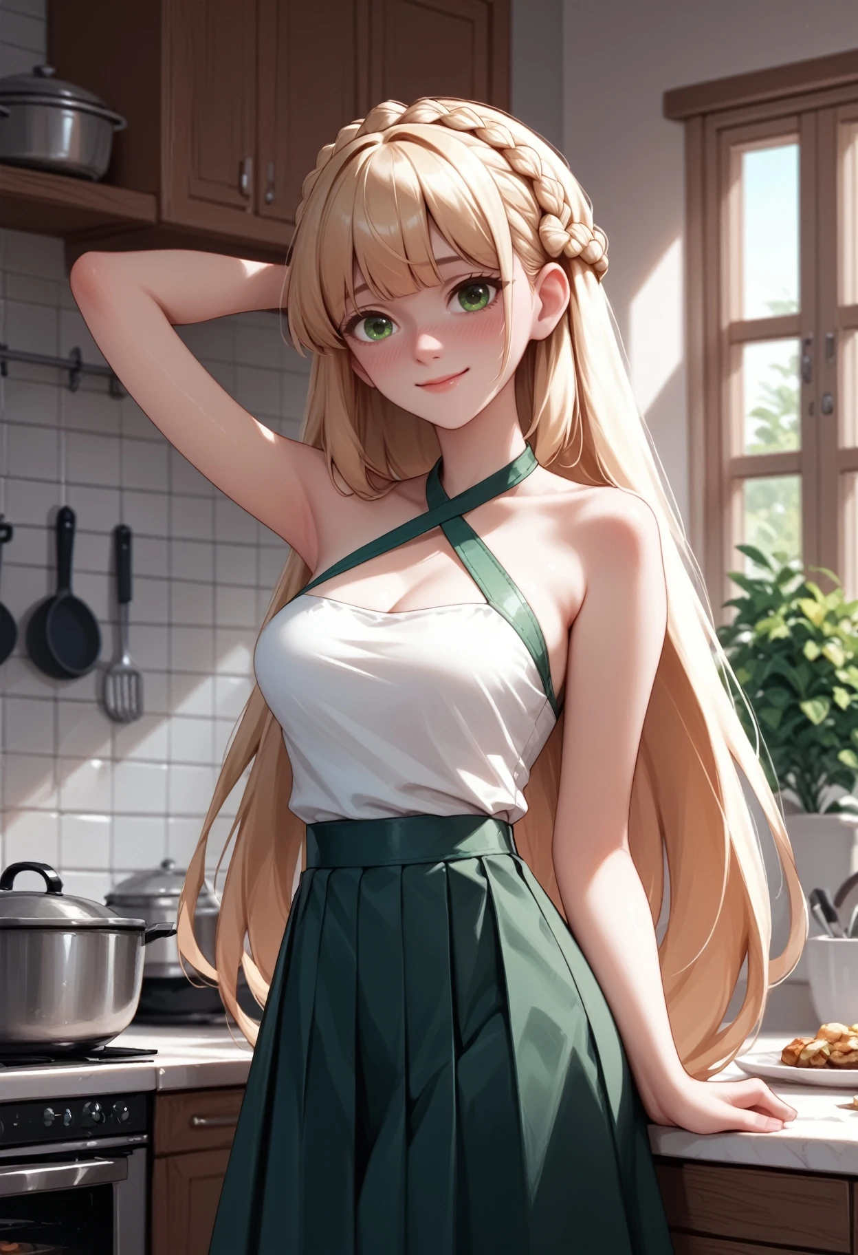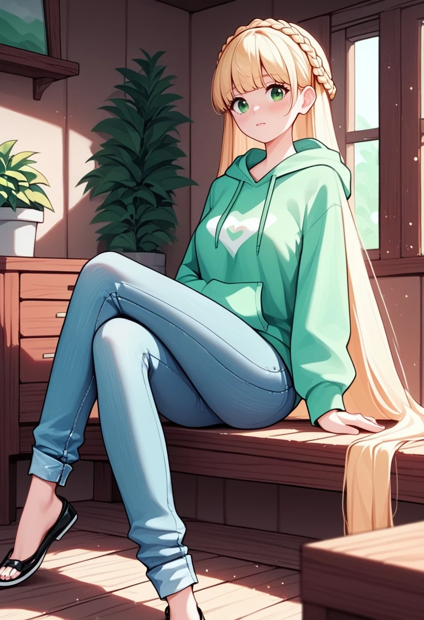 (Positive Prompts) celine, long hair, blonde hair, crown braid, blunt bangs, green eyes,