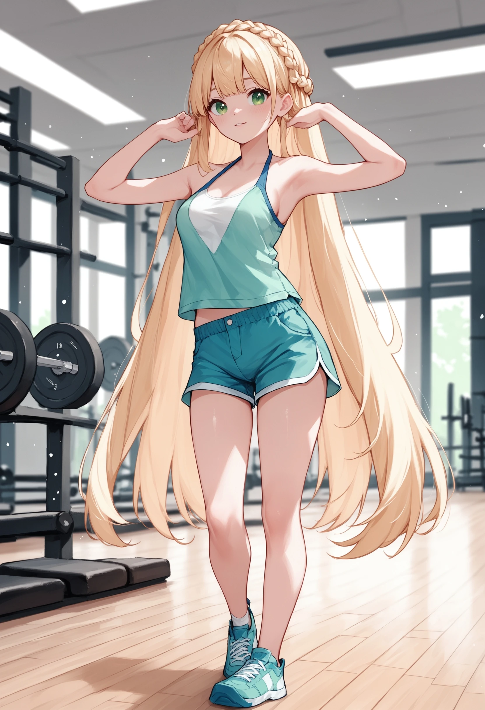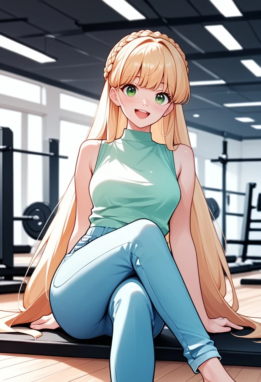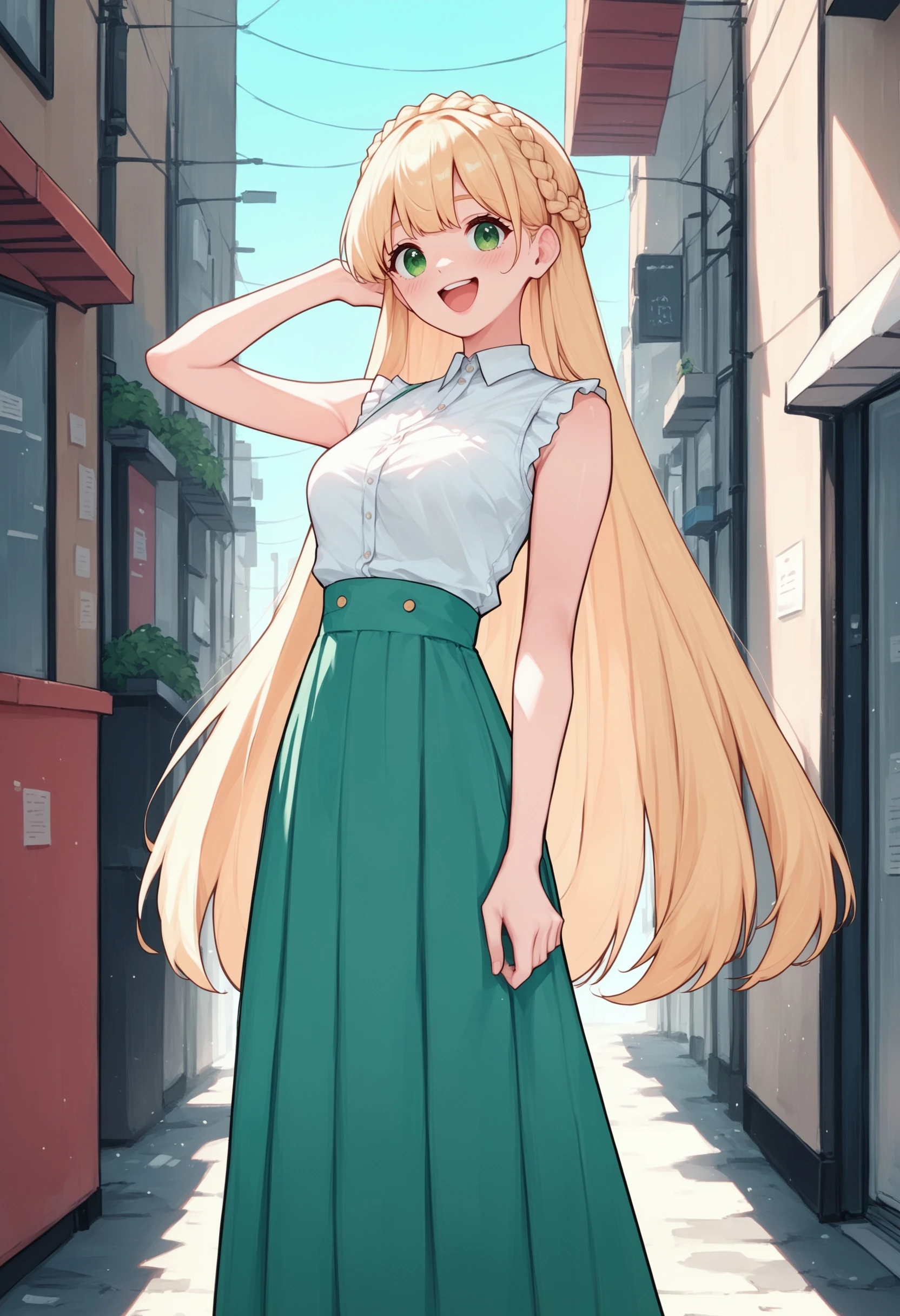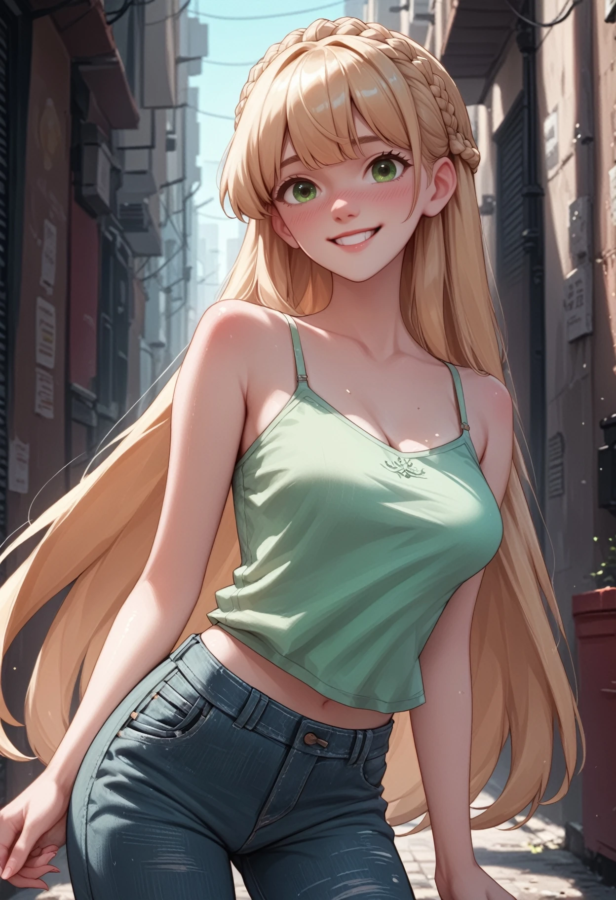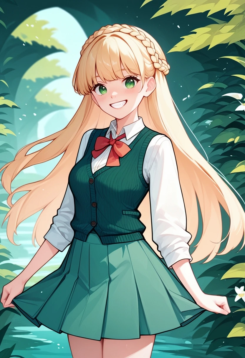 (Positive Prompts) celine, long hair, blonde hair, crown braid, blunt bangs, green eyes,