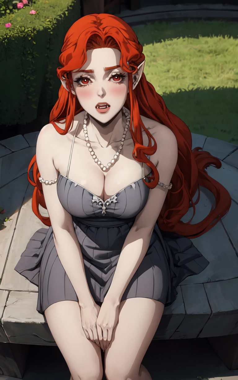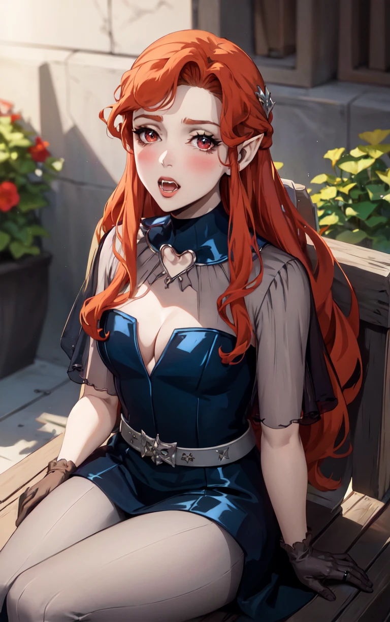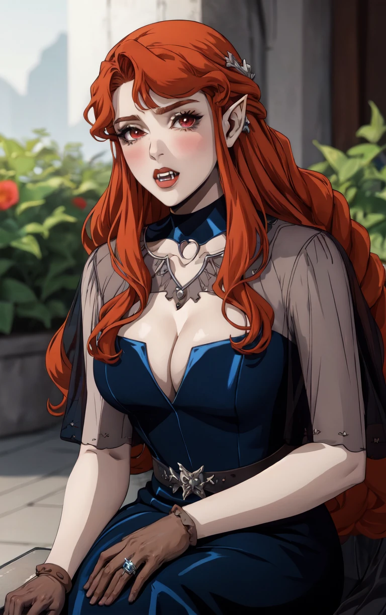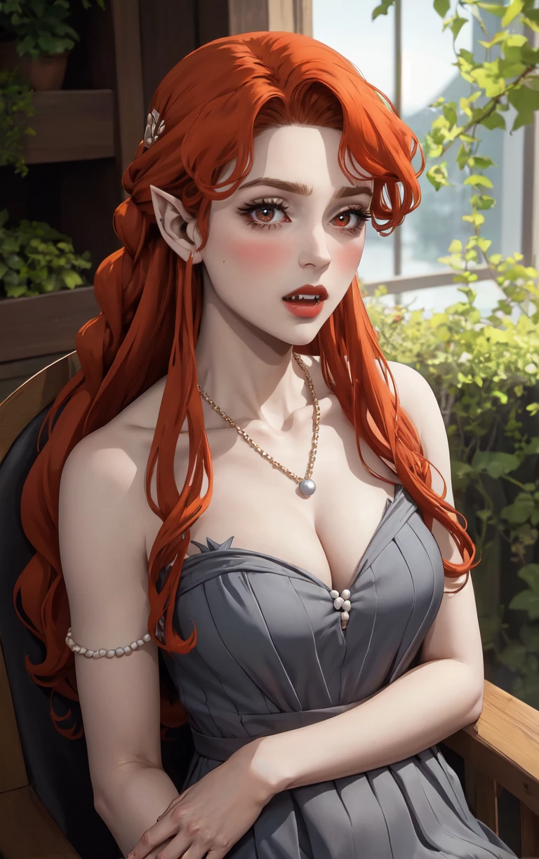 1girl, long hair, red hair, red eyes, pointy ears, blush, breasts, cleavage, lips, red lips, collarbone, fangs, lipstick, makeup, vampire, braid, floating hair,