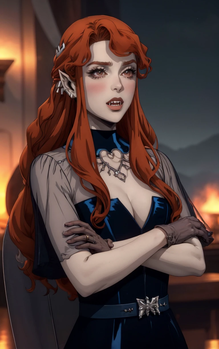 1girl, long hair, red eyes, blush, pointy ears, lips, breasts, red hair, hair ornament, braid, fangs, makeup, lipstick, black lips, vampire, very long hair, wavy hair, colored skin, blunt bangs,