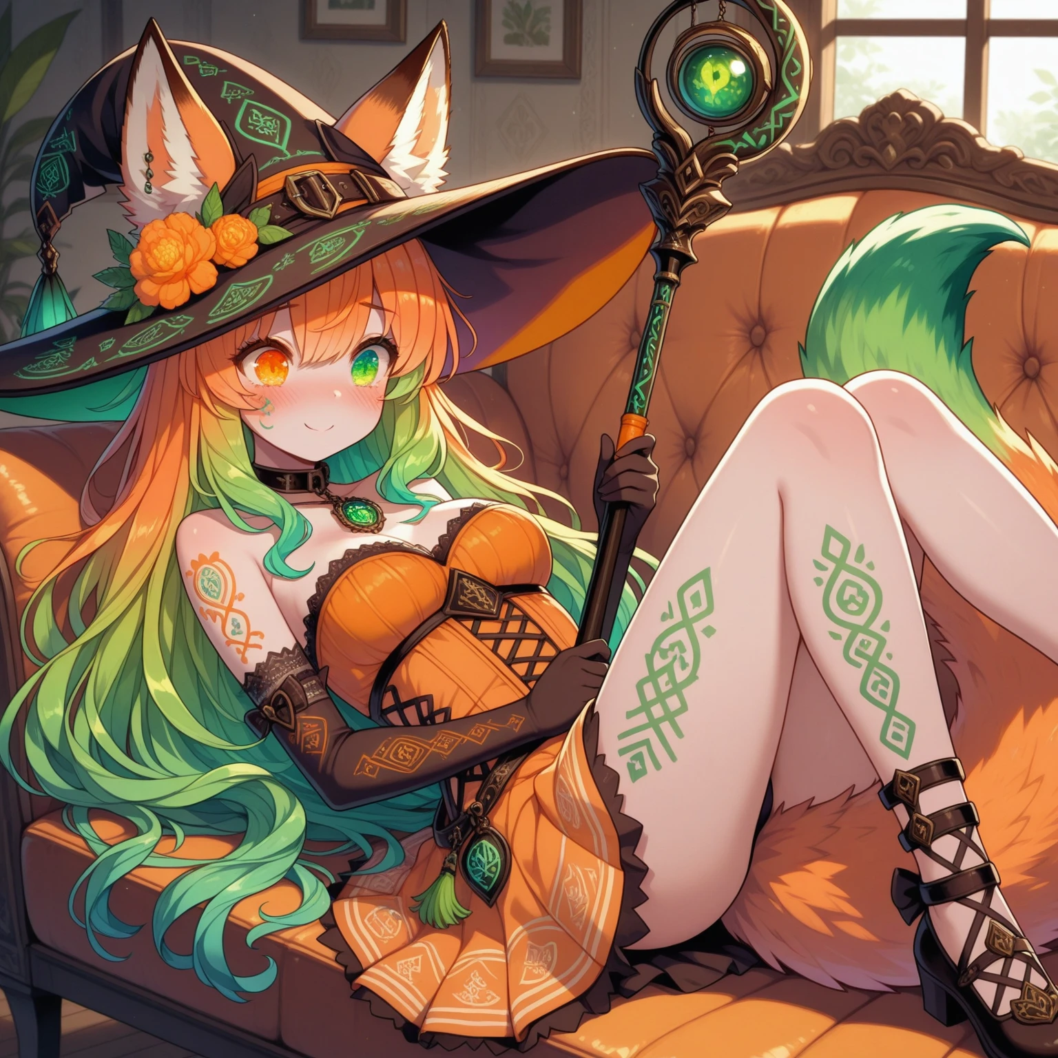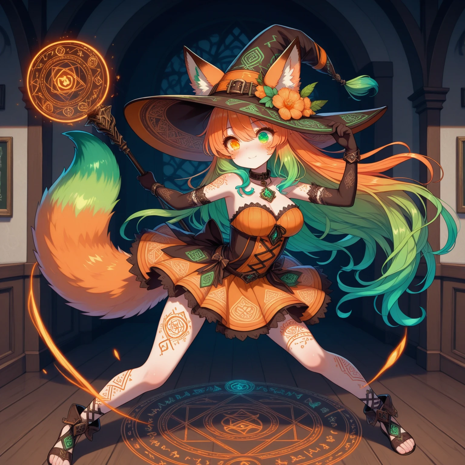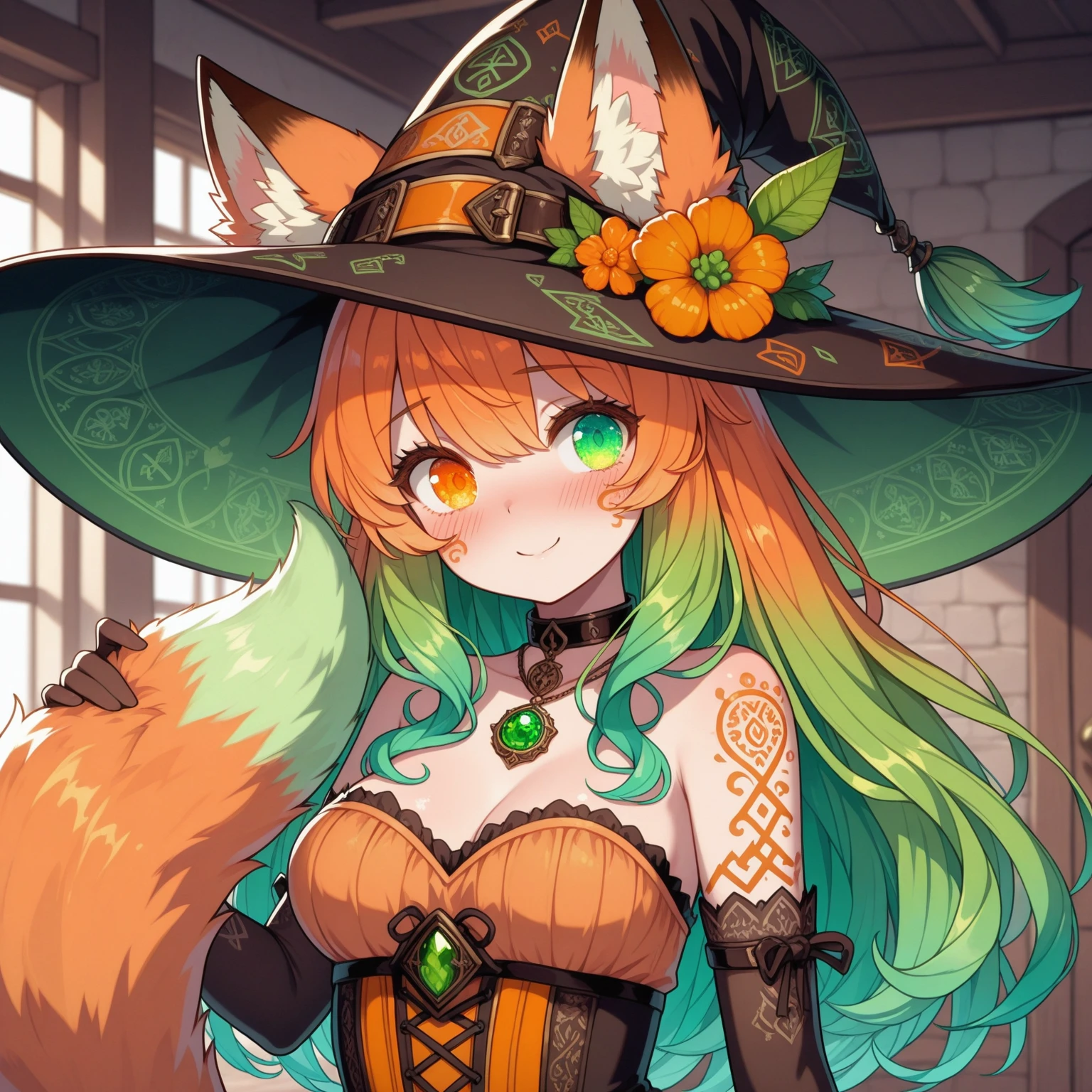 fennel_windmere, blush, witch hat, hat flower, gradient hair, orange hair, green hair, body markings, fox ears, heterochromia, green eyes, orange eyes, patterned hat, collar, orange dress, ears through headwear, jewelry, orange flower, elbow gloves, breasts, tail,
