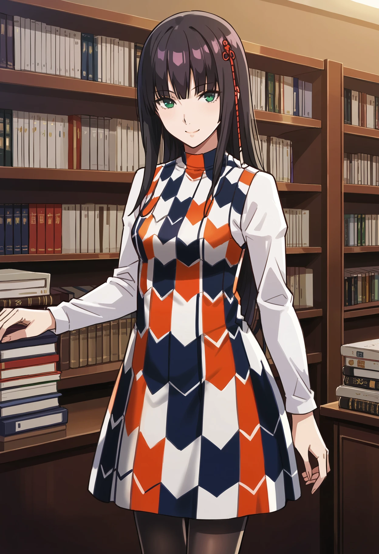 p5hifumi-dress, dress, checkered dress, black pantyhose, long sleeves,