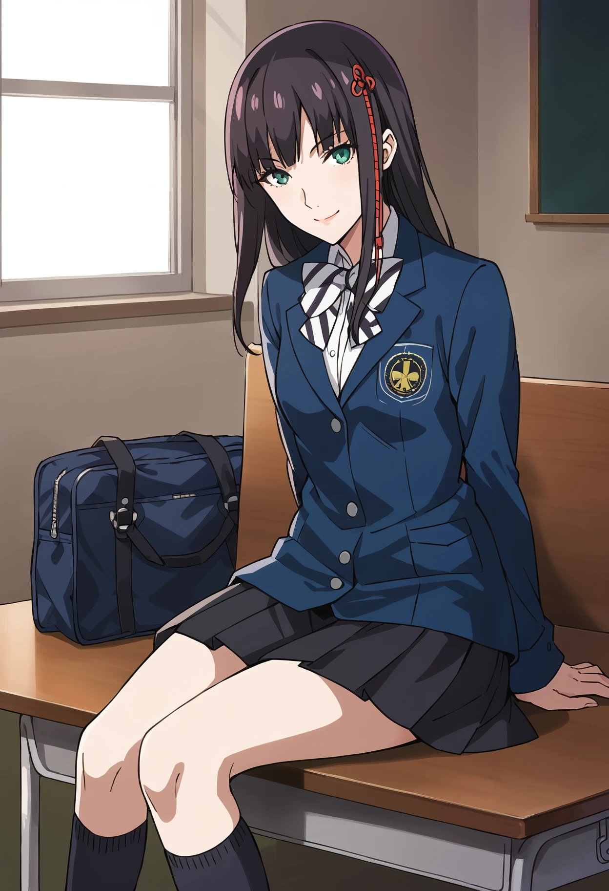 p5hifumi-uni, school uniform, jacket, school emblem, emblem, bowtie, striped bow, pleated skirt, black skirt, white socks, kneehighs, loafers