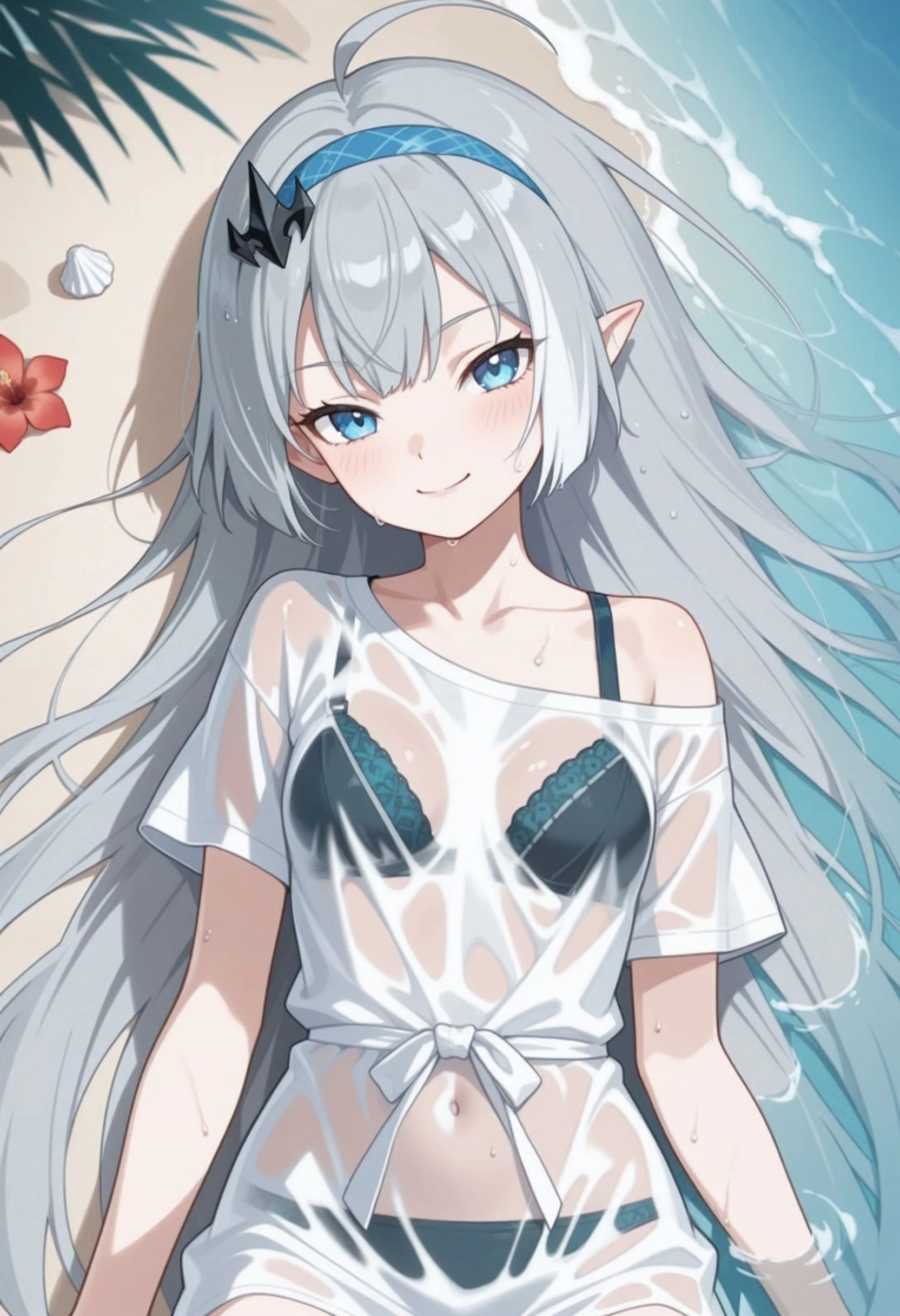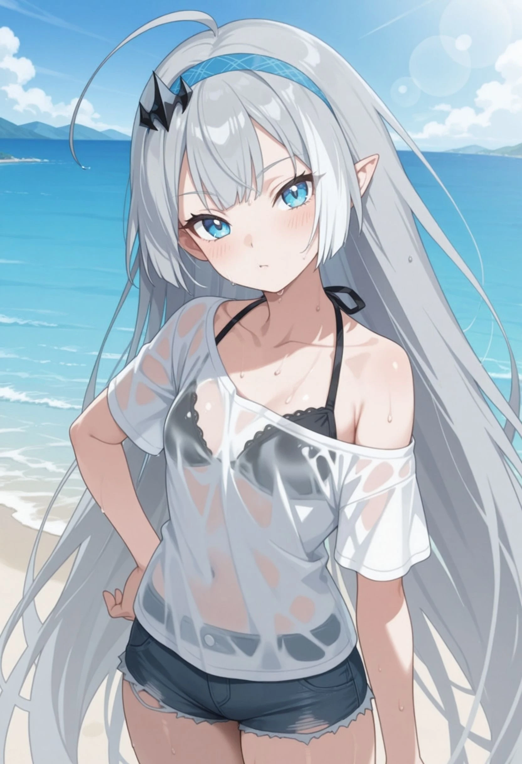 tyrant_\(stella_sora\), stllsrtyrnt, ahoge, blue eyes, blue hairband, grey hair, hairband, head tilt, long hair, pointy ears, small breasts, very long hair, <lora:stella_sora_tyrant_illustrious:0.8>