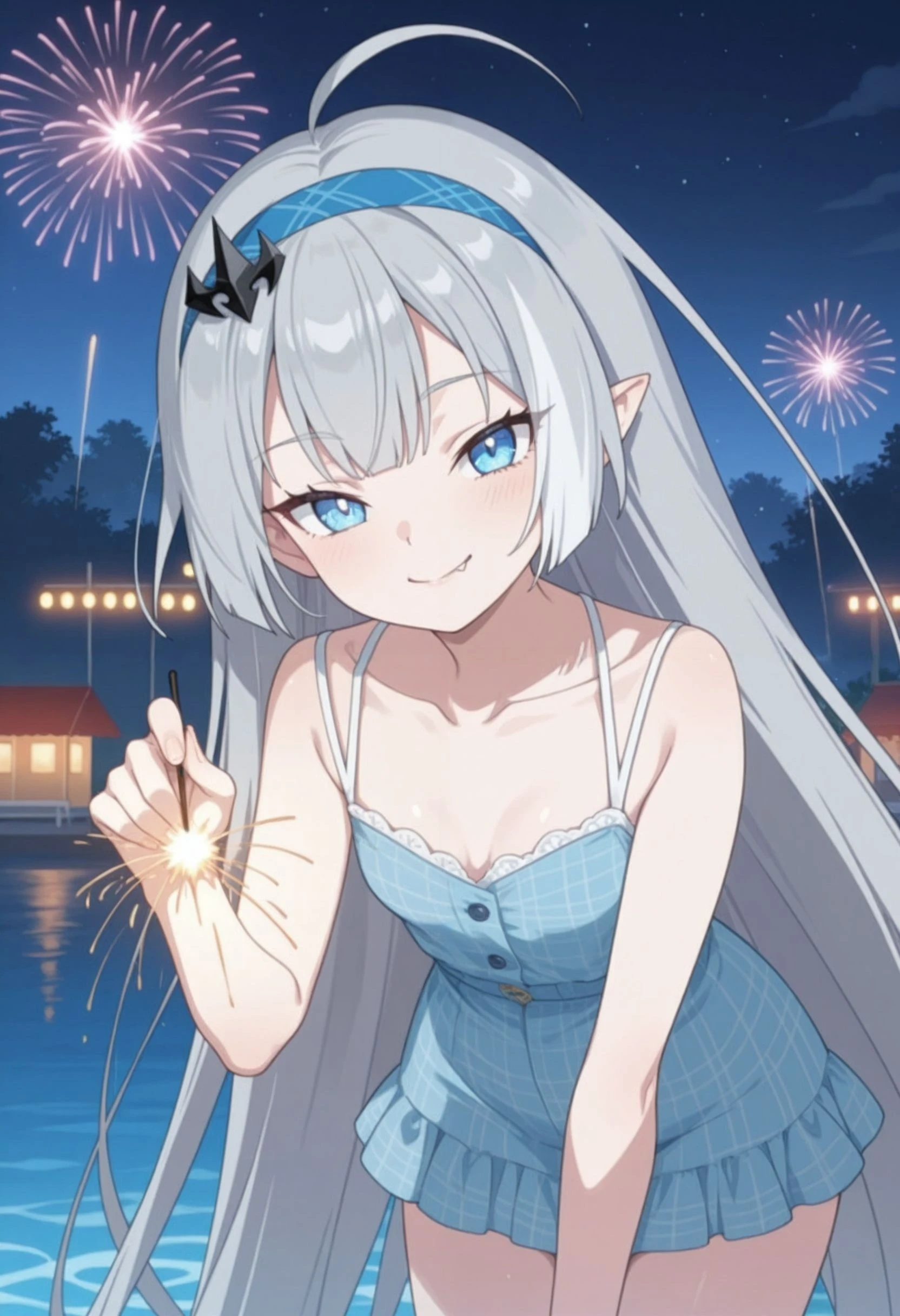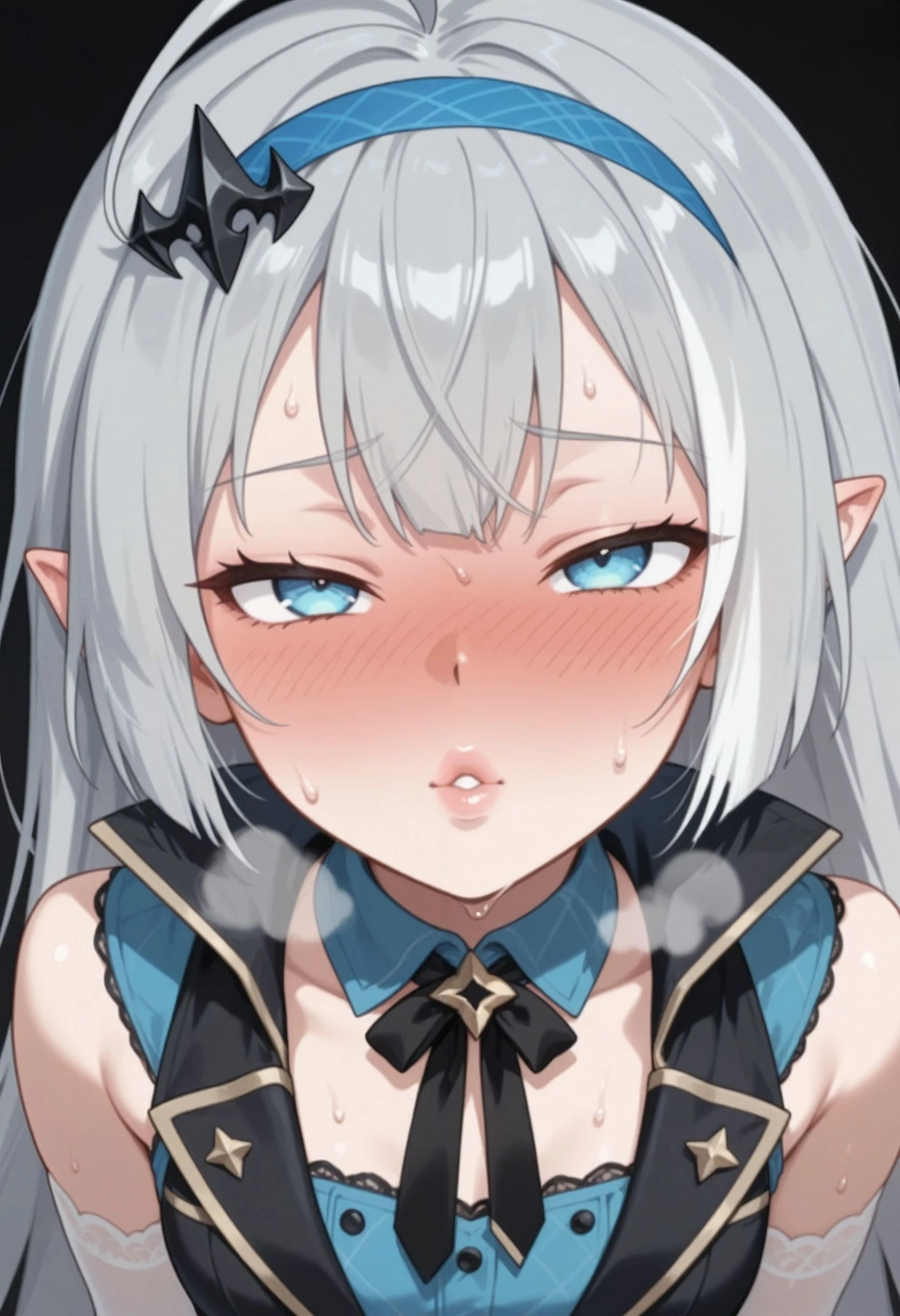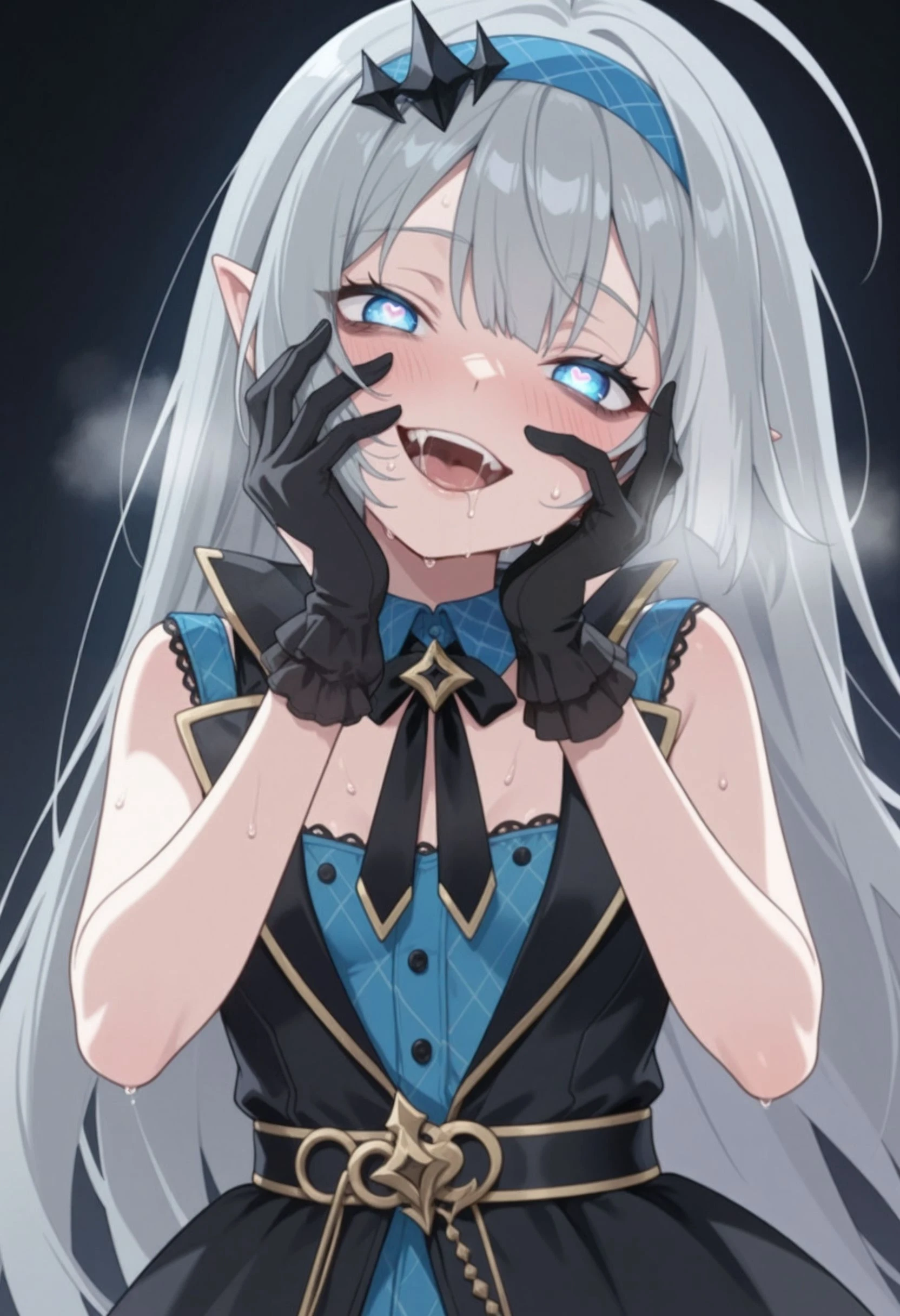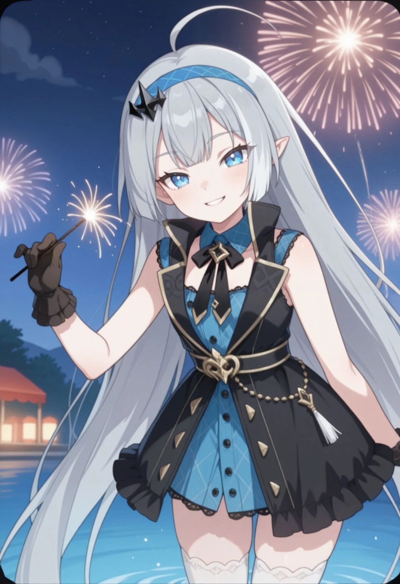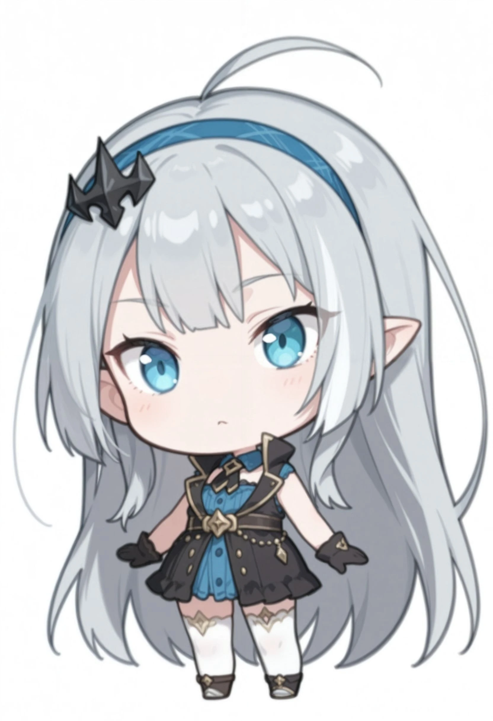 tyrant_\(stella_sora\), stllsrtyrnt, ahoge, blue eyes, blue hairband, grey hair, hairband, head tilt, long hair, pointy ears, small ???????, very long hair, <lora:stella_sora_tyrant_illustrious:0.8>Description