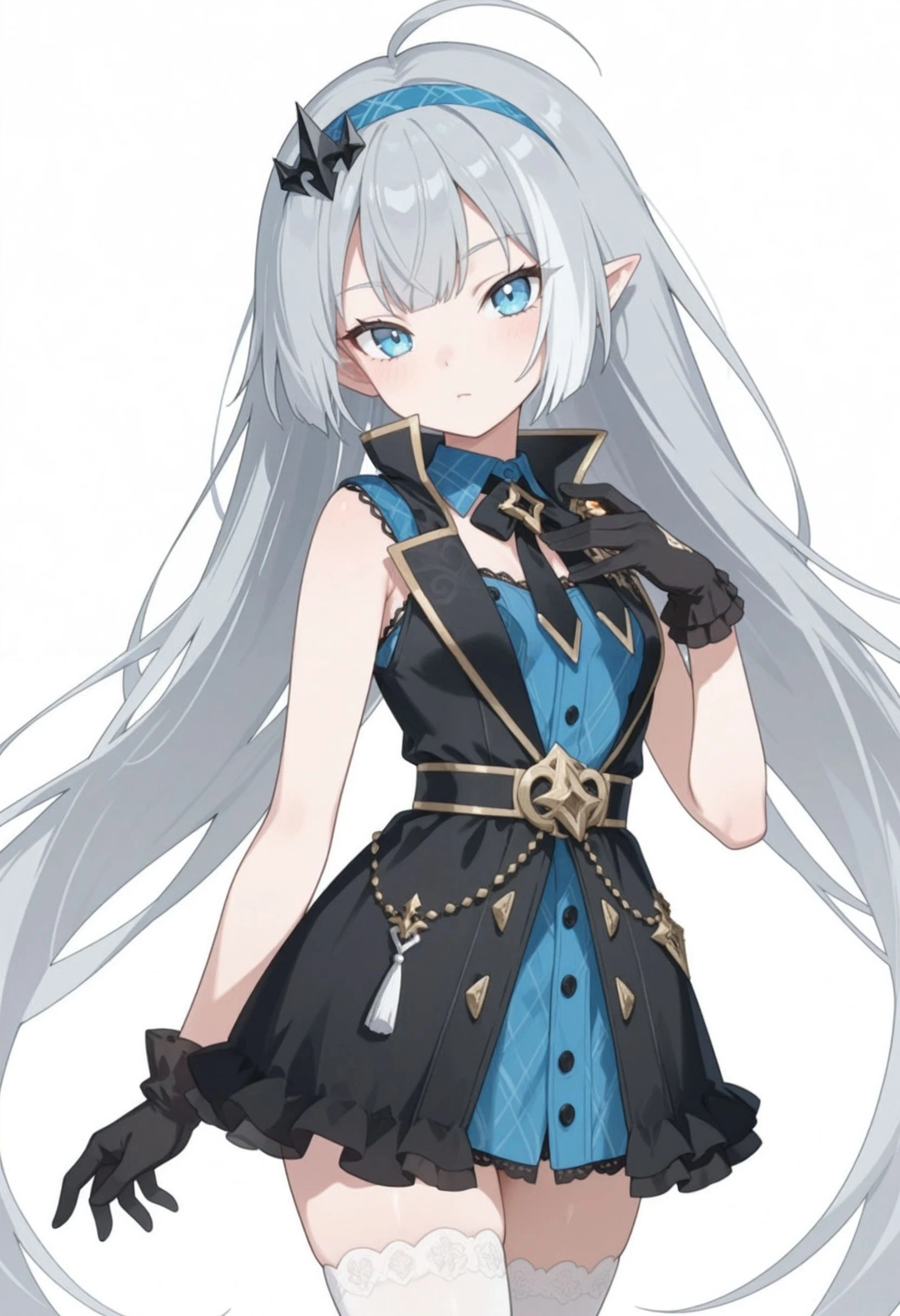 tyrant_\(stella_sora\), stllsrtyrnt, ahoge, black coat, black gloves, black necktie, blue dress, blue eyes, blue hairband, ???????, coat, detached collar, dress, gloves, grey hair, hairband, head tilt, long hair, necktie, pointy ears, short dress, sleeveless, sleeveless coat, sleeveless dress, small ???????, thighhighs, very long hair, white thighhighs, zettai ryouiki, <lora:stella_sora_tyrant_illustrious:0.8>Without Clothes