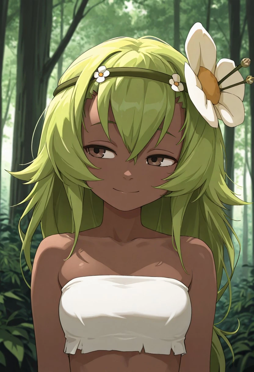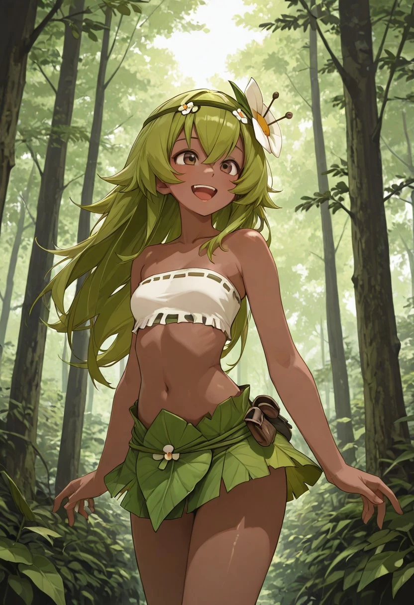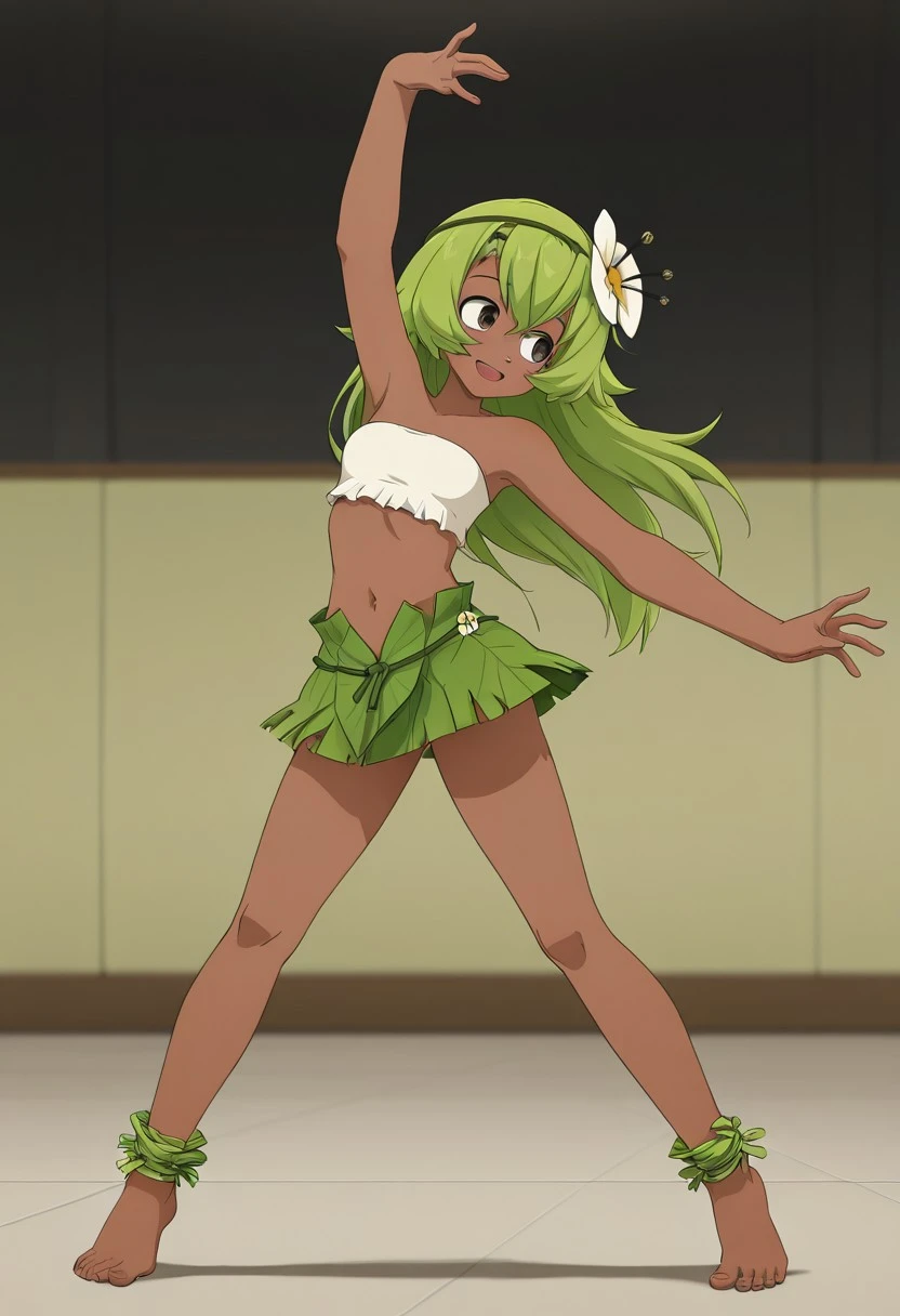 flower in the hair,long hair,headband,white bandeau, leaf miniskirt, green anklets, barefoot