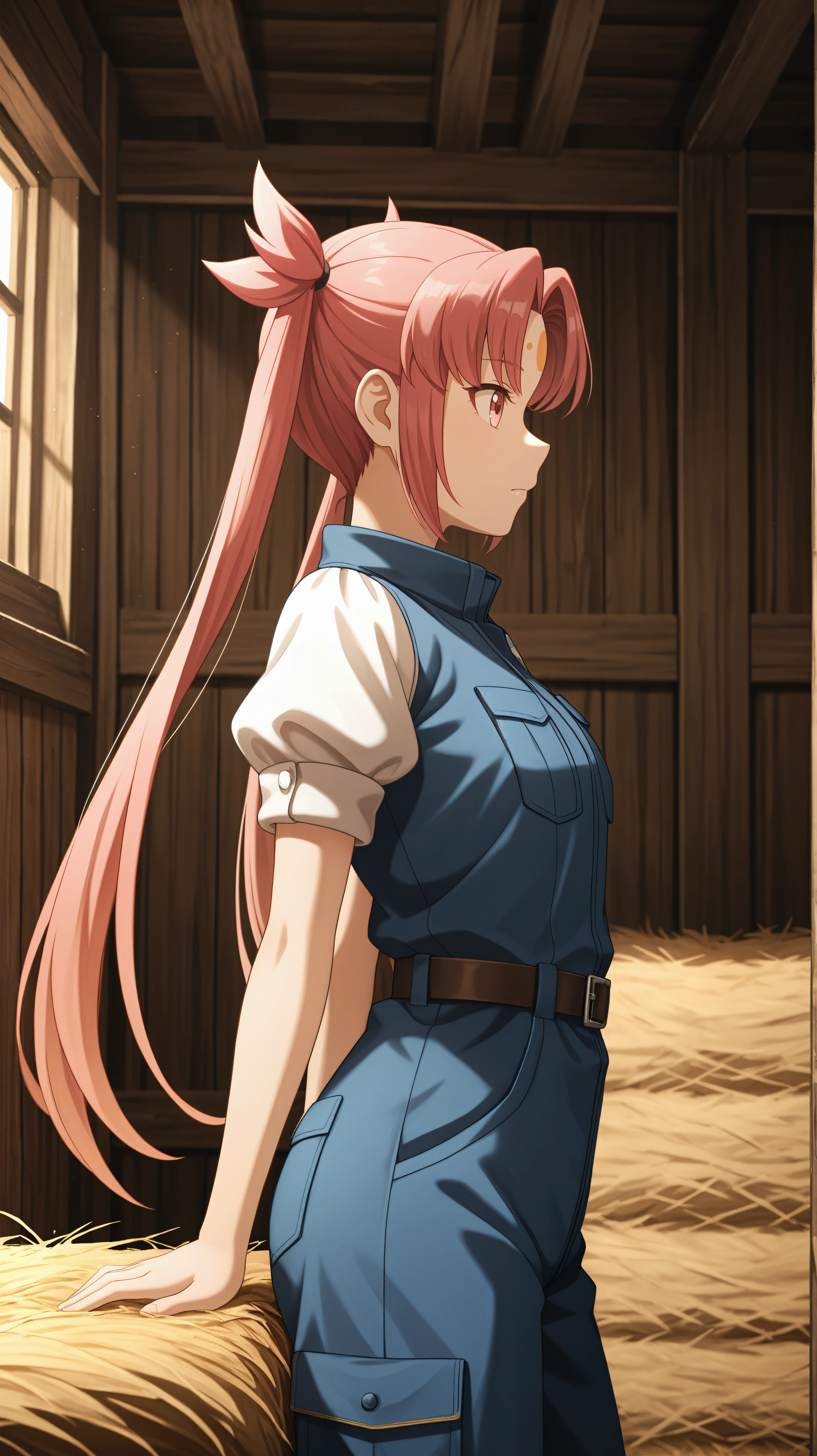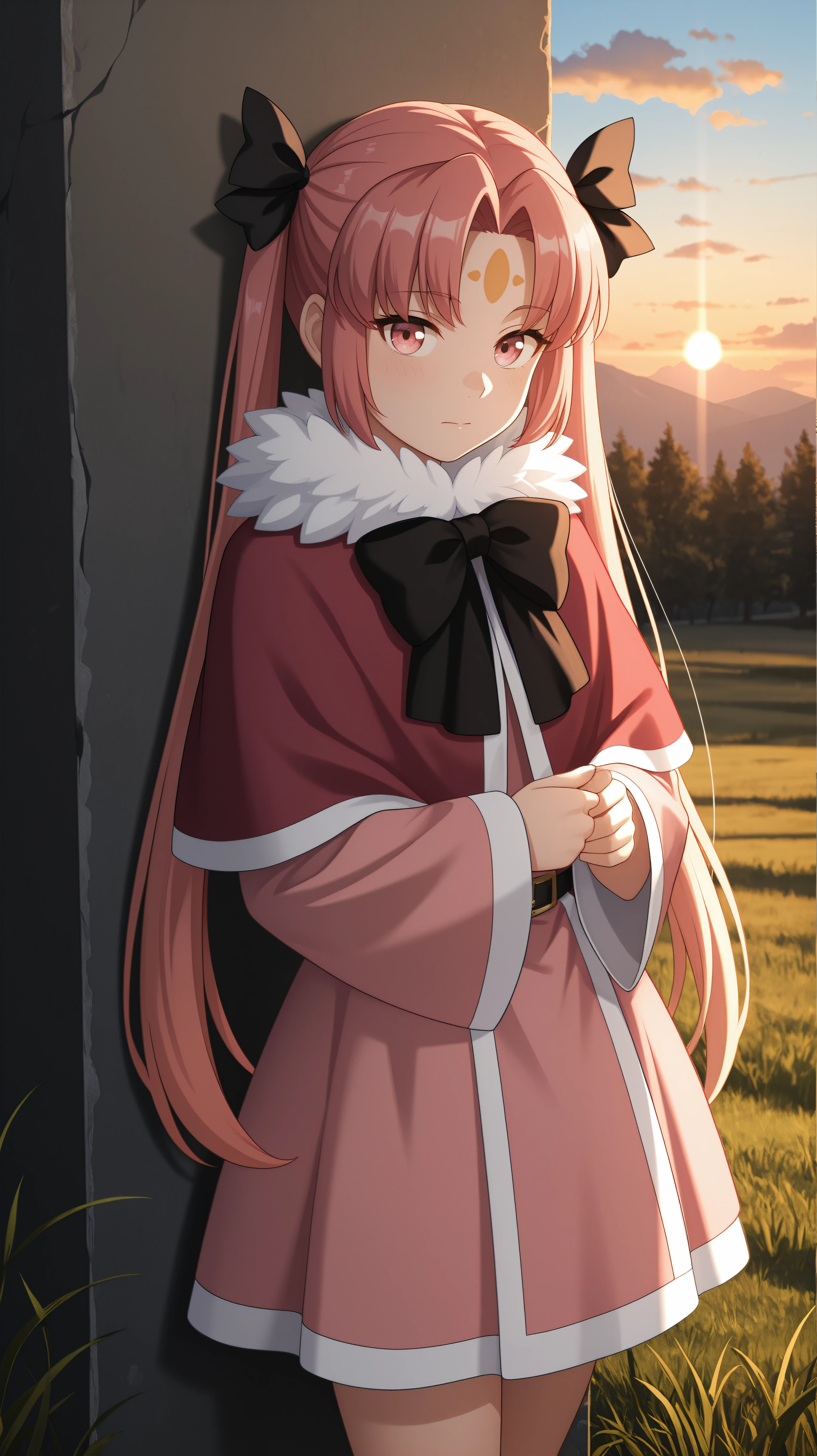 mora-mf, long hair, dark pink hair, parted bangs, long twintails, pink eyes, black ribbons, yellow forehead marking, large white fur collar, black ribbon, pink capelet, light pink dress, long sleeves, wide sleeves, short dress, multicolored dress,Description