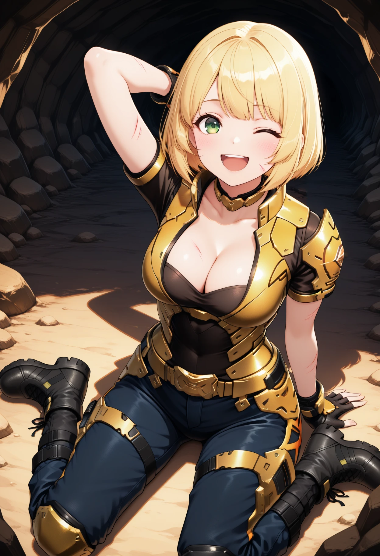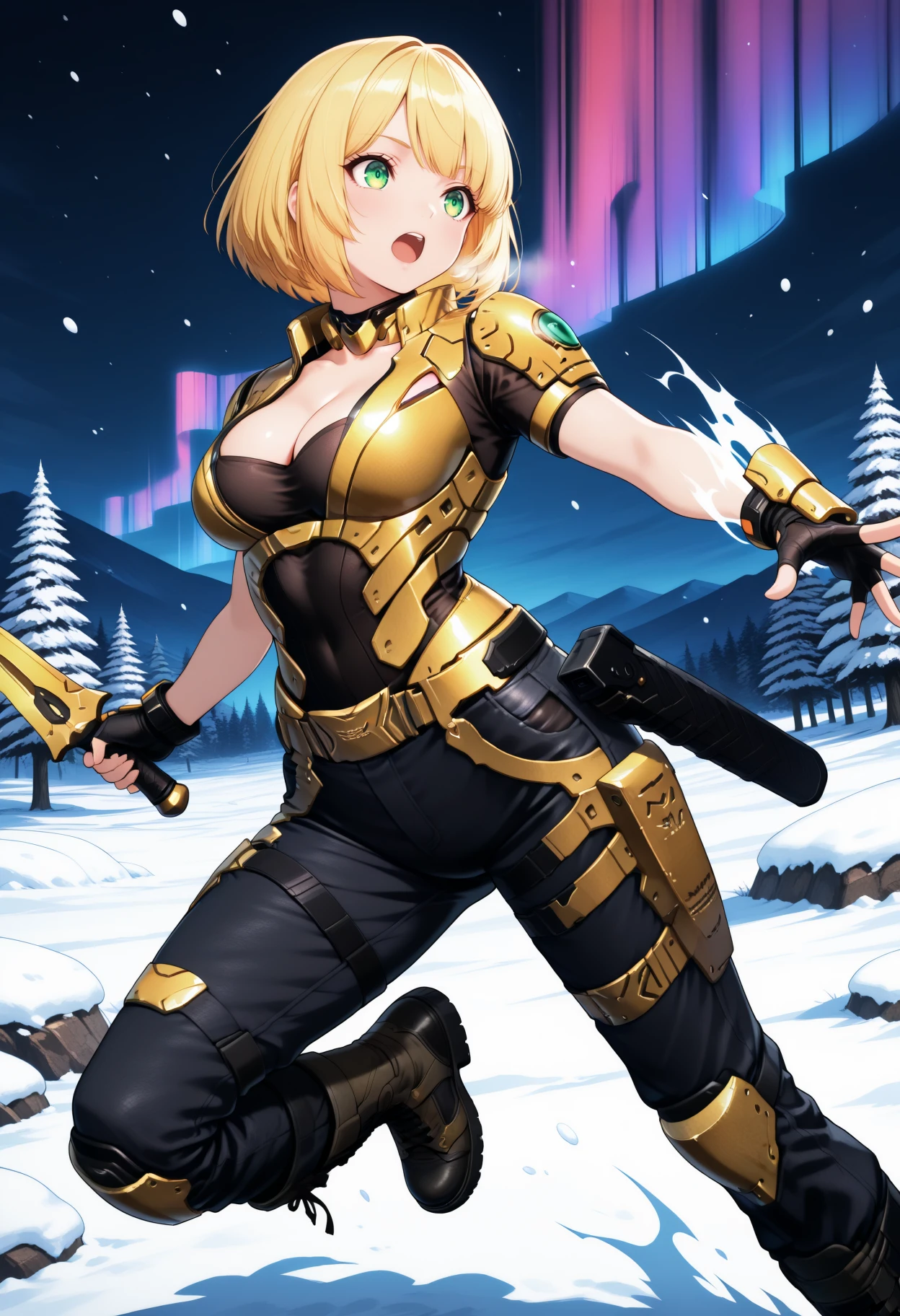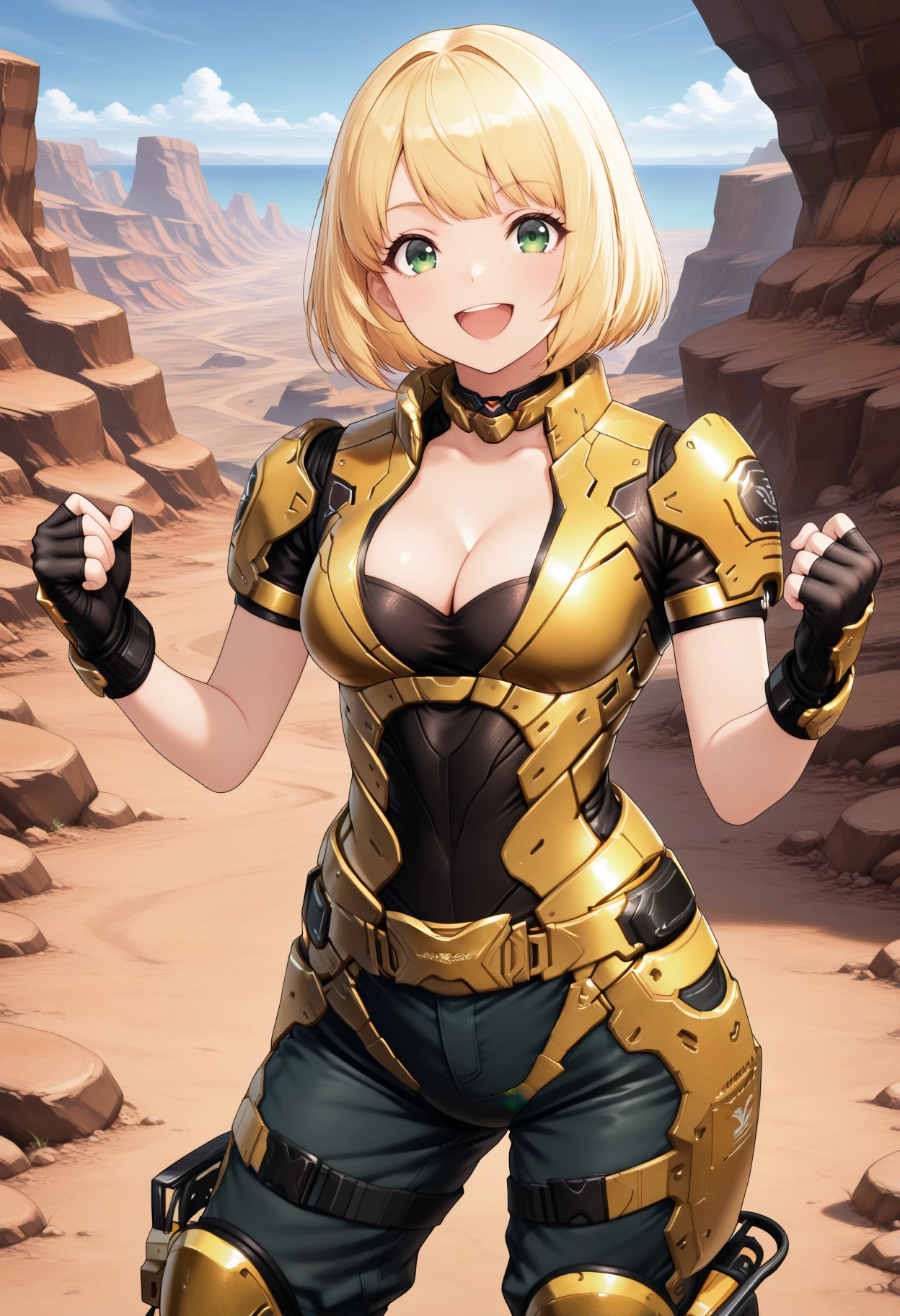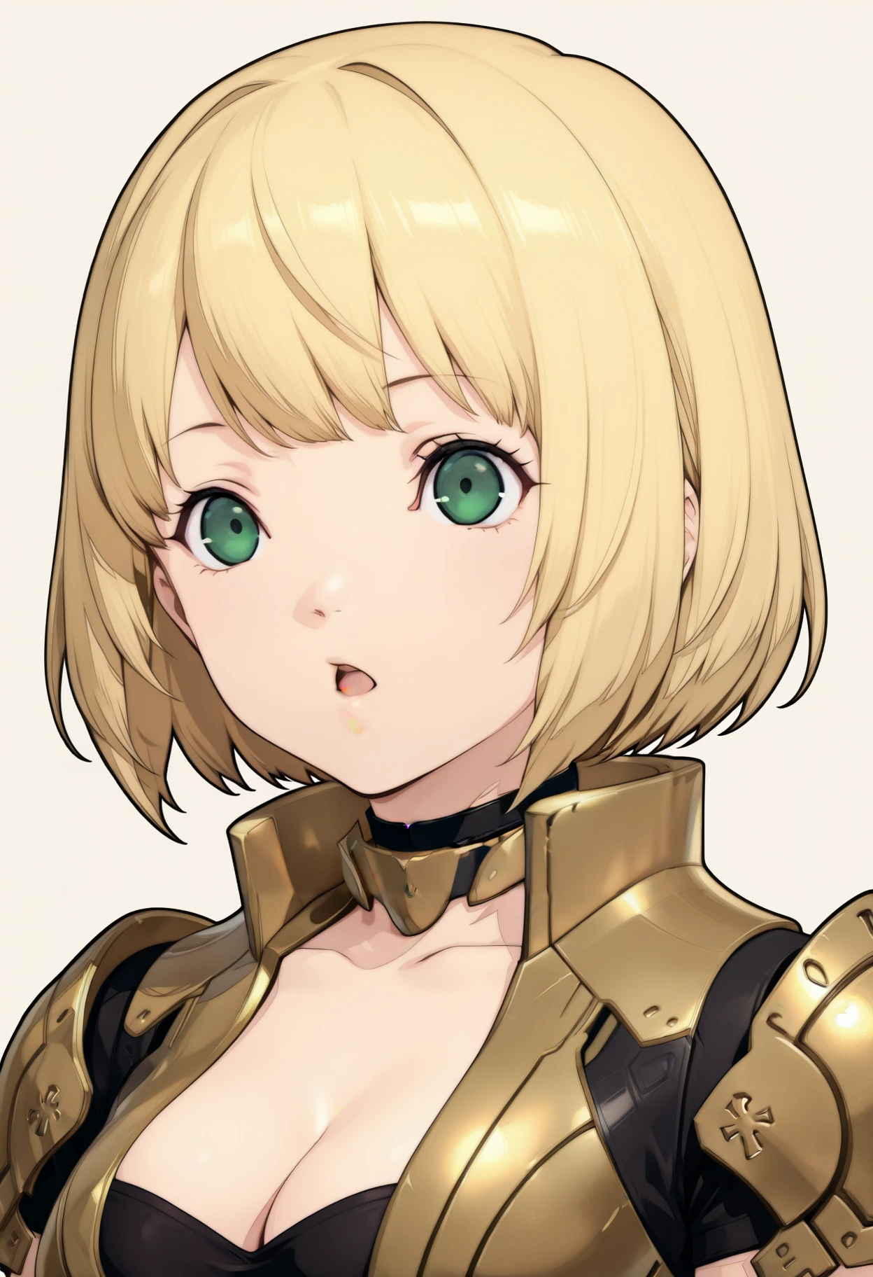 miaXCX, blonde hair, bob cut, green eyes, armored shirt, black choker, cleavage, short sleeves, fingerless gloves, combat pants, belt, combat boots,