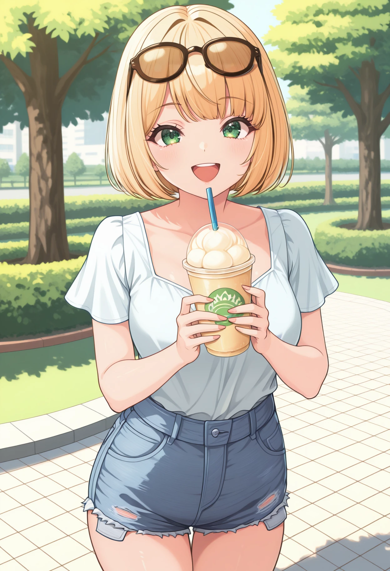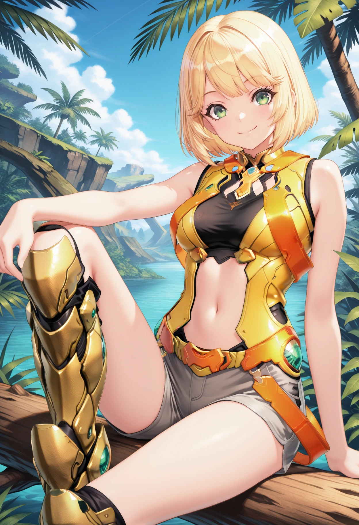 miaCC, blonde hair, bob cut, green eyes, black crop top, yellow vest, orange harness, navel, grey shorts, armored boots,