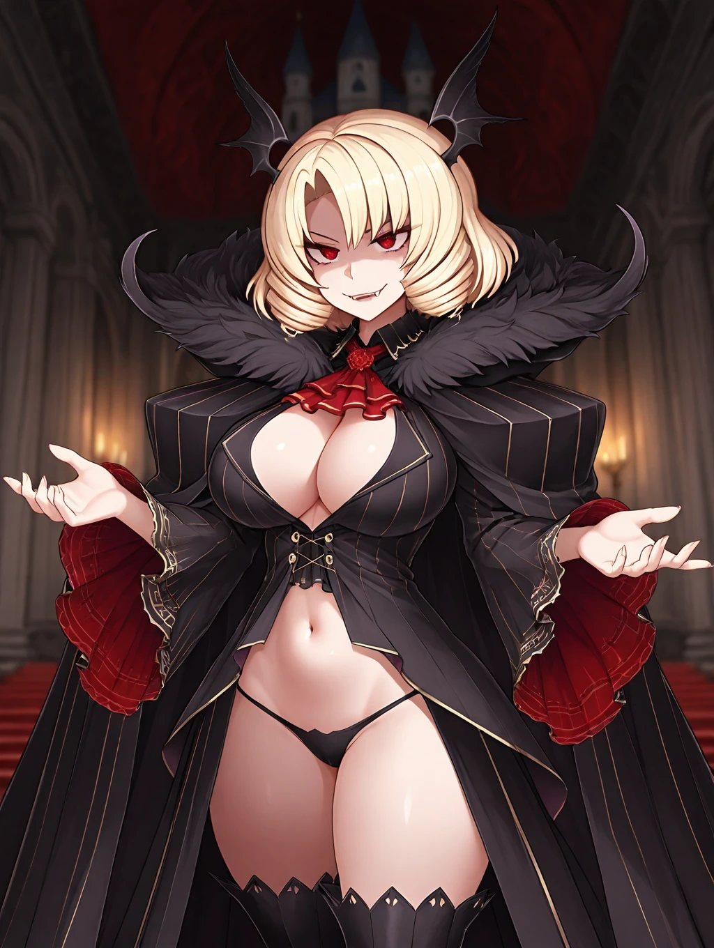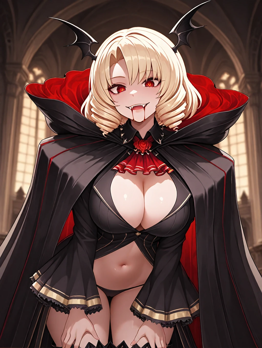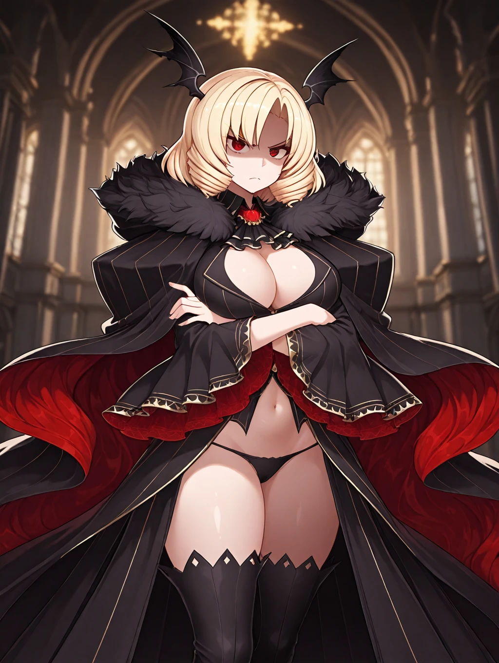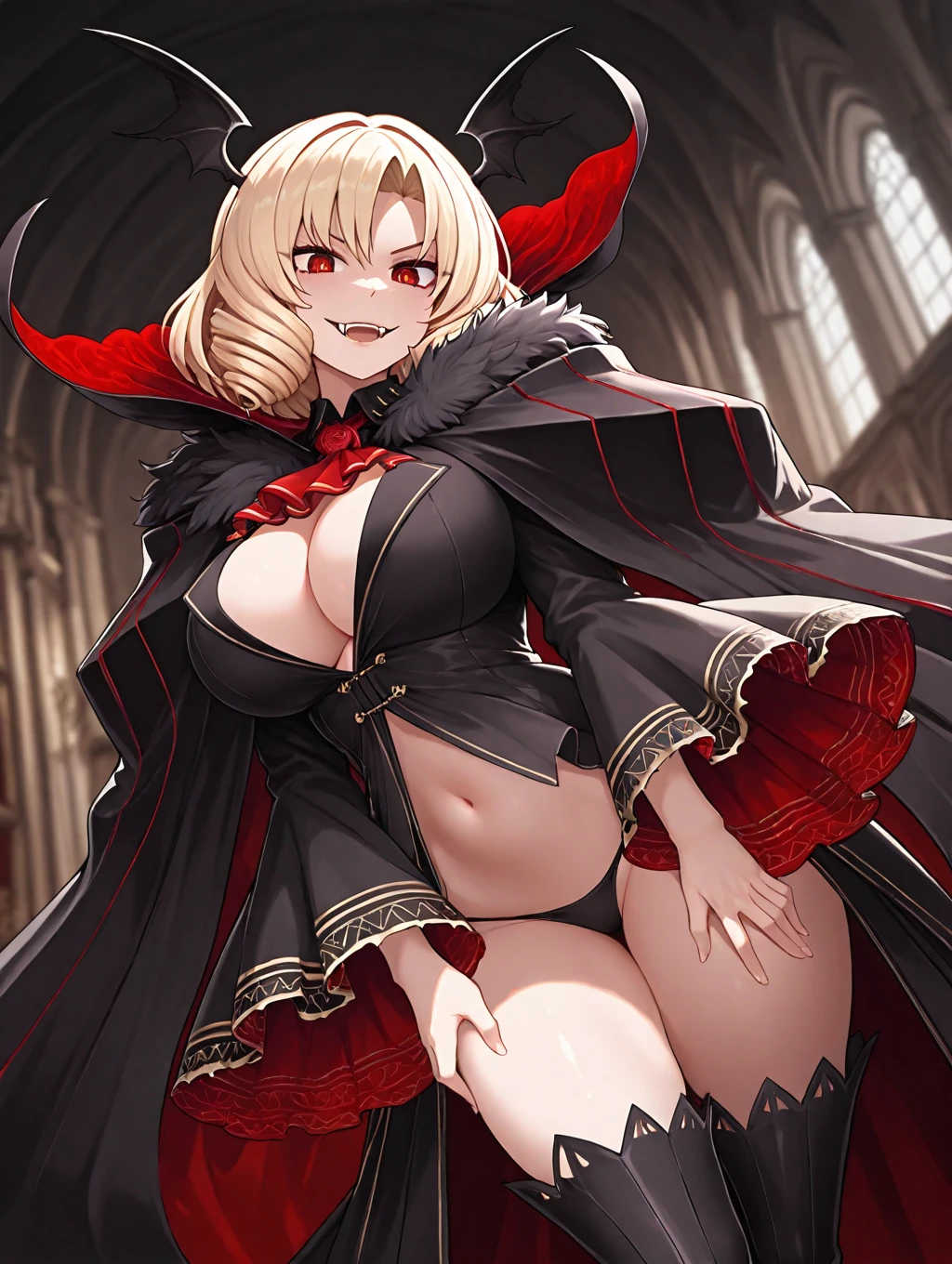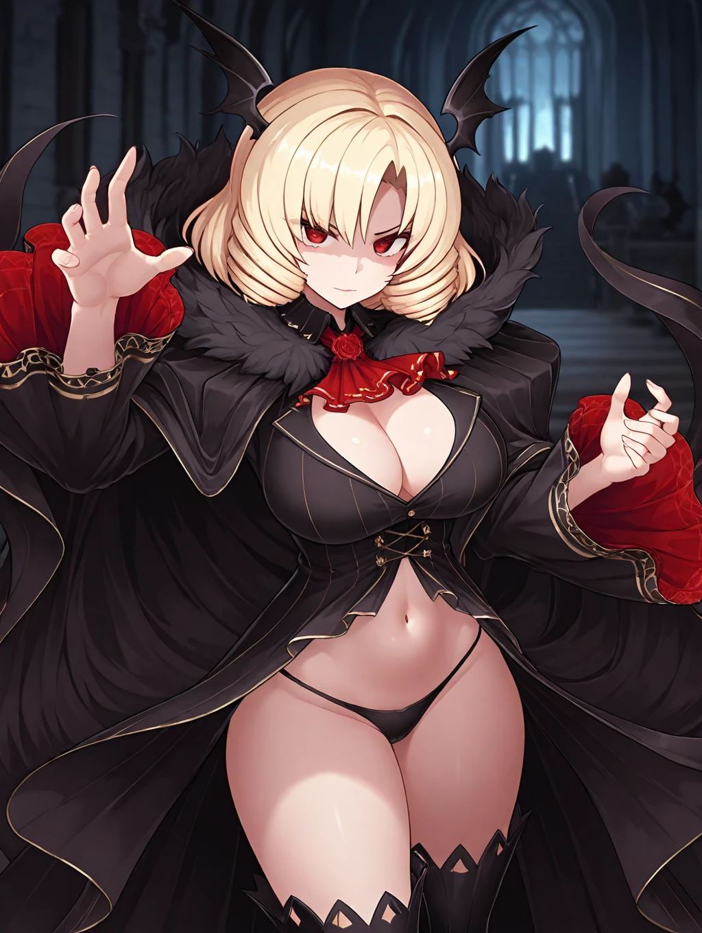 Fatima, blonde hair, short hair, drill hair, red eyes, head wings, large breasts, black cloak, ascot, cleavage, underwear, black panties, black shir, long sleeves, exposed navel, wide sleeves, black thigh boots, black clothes, red clothes,