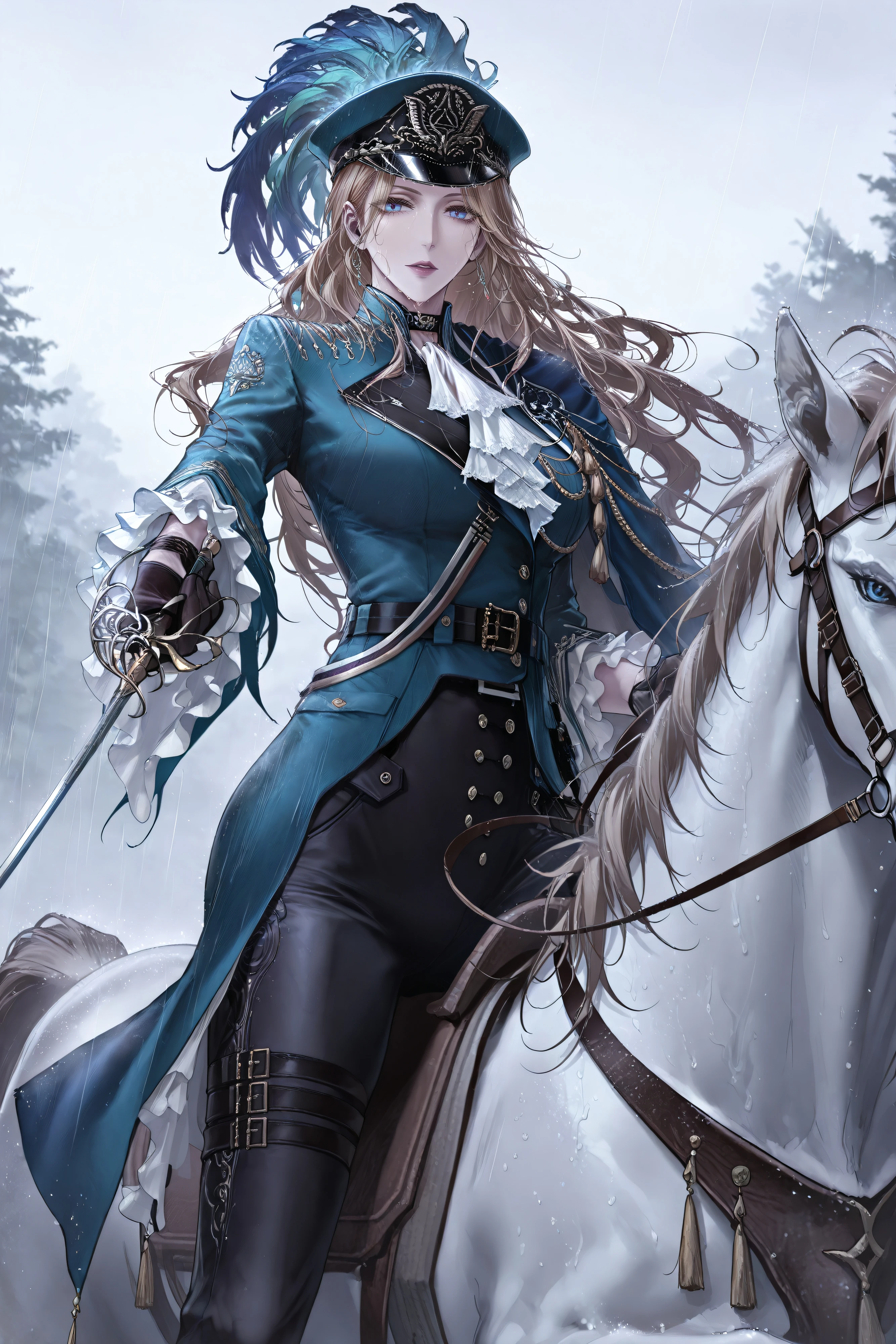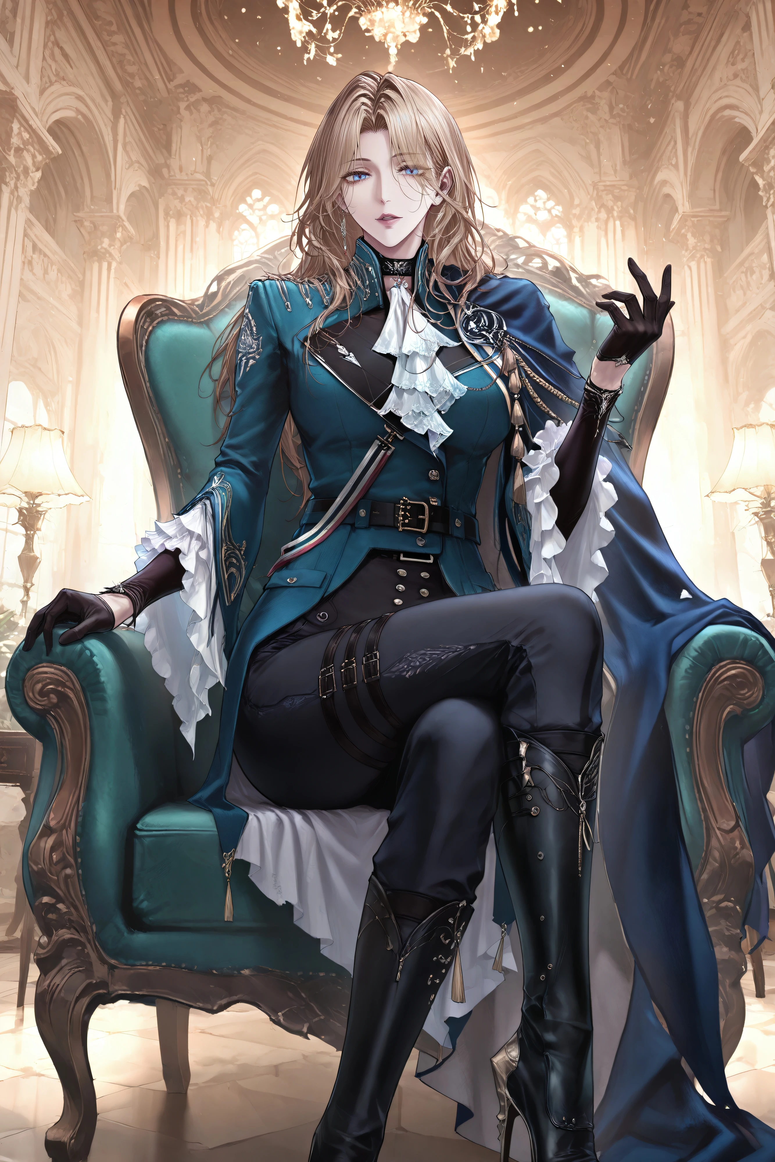 augustus-def,long hair,blonde hair, blue eyes, military hat,blue headwear,hat feather, choker, white ascot,military uniform, blue jacket,belt, buckle, buttons, long sleeves,frilled sleeves, black gloves, aiguillette,blue cape, black pants, thigh strap,black footwear, high heel boots, knee boots, Optional: rapier, holding sword,