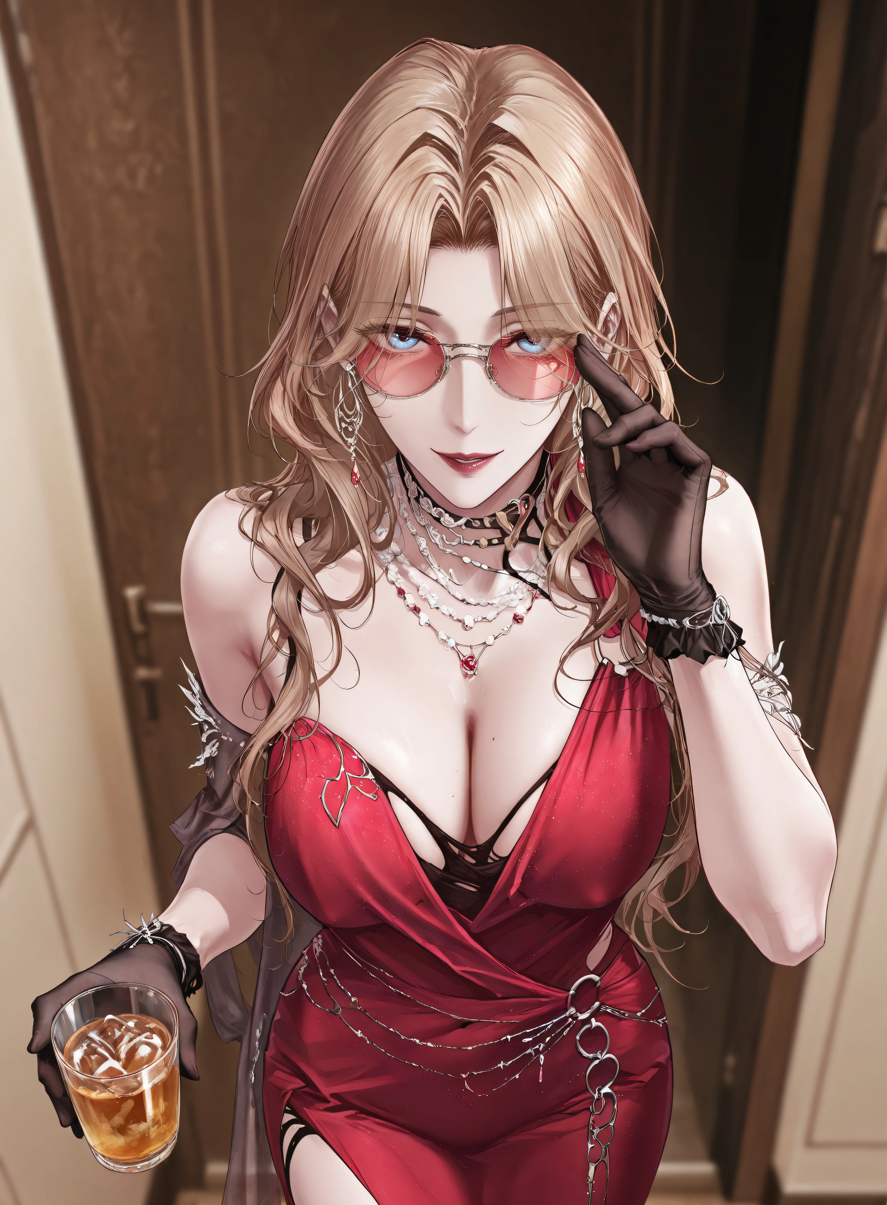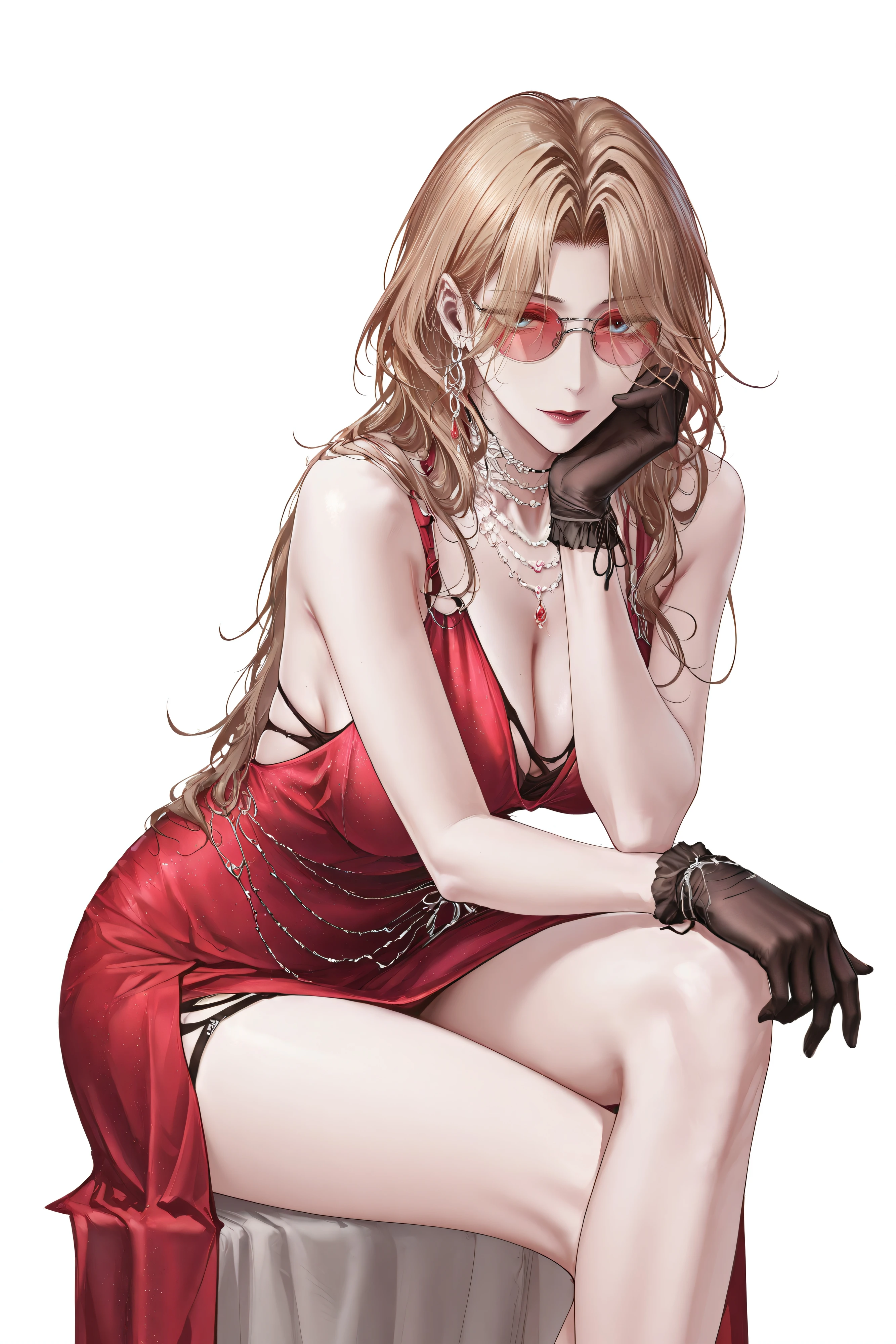 cathrine-red, long hair, wavy hair, blonde hair,parted bangs,blue eyes, red lips, earrings, necklace,jewelry,red dress,sleeveless dress, evening gown, bare shoulders, black gloves, side slit, tinted eyewear, sunglasses,red-tinted eyewear,Description