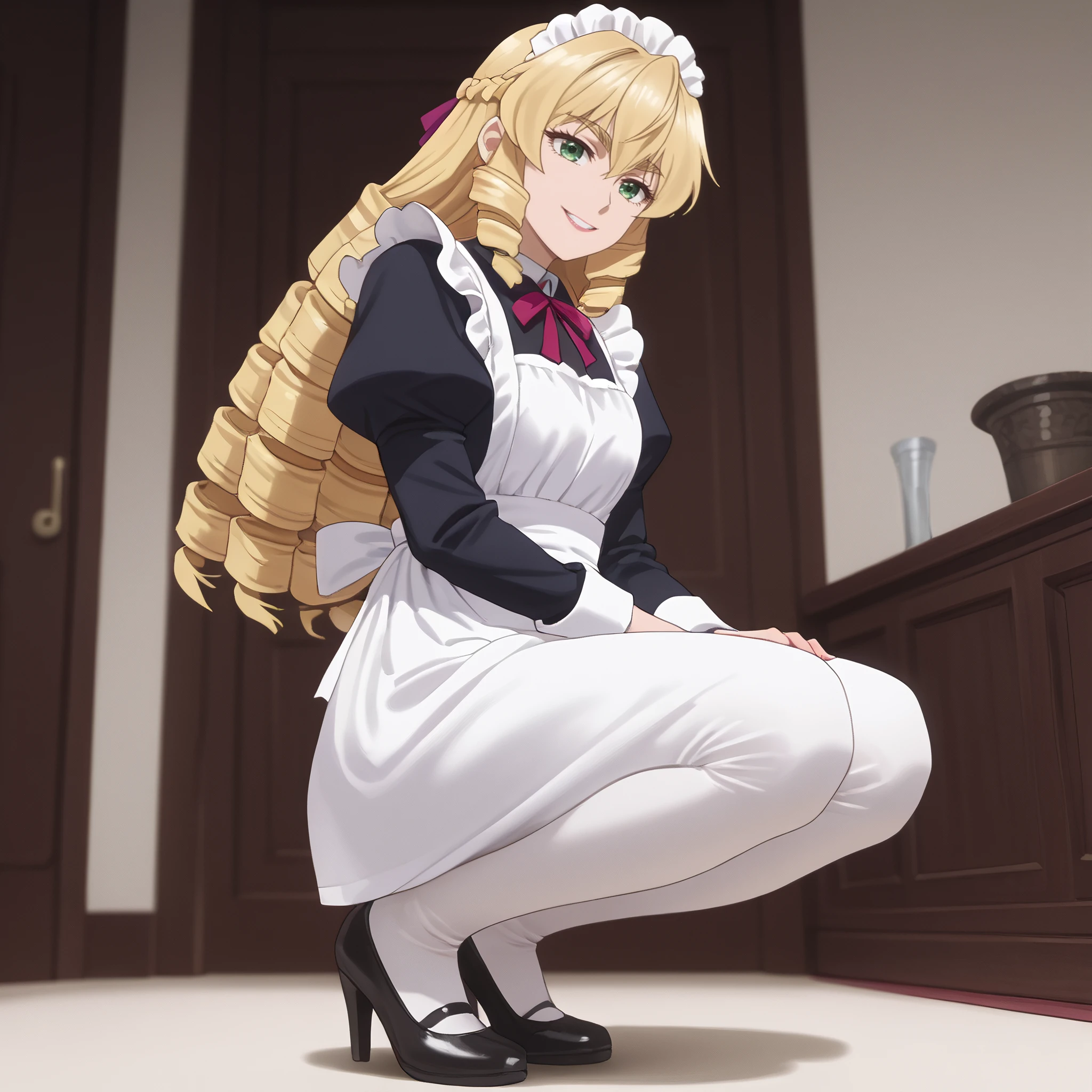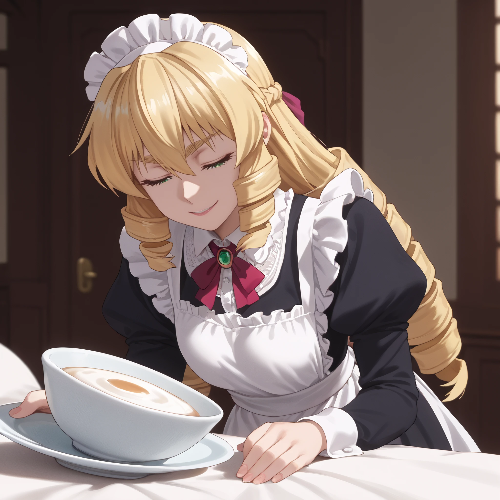 ARTGrace, blonde hair, long hair, drill hair, eyebrows visible through hair, green eyes, braid, bangs, hair between eyes, curly hair, twin drills,
