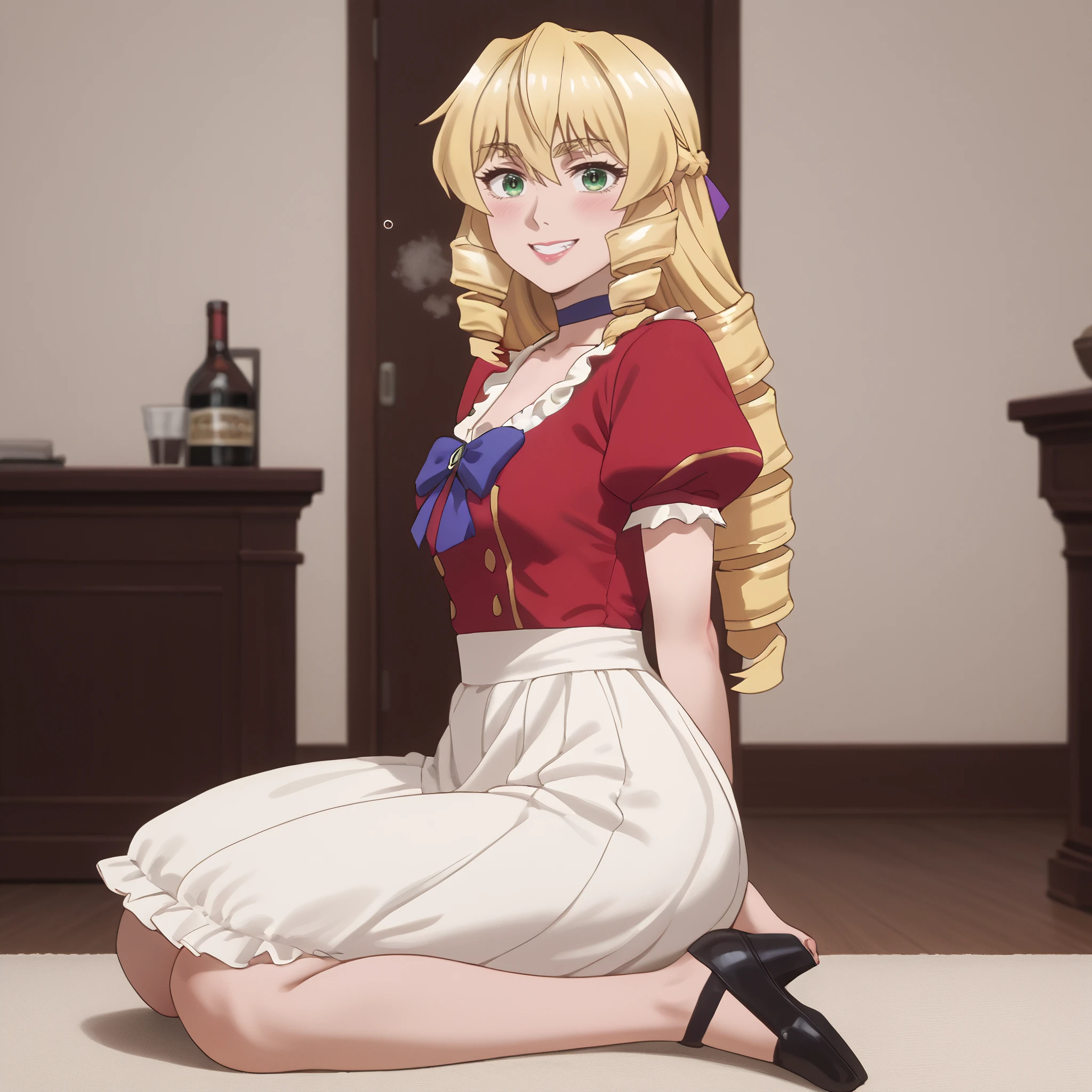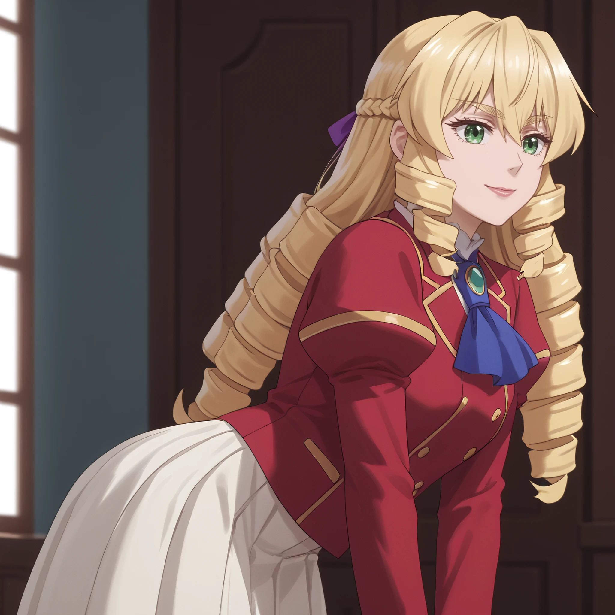 GraceSchool, bow, jacket, ringlets, long sleeves, ribbon, jewelry, hair bow, ascot, brooch, blue bow, dress, shirt, school uniform, hair ribbon, gem, red jacket, white skirt,