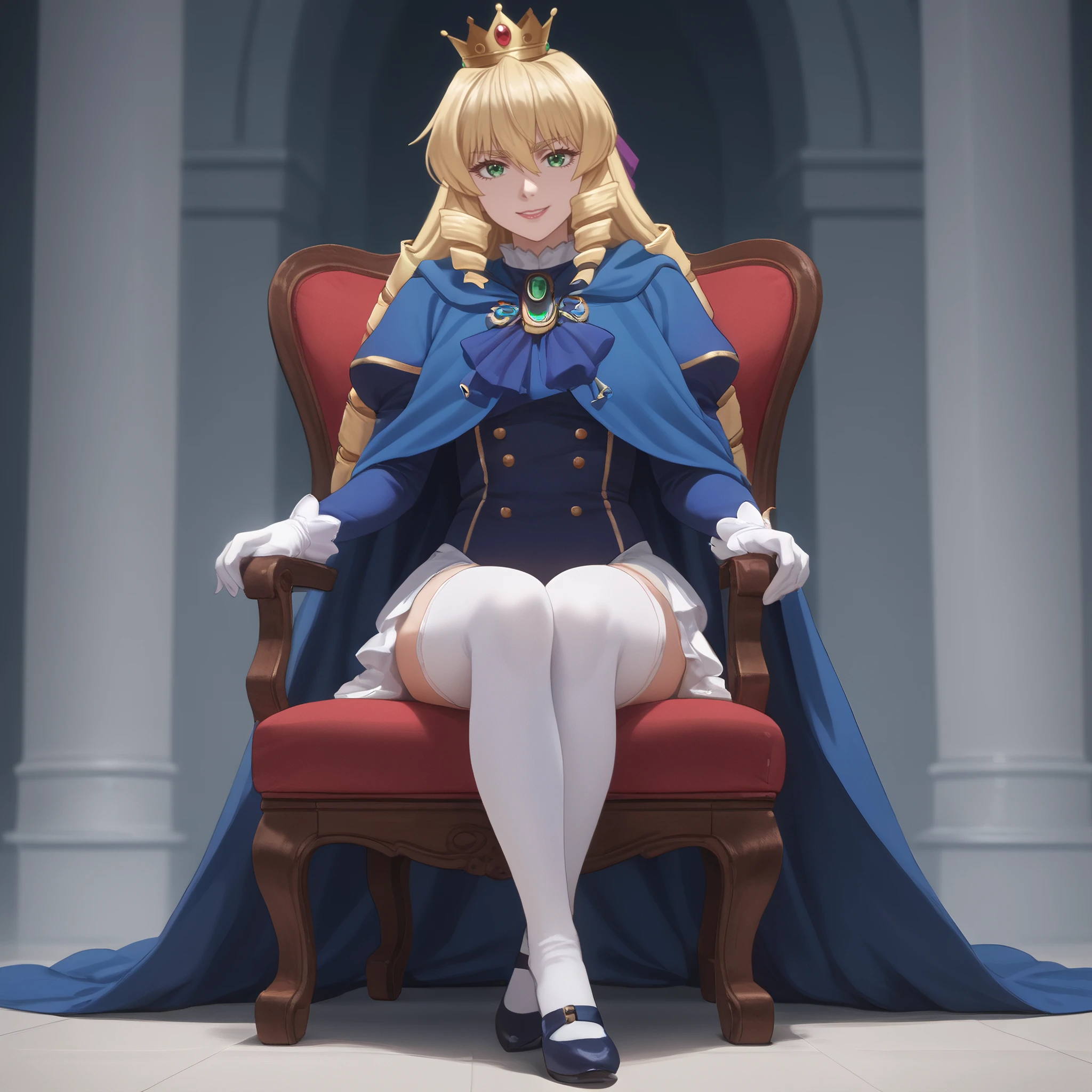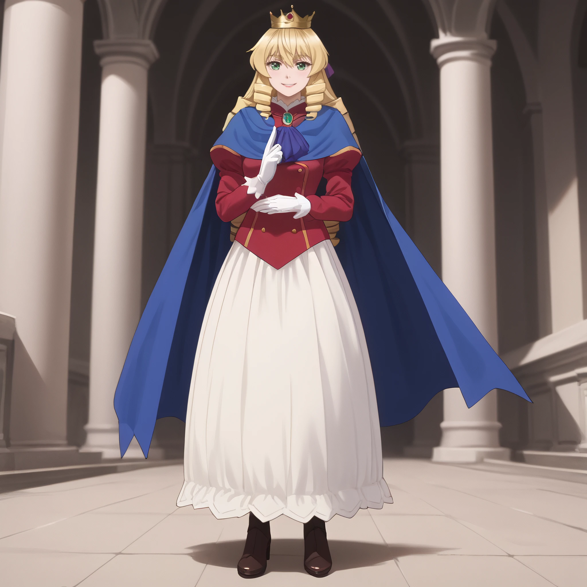 GraceFormalCrown, short hair, ringlets, crown, jewelry, long sleeves, gloves, puffy sleeves, striped, dress, white gloves, bow, mini-crown, gem, cape, ribbon, juliet sleeves, blue cape,