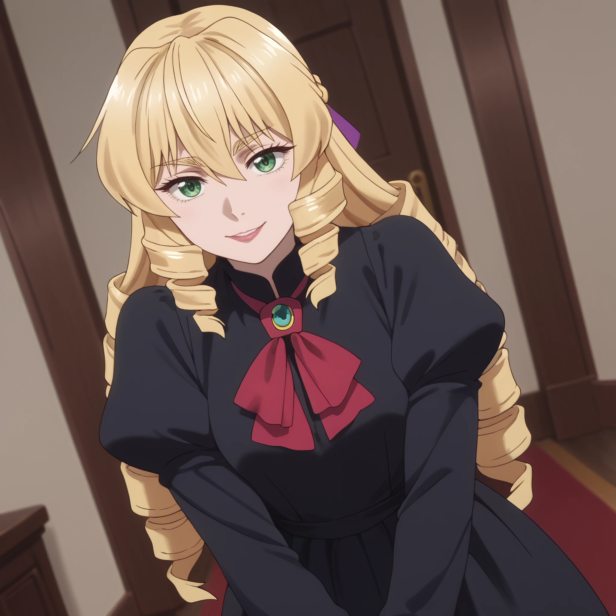 GraceBlackDress, long sleeves, bow, dress, hair bow, puffy sleeves, ringlets, ribbon, red bow, black dress,