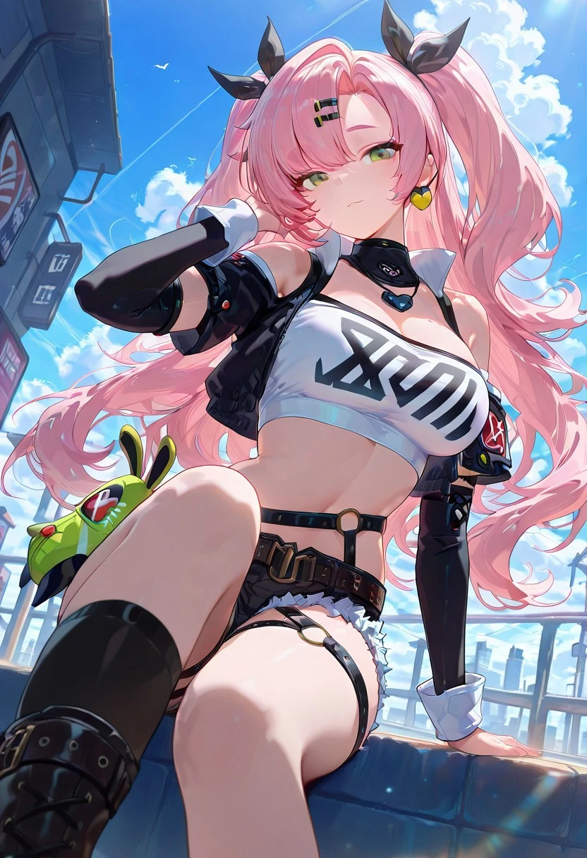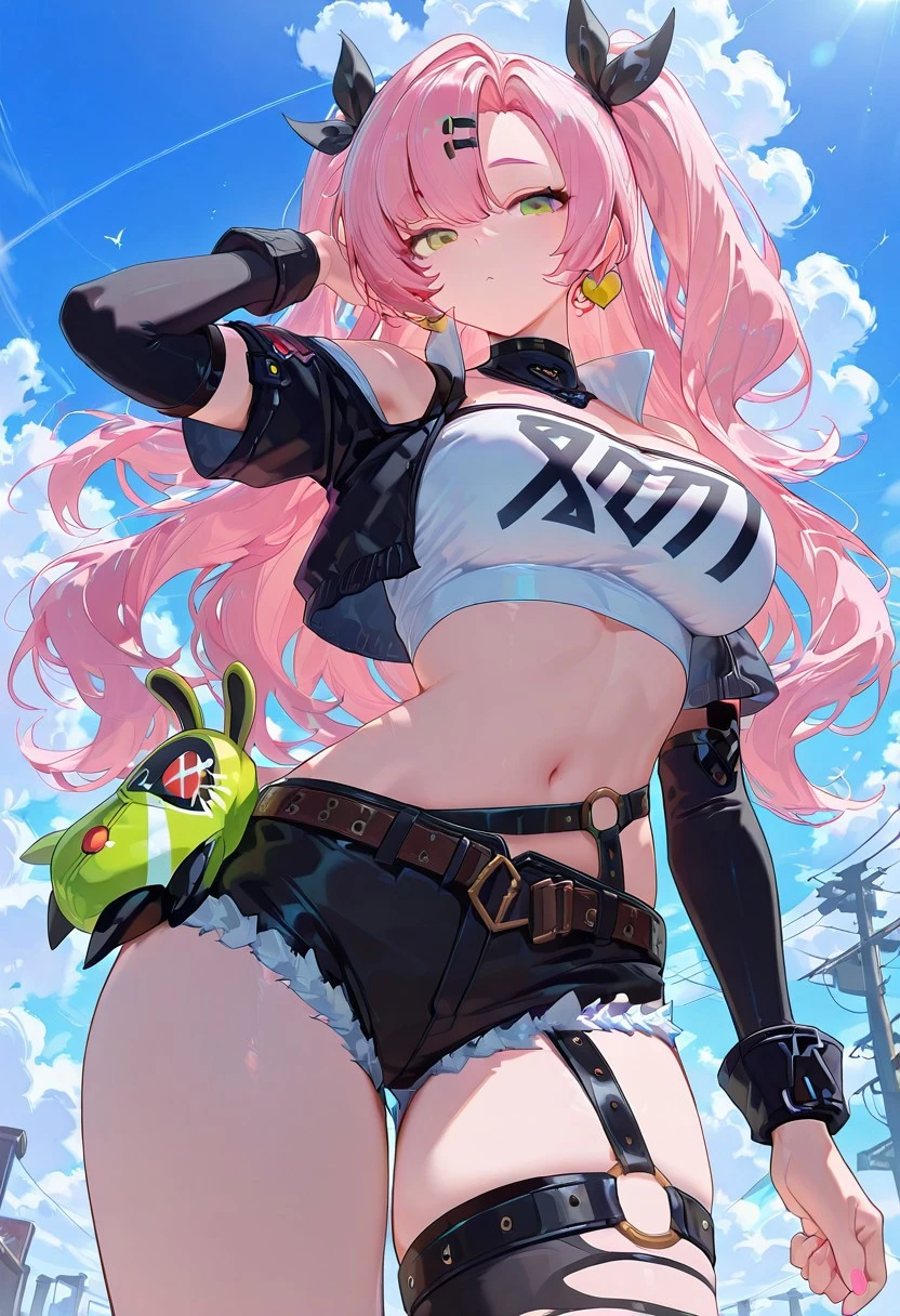 white top, single thighhigh, shorts, cropped jacket, belt boots, single sock, high belt, thigh strap, detached sleeves
