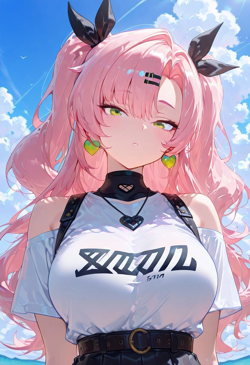 nicldmra, Green eyes, pink hair, long hair, asymmetrical bangs, large ,two side ups