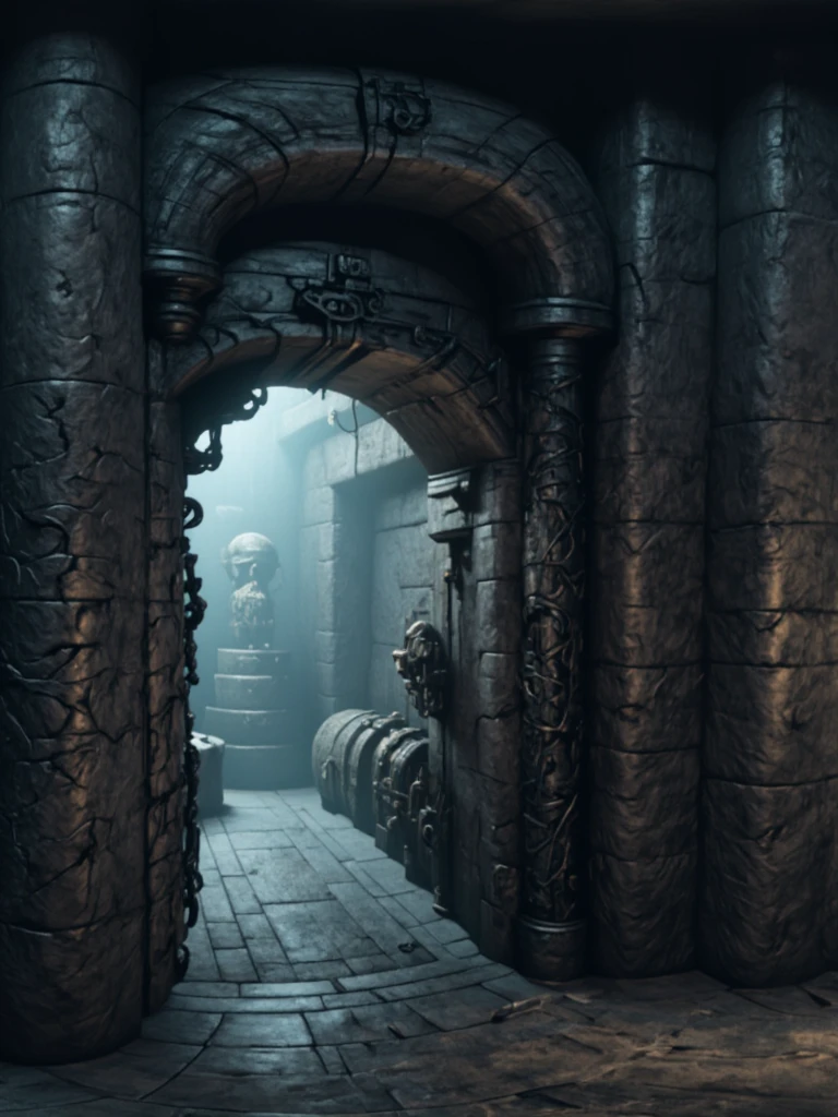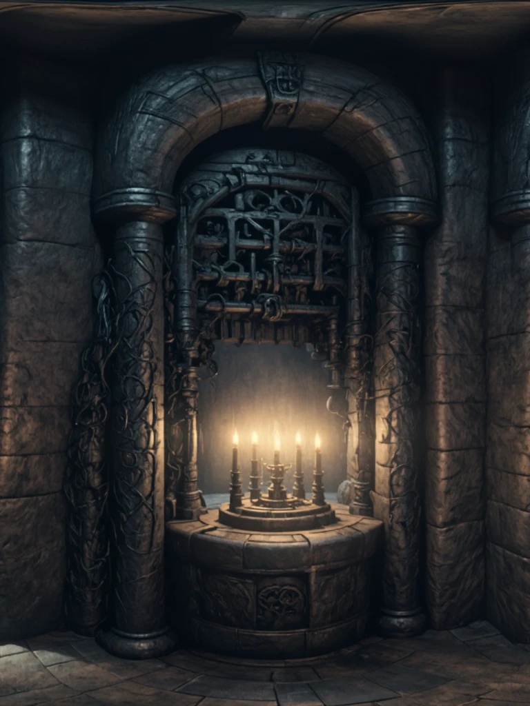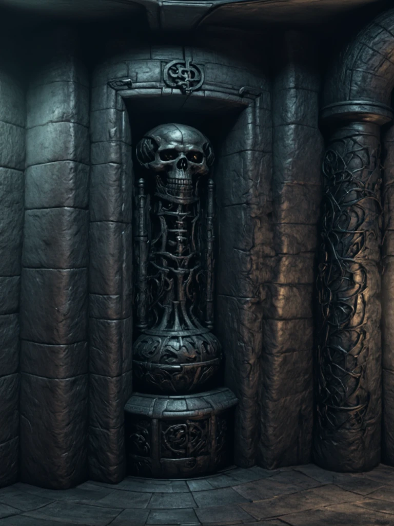 Alien Dungeon Interior, ancient subterranean stone crypt with massive weathered arches and thick cylindrical pillars carved from dark basalt and limestone, eroded by centuries of moisture and age. The environment forms a labyrinthine ritual chamber with branching corridors, cracked flagstone flooring and embedded circular ancient sacrificial platform. Surfaces are covered with alien-organic engravings, skeletal reliefs, and biomechanical ornamentation blending gothic ruin with extraterrestrial architecture. Lighting is low-key cinematic: primary illumination from clustered ritual candles on a central altar emits warm amber volumetric glow, contrasting with cold blue ambient fog light entering through distant tunnel opening. Secondary practical lights include faint wall lamp with pale cyan emission. On the left side, inside a recessed stone alcove niche, stands a tall monolithic funerary structure topped with an elongated humanoid skull relic, mounted on an ornate alien pedestal, appearing ceremonial and ancient, possibly serving as a ritual guardian totem or ossuary monument, with dark polished stone and biomechanical carvings integrating it into the surrounding architecture. Adjacent to the central candle-lit altar stands a low circular ancient stone sacrificial platform, engraved with worn concentric ritual patterns and radial carvings, slightly elevated from the surrounding cracked flagstone floor, appearing as a dedicated sacrificial structure integrated into the chamber’s ancient mechanism system. Atmosphere is dense with dust, humidity haze, and faint mist pooling near the floor. Color palette: desaturated stone gray, oxidized bronze, cold teal shadows, warm gold highlights. Mood is ominous, sacred, abandoned, ritualistic, and ancient cosmic horror.