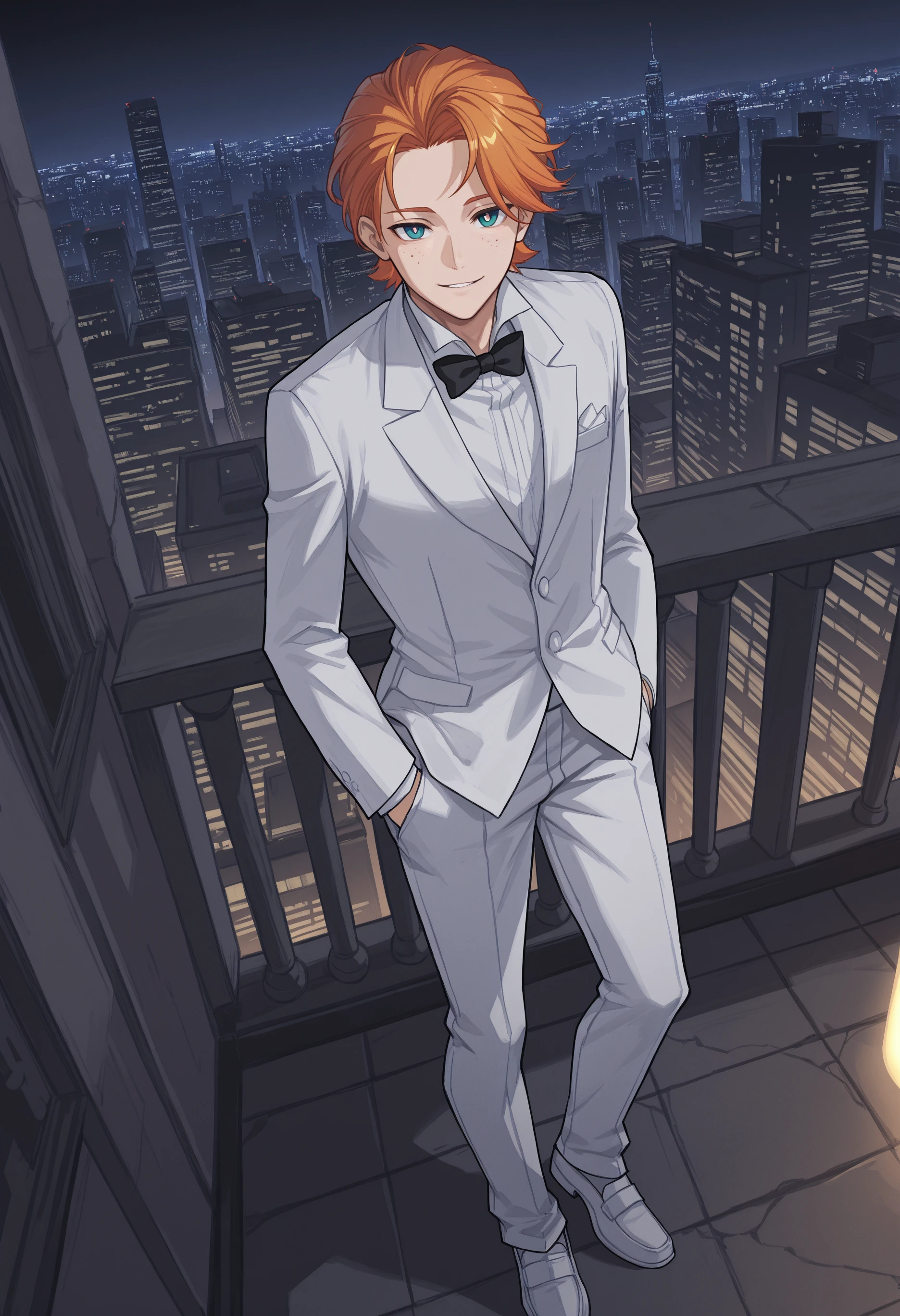 FORBR, official alternate costume, black traditional bowtie, popped collar, white dress shirt, white suit jacket, white dress pants, white loafers,