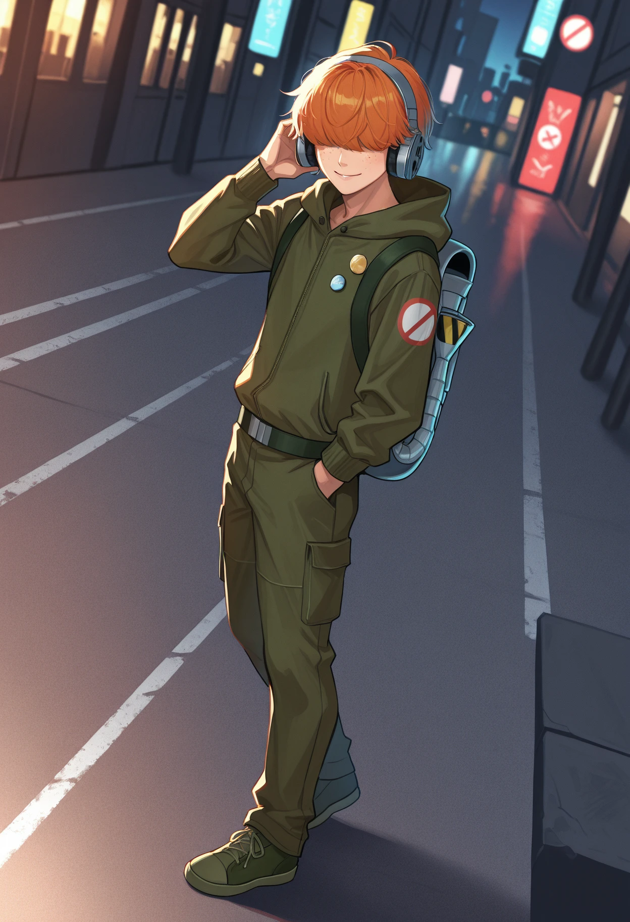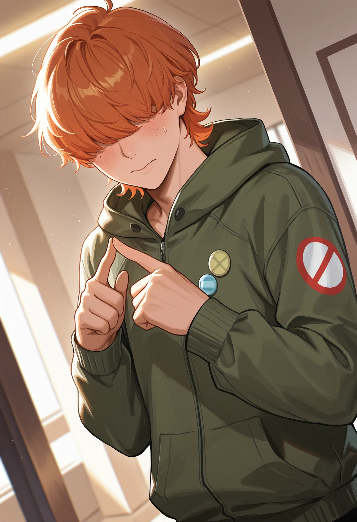 PASWGBR, 1boy, short hair, orange hair, long bangs, hair over eyes, covered eyes, freckles,