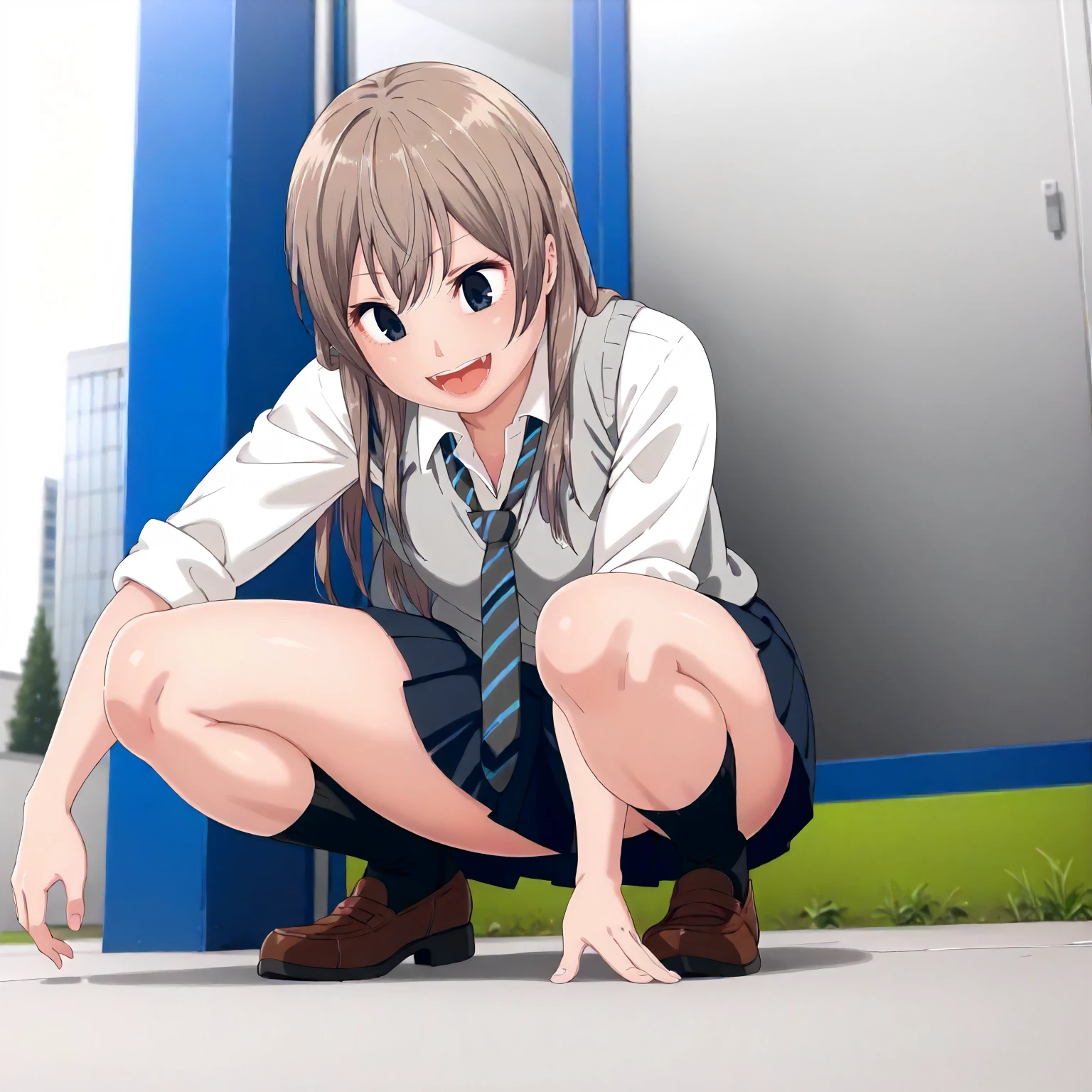 school_uniform,loose tie,gray sweater vest,sleeves rolled up, black skirt,pleated_skirt,miniskirt,
