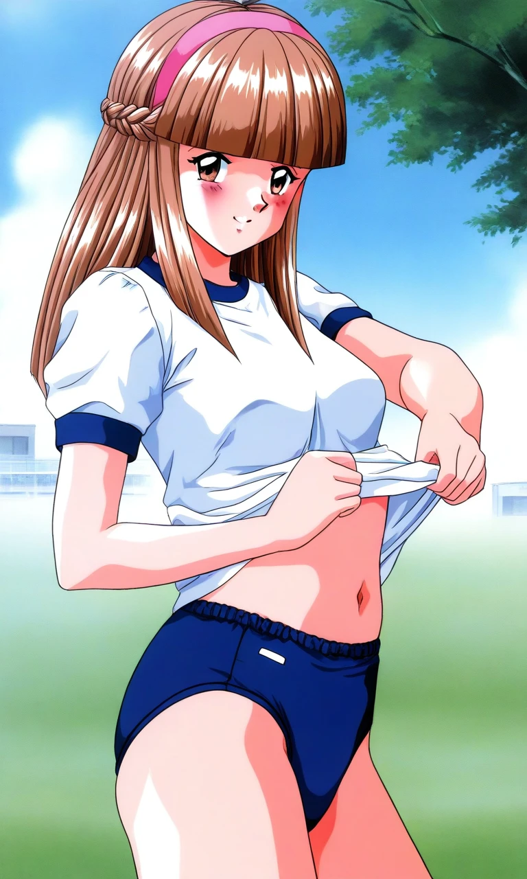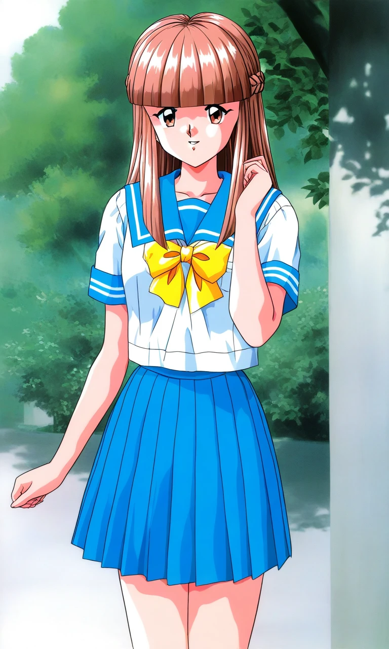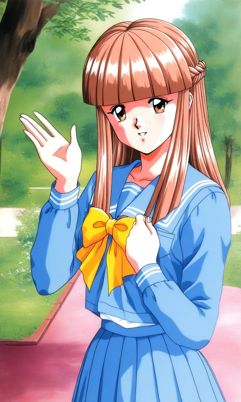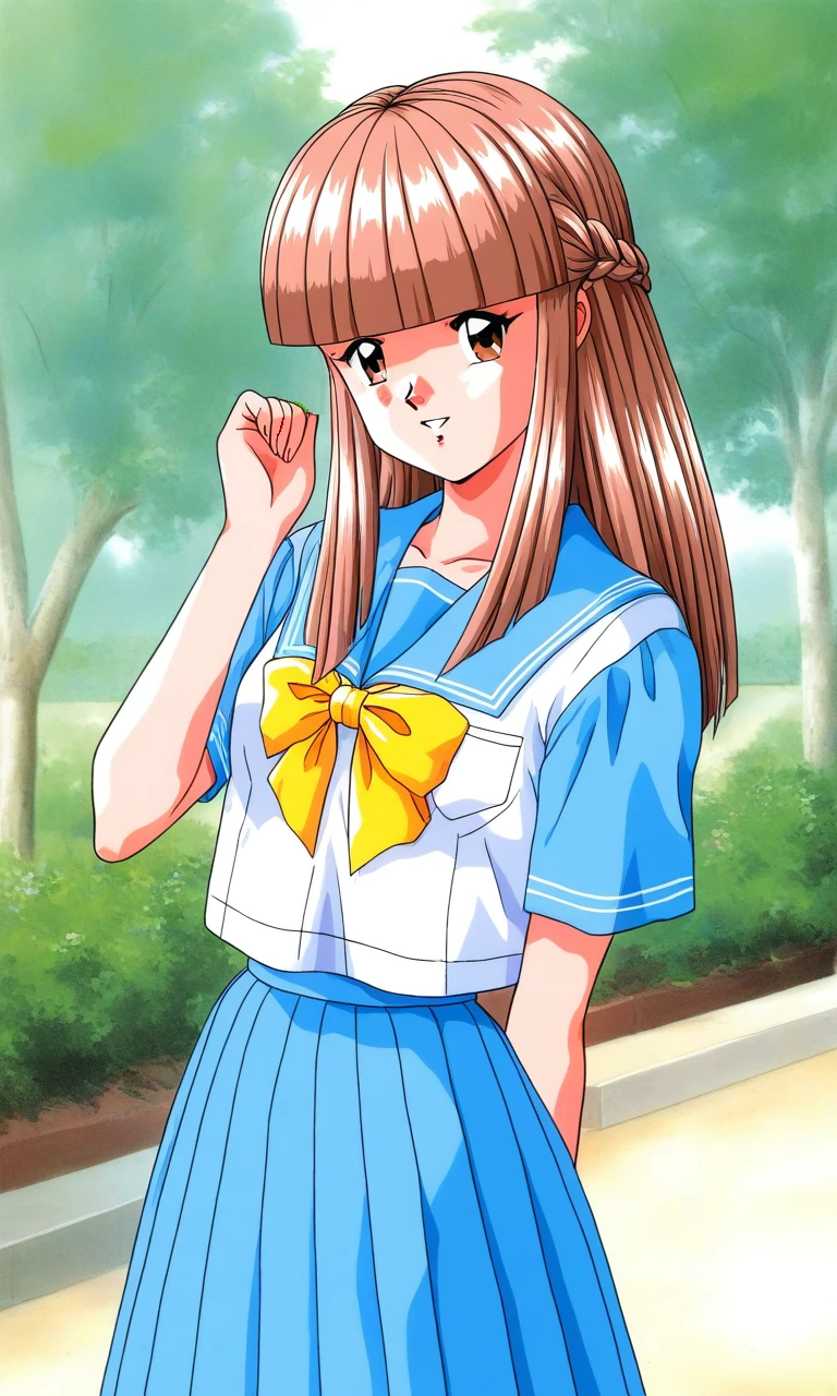 Mikihara_Megumi(Tokimeki_Memorial), 1girl, solo, light brown hair, long hair, brown eyes, blunt bangs, braid, flat chest,