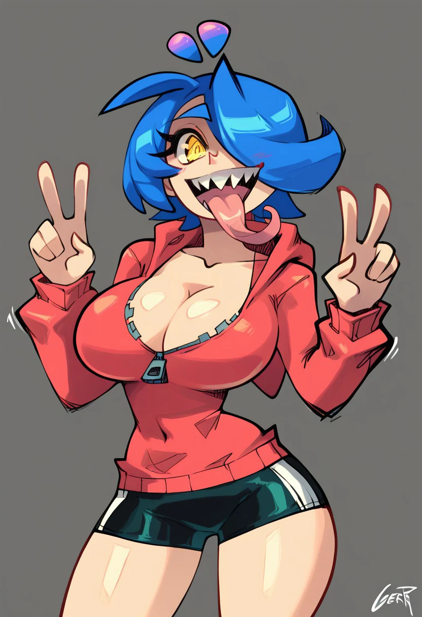 red hoodie, open hoodie, white shirt, black shorts, short shorts, curvy, red footwear