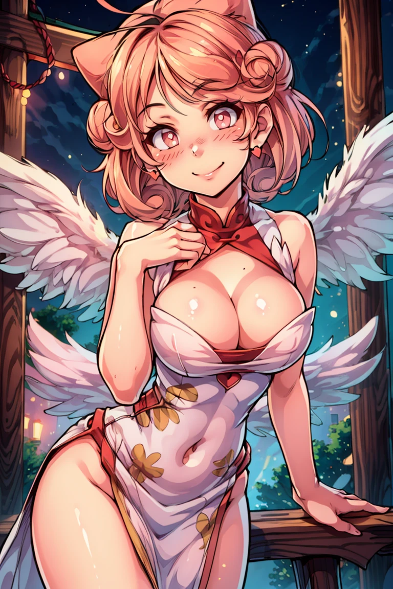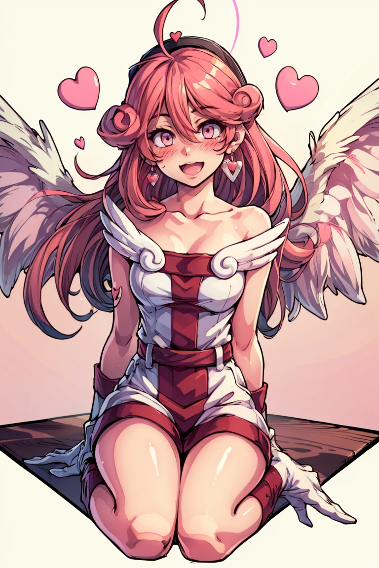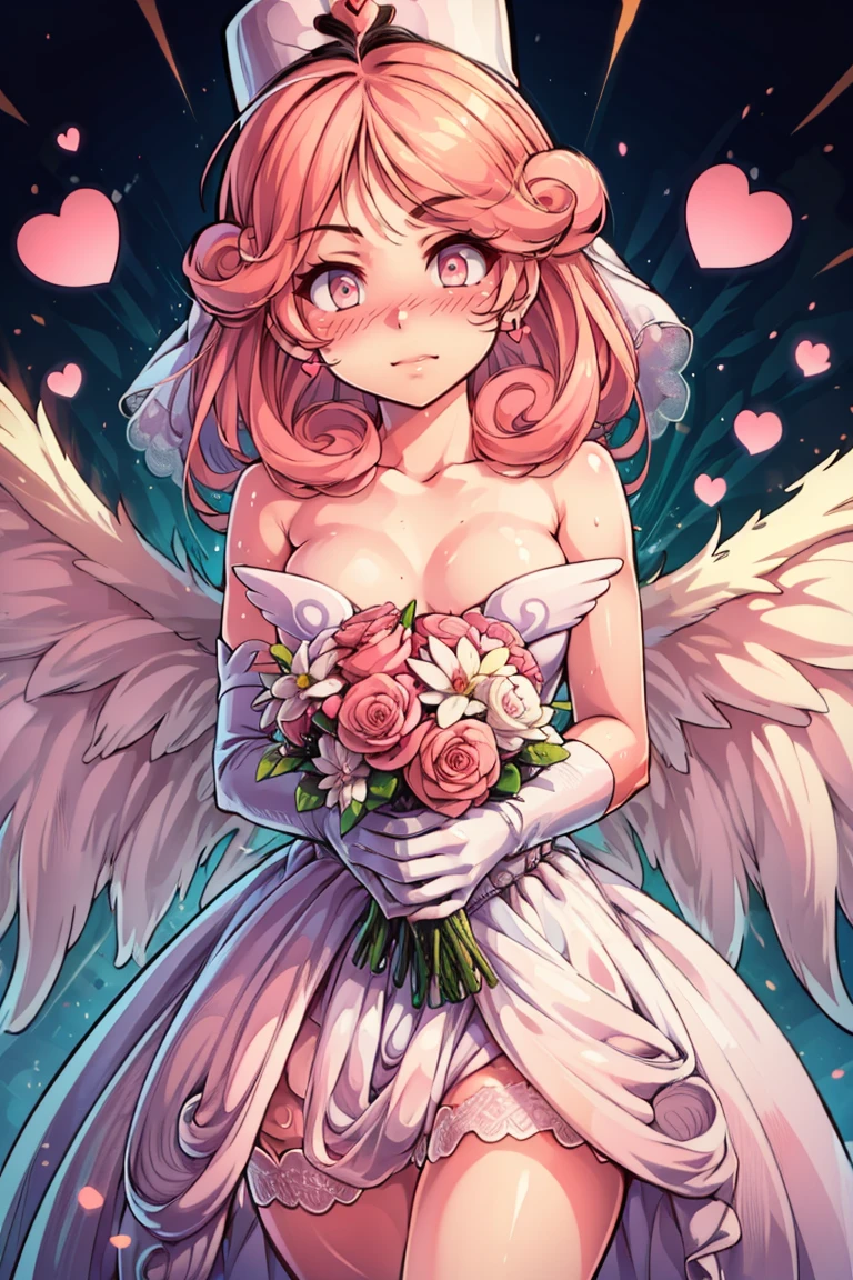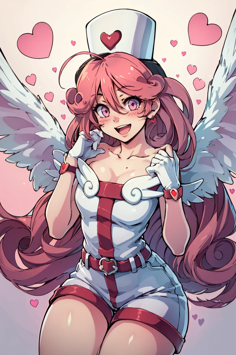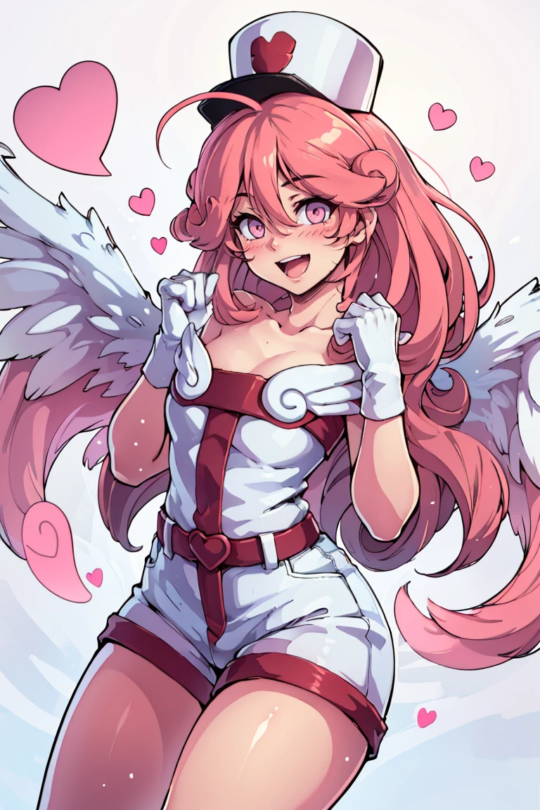 injection fairy lily, pink eyes, angel wings, bare shoulders, belt, blush, collarbone, duel monster, gloves, hair between eyes, hands up, heart, long hair, nurse cap