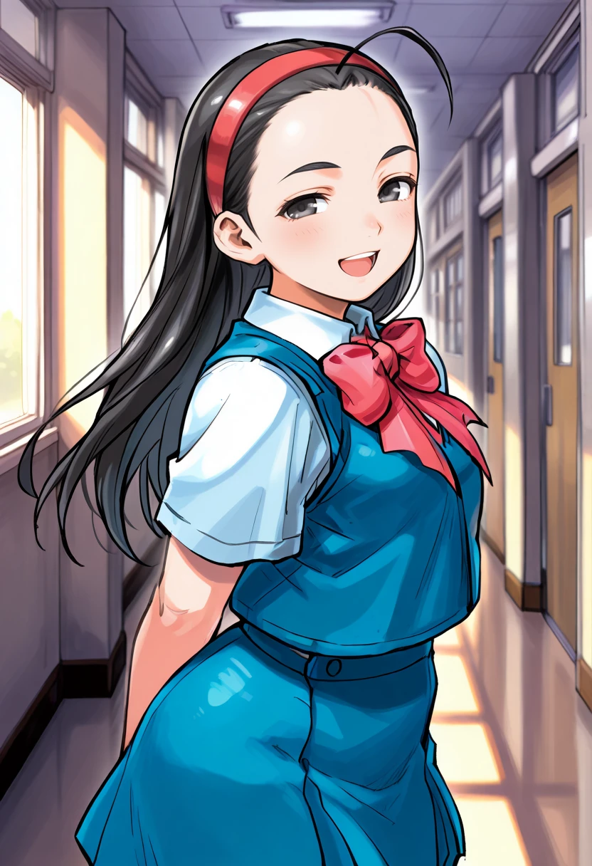 school uniform, blue vest, short sleeves, red bowtie, blue skirt, red hairband, forehead, black hair, long hair, black eyes