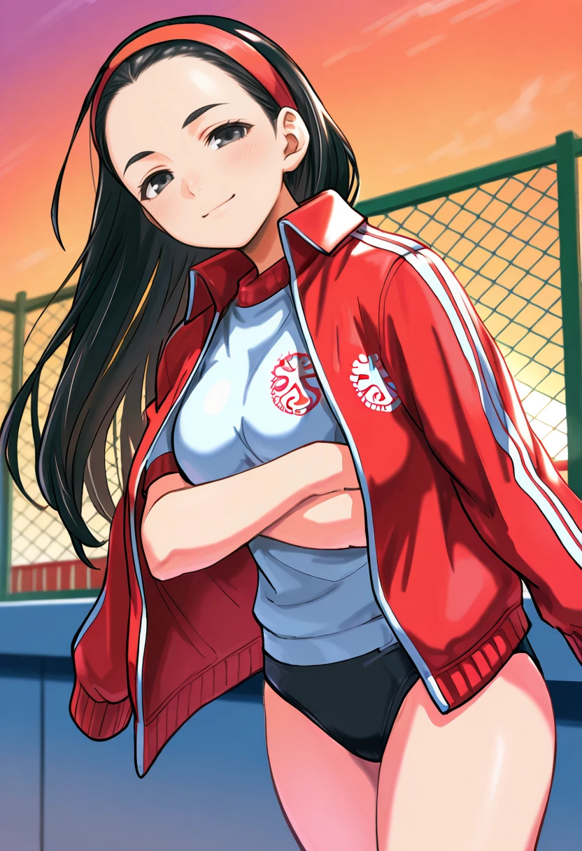 red gym uniform, open jacket, white shirt, emblem, black buruma, red hairband, forehead, black hair, long hair, black eyes
