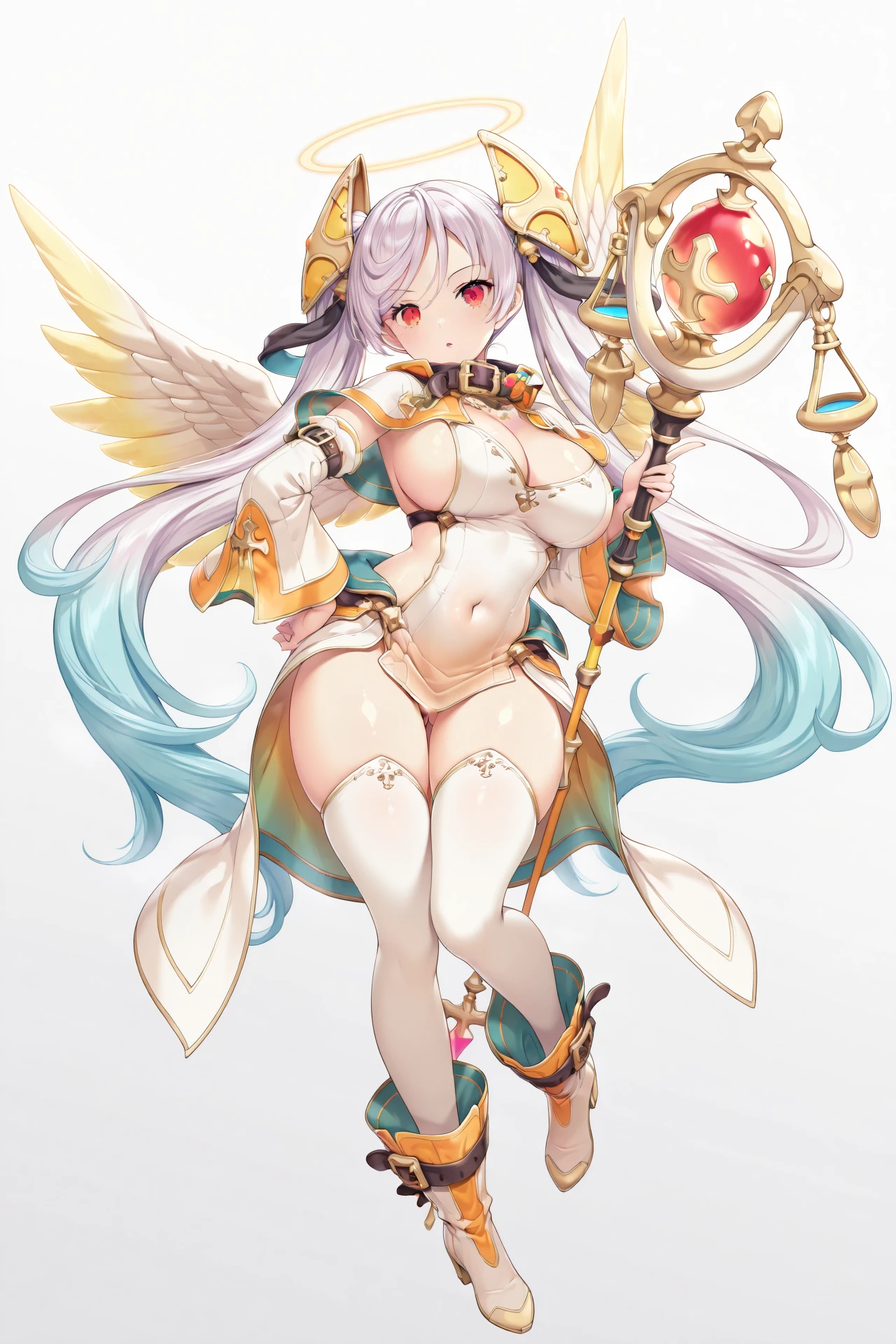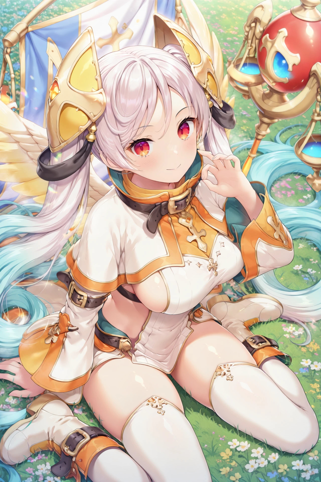 michaelclover, 1girl, solo, sitting, thighhighs, wariza, red eyes, twintails, long hair, breasts, smile, white thighhighs, flag, multicolored hair, looking at viewer, grass, boots, outdoors, very long hair, gradient hair, white hair, bangs, closed mouth, medium breasts, hair ornament, long sleeves