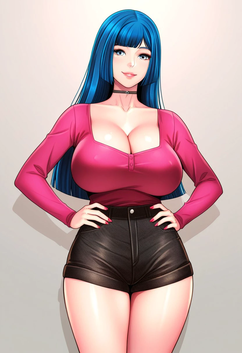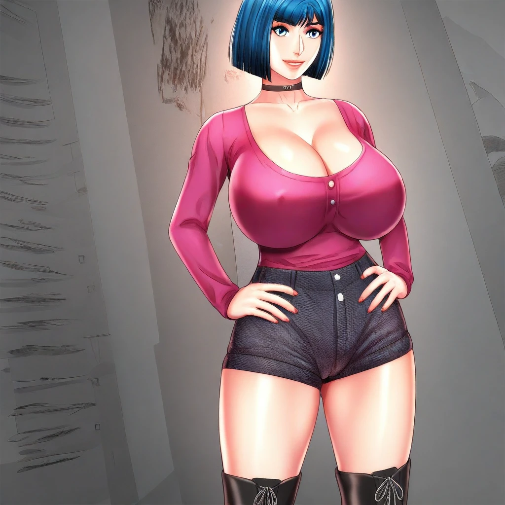 1. ((sexy long-sleeves pink top, obscene cleavage, huge cleavage, black choker, black denim shorts, black high-boots, ))