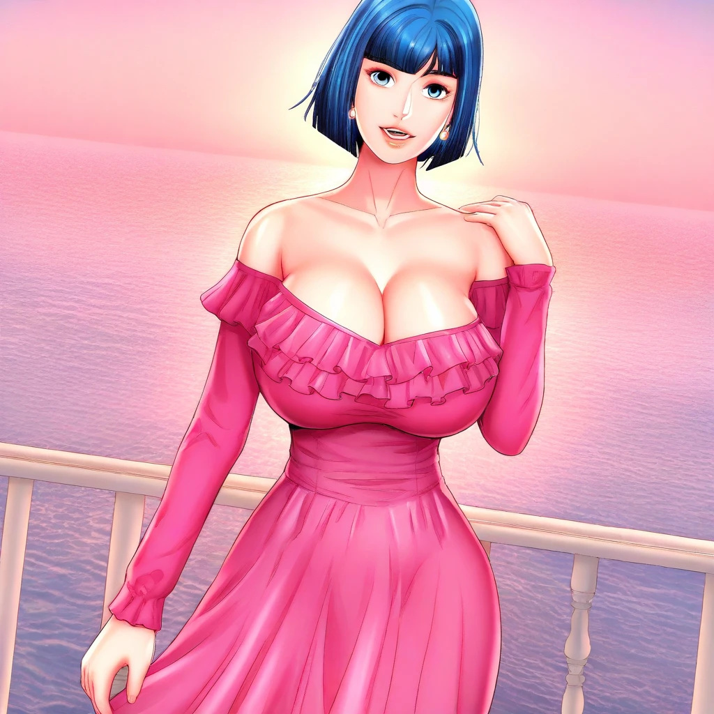 2. ((sexy off-shoulder long-sleeves pink dress with frills, obscene cleavage, huge cleavage, white high-hills, earrings, ))
